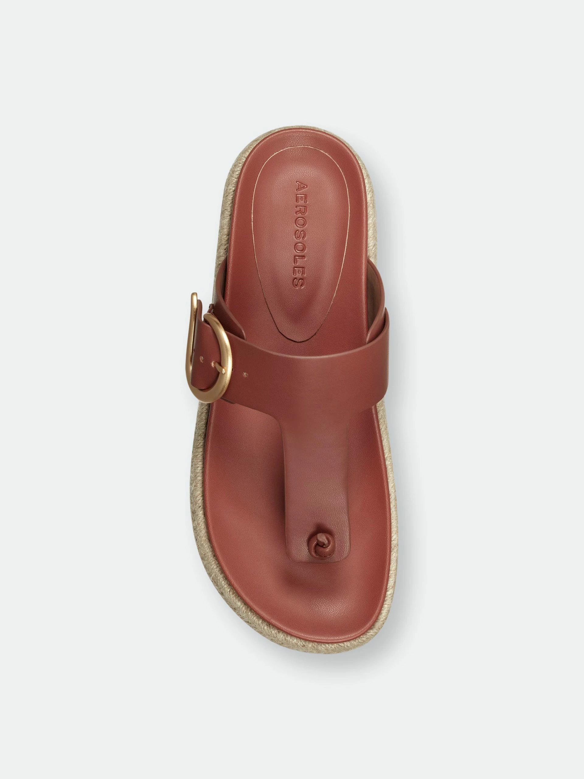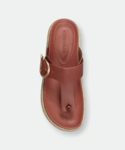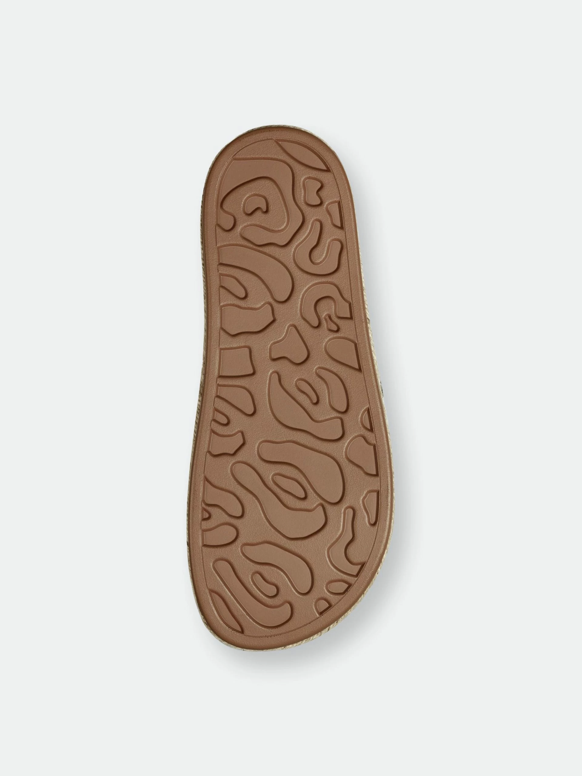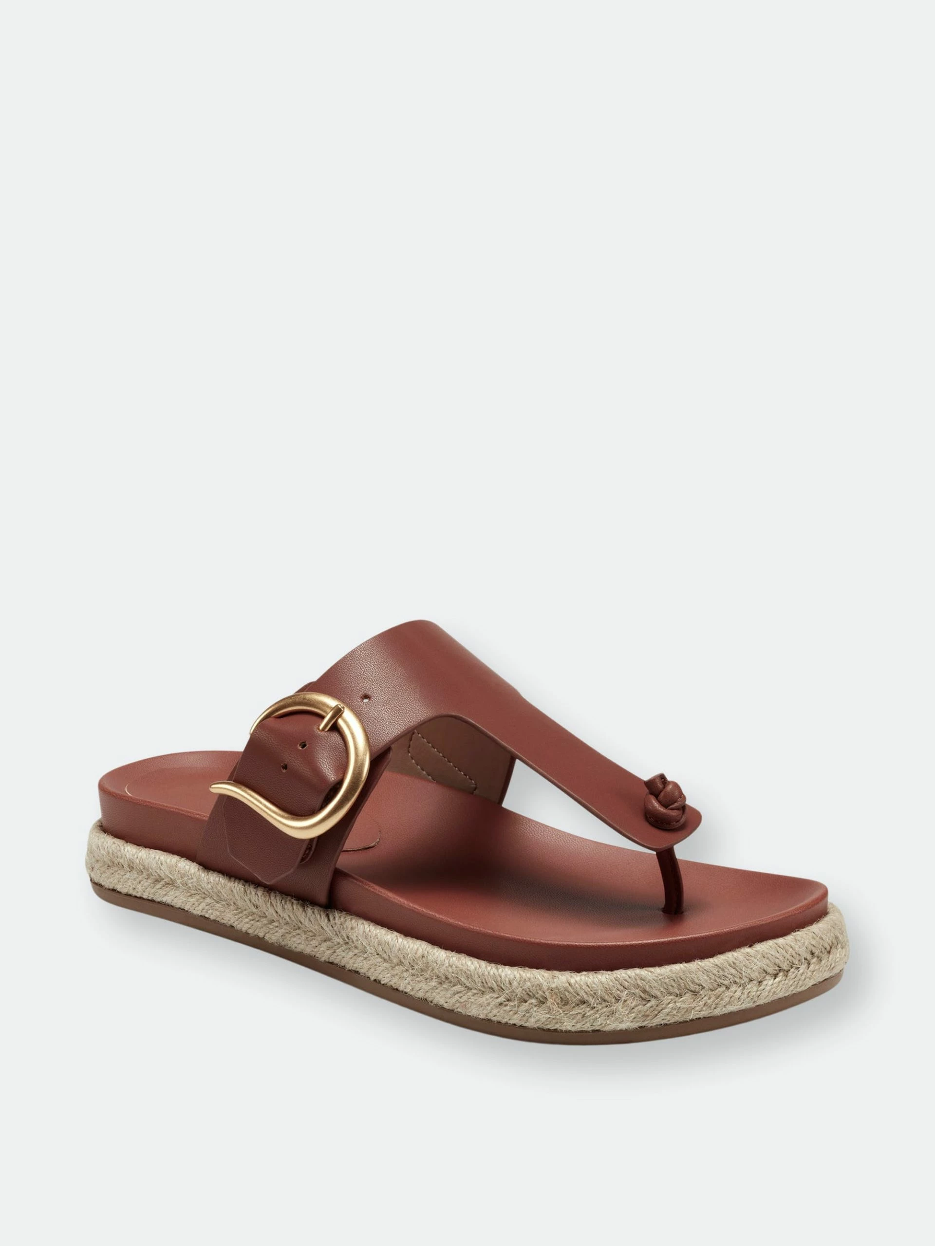 Chic and guilt free. Our slip on espadrille thong sandal is entirely made of non-leather materials. Features a faux leather t-strap upper and espadrille wrapped outsole. The gold buckle adds a touch of luxe.