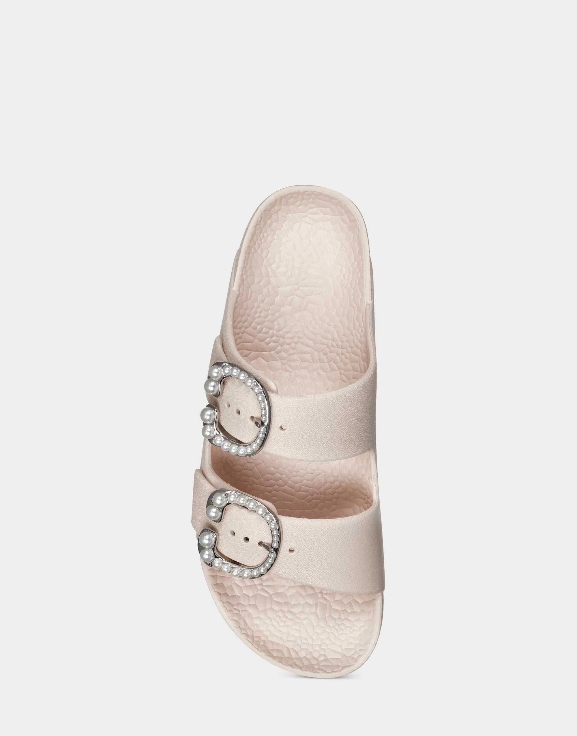 Signature buckles adorned with sparkling crystals make this timeless, trendy and water-resistant molded slide this season’s essential. A molded footbed and slip-on design ensure unlimited comfort and ease of wear, making it a go-to look for your warm weather style.