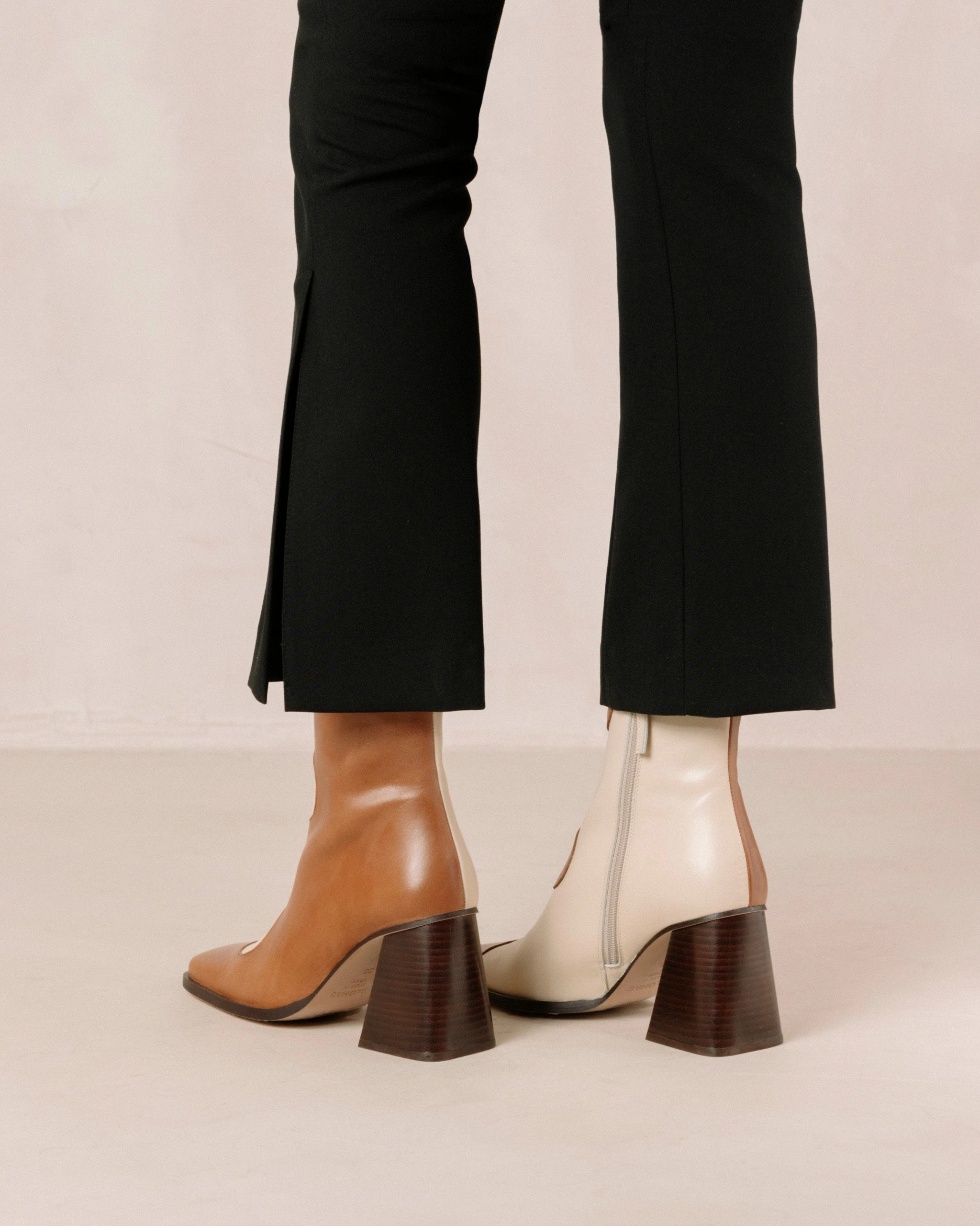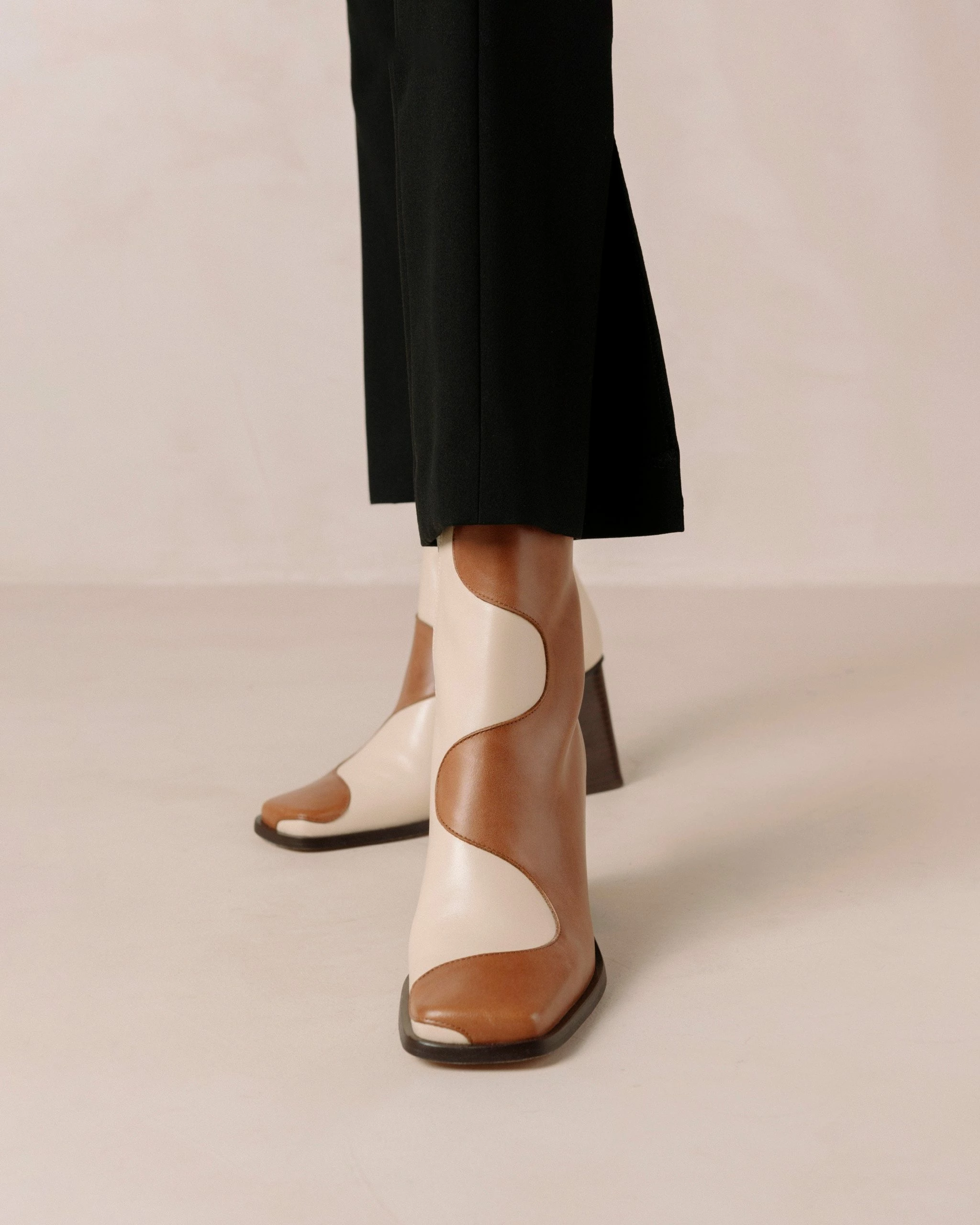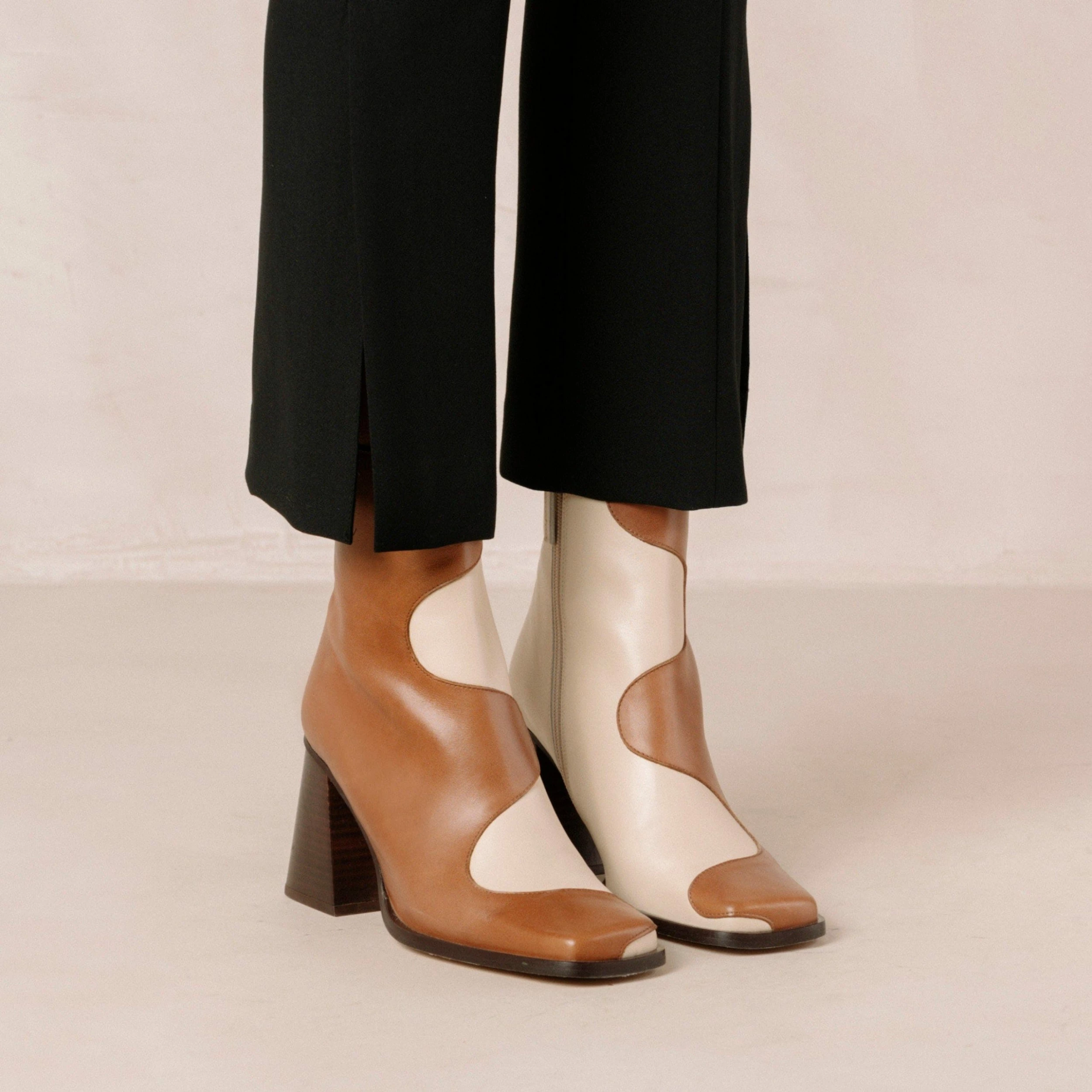 If you want your ankle boots to be versatile, but also feel trendy at the same time, you are in the right place, girl. These two-tone booties are made from black and brown leather stitched into a cool swirly pattern that runs down the front of the shoe. They have a sculptural block heel and side zips so you can pull them on and off with ease. Wear yours with your favourite denims and let them do the talking.
