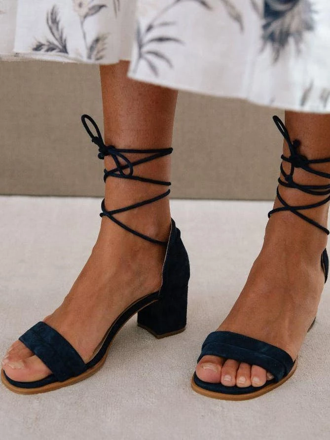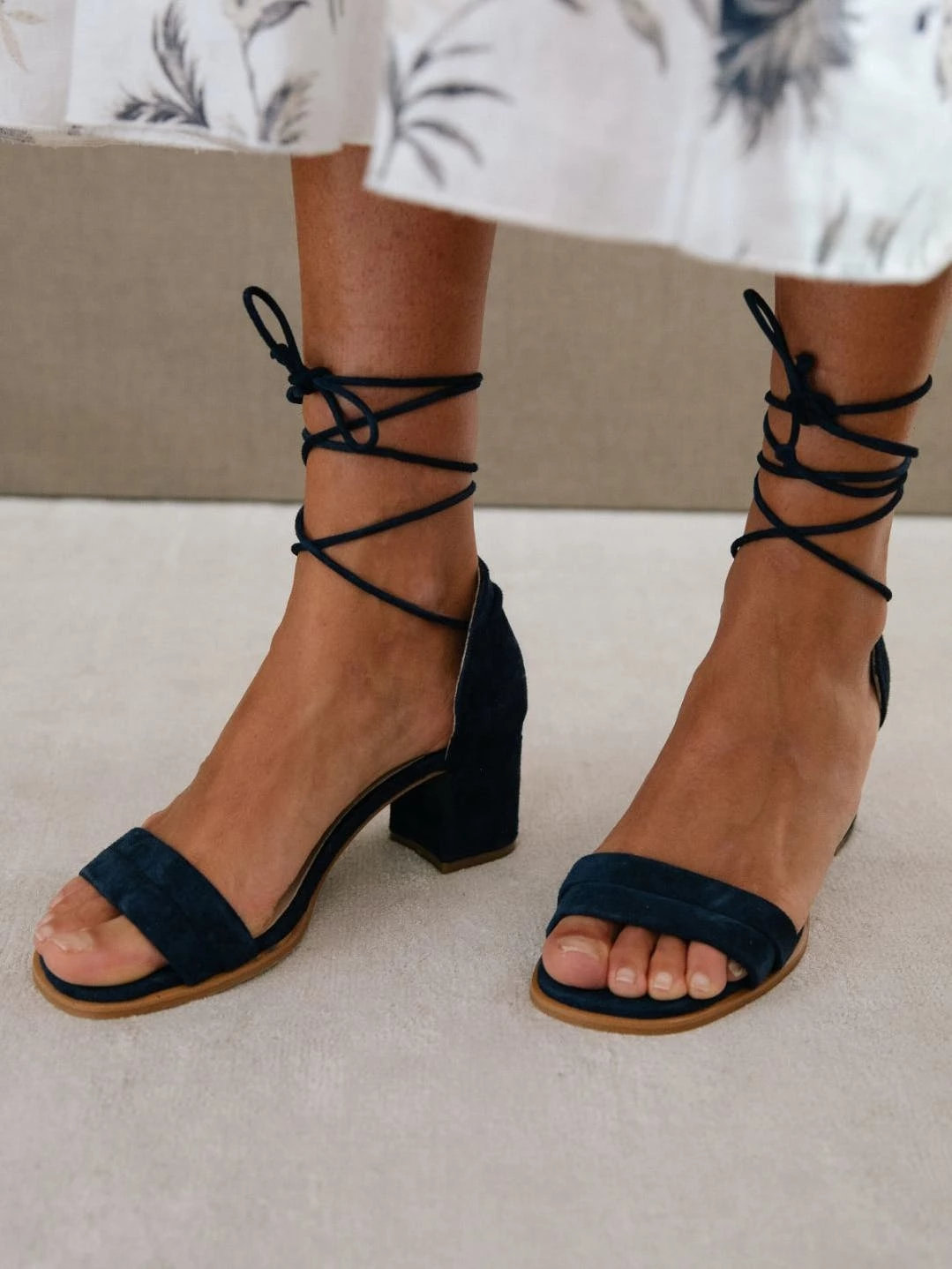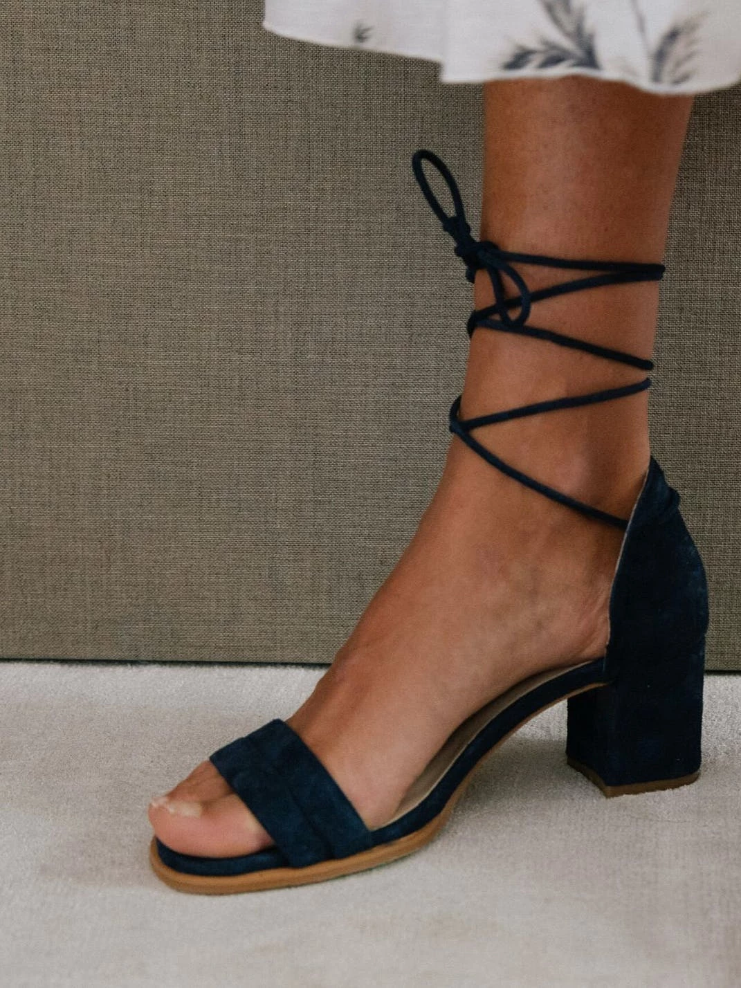 Now available in a color classic – navy. This understated, uncomplicated, mid-heeled, open-toed sandal is simplicity at its finest. Featuring a double front strap and thin wrap around the ankle for a strong hold.