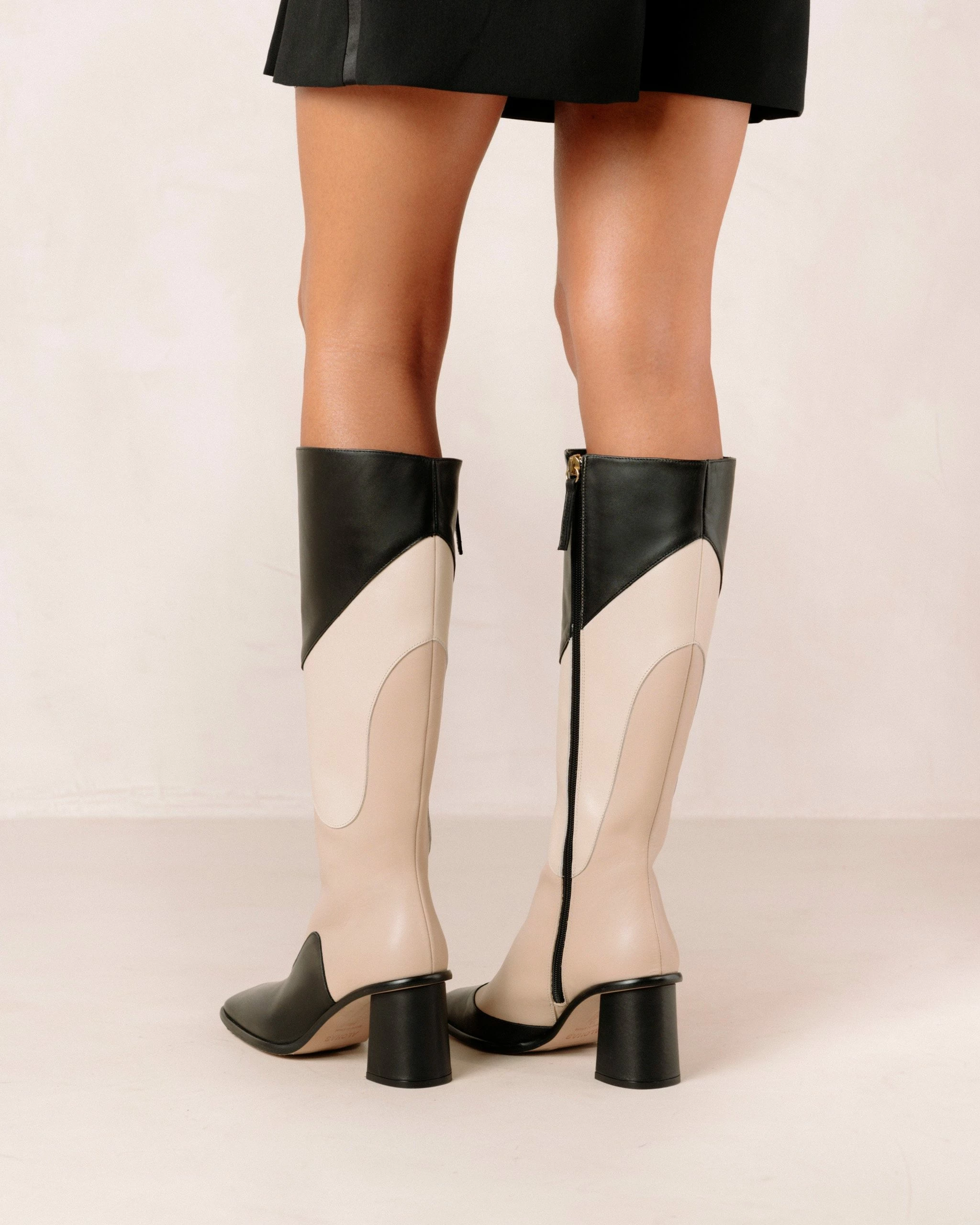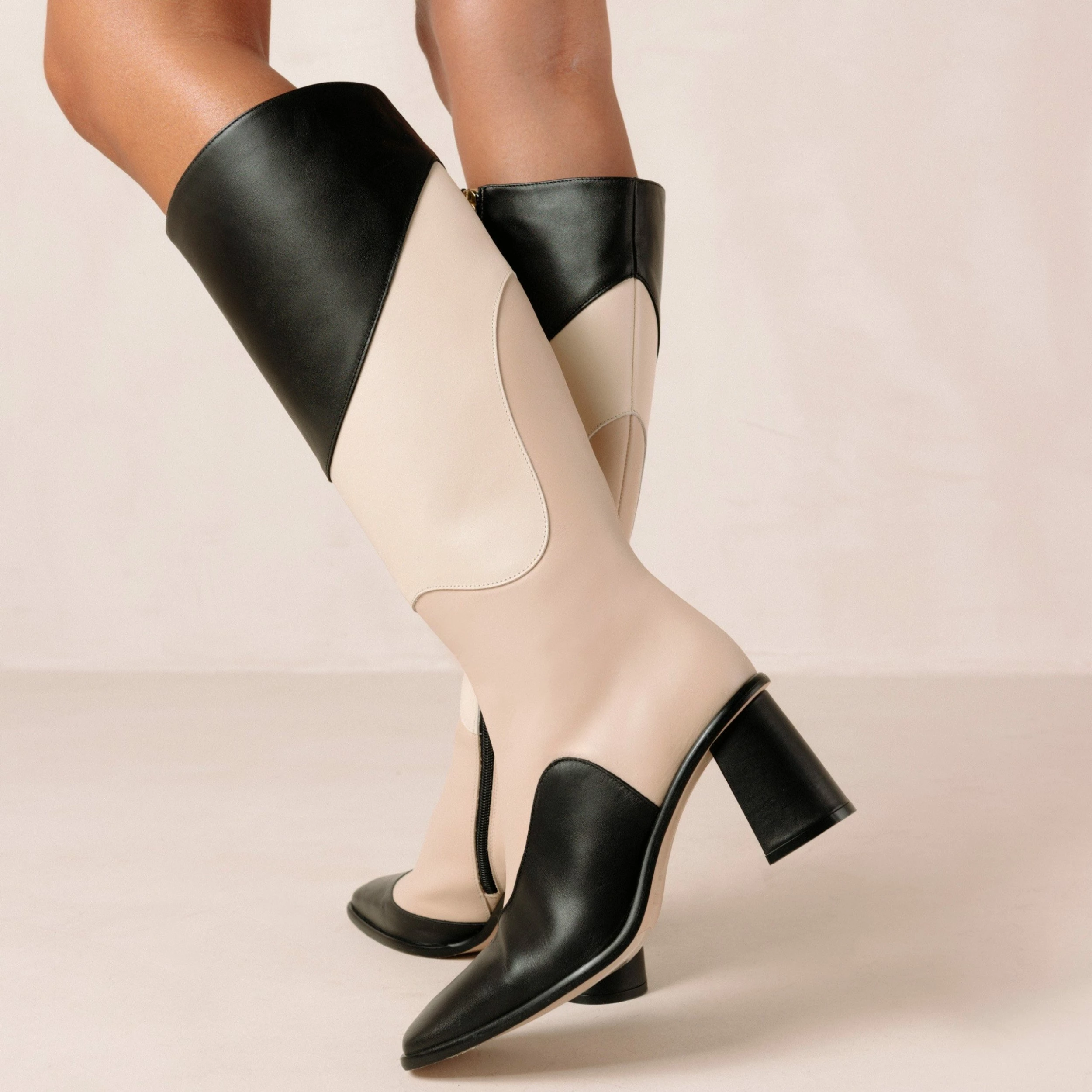 Knee-high boots with a structured, wide cut and chunky block heel. Full length inner side zipper for ease and comfort.