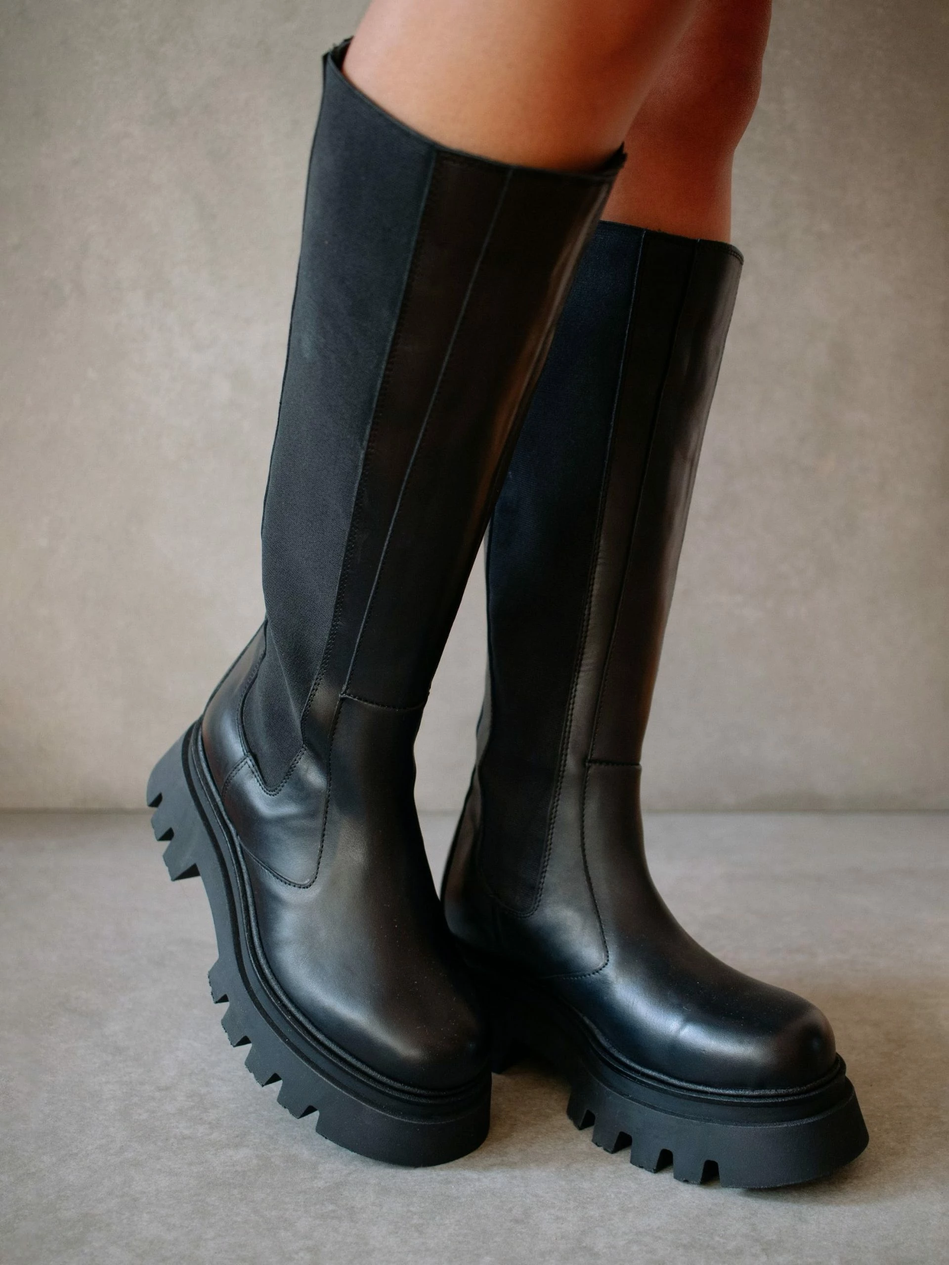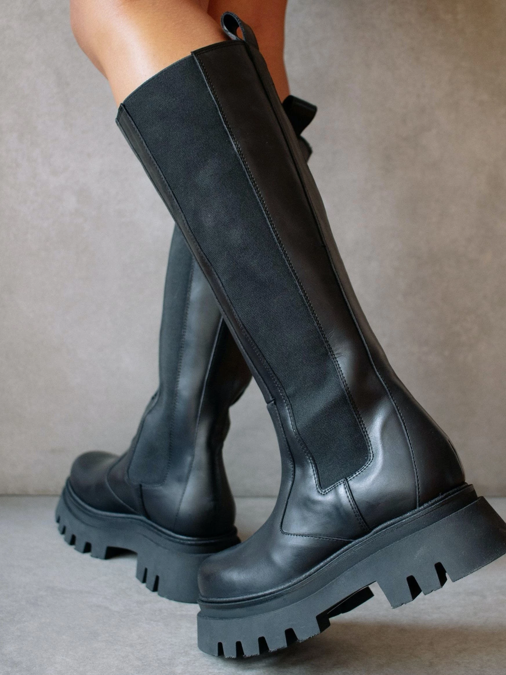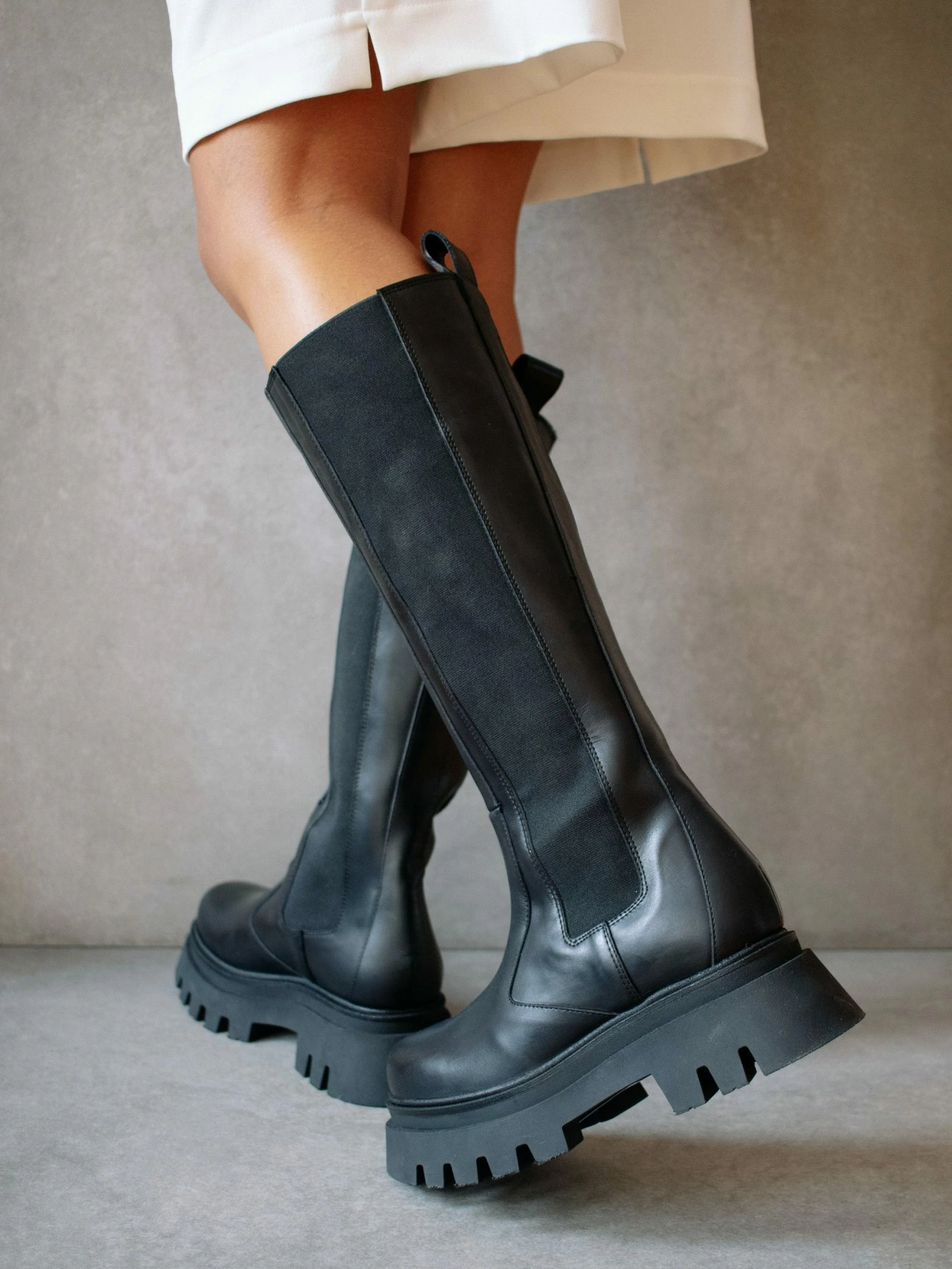 A riding-inspired boot for those who love a little sass. Refined in design yet tough enough to ground even your most feminine dress, these knee-highs are made from white leather with rounded toes and outsized track soles. The elasticated gussets down the side are designed to maximize comfort and easy wear.