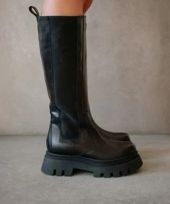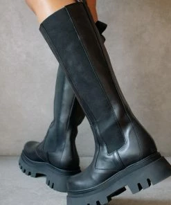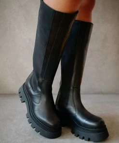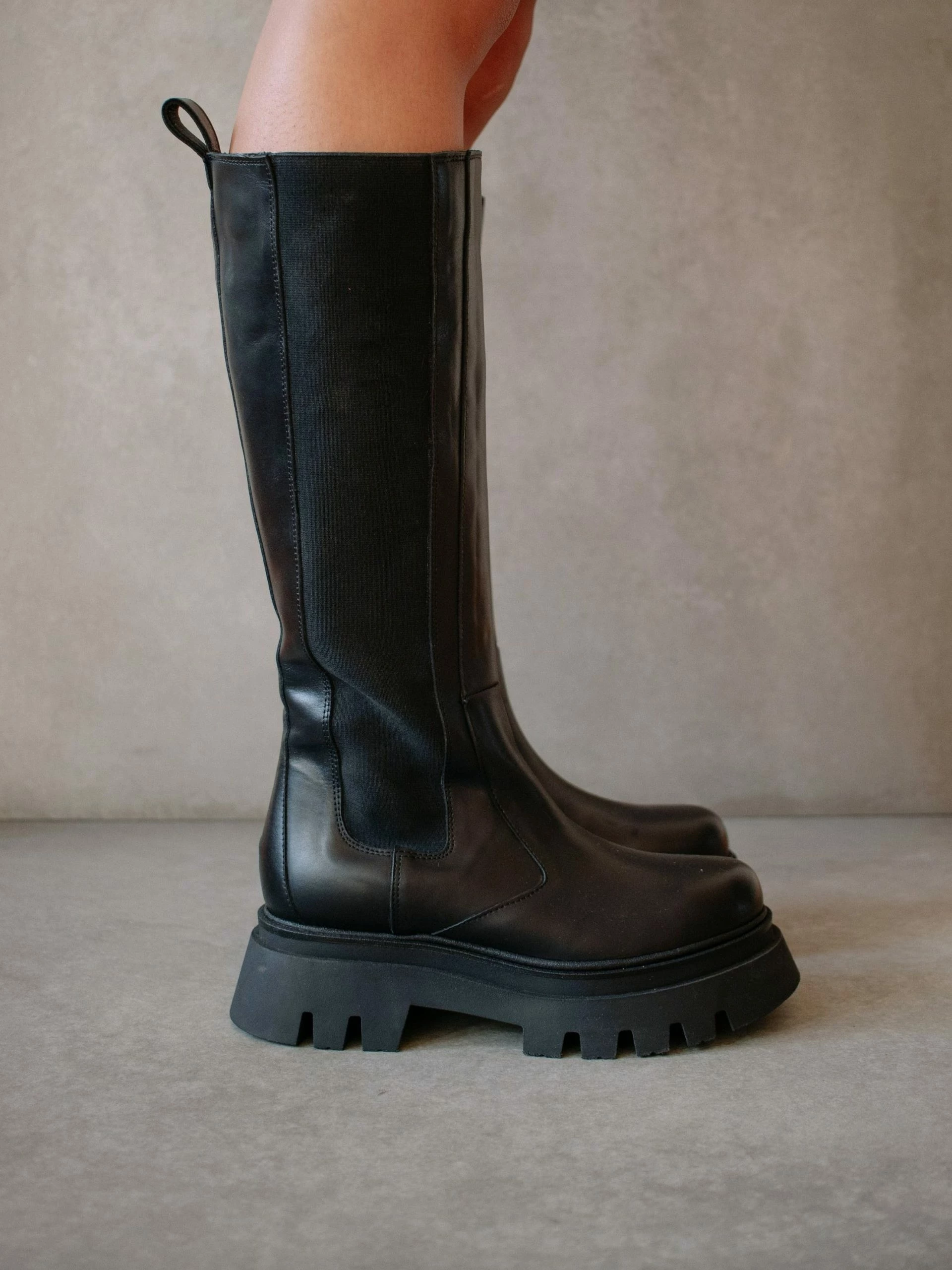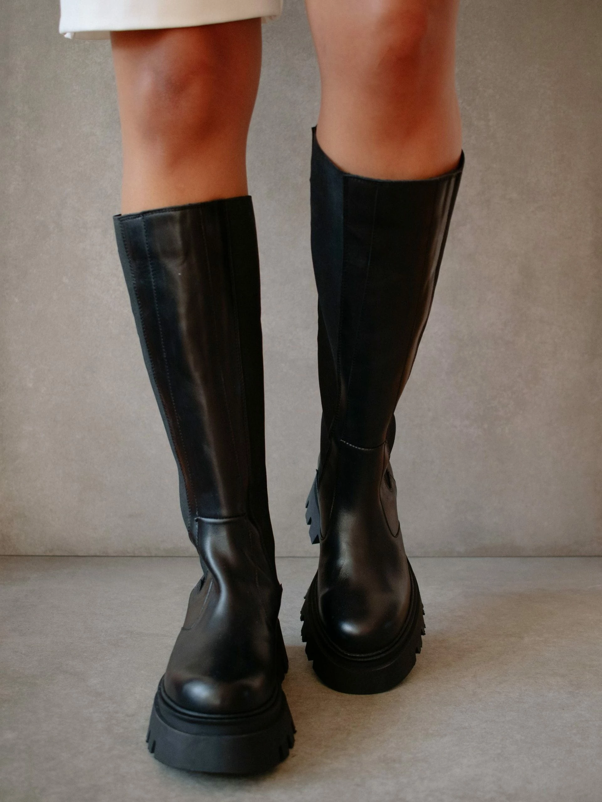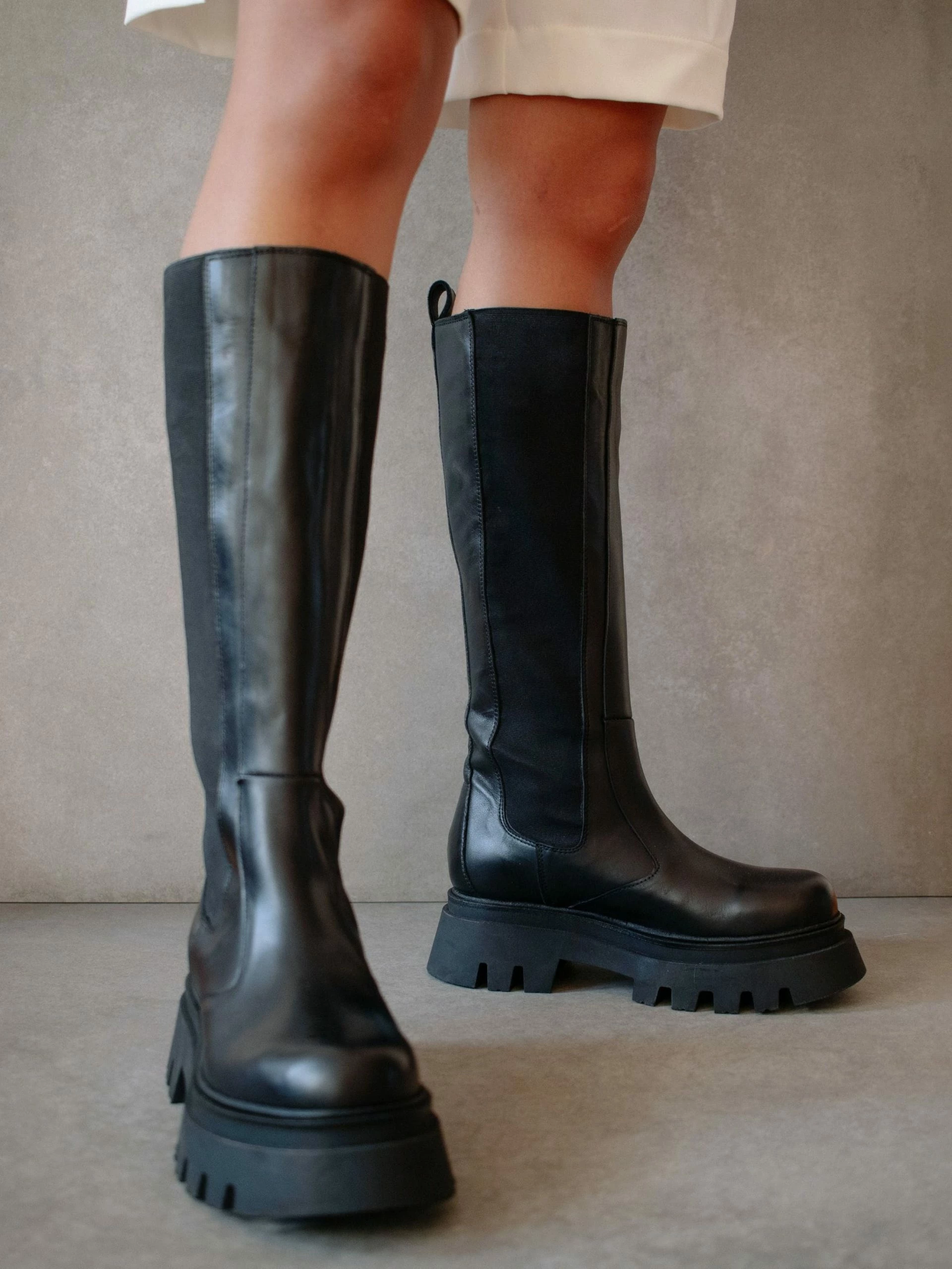 A riding-inspired boot for those who love a little sass. Refined in design yet tough enough to ground even your most feminine dress, these knee-highs are made from white leather with rounded toes and outsized track soles. The elasticated gussets down the side are designed to maximize comfort and easy wear.