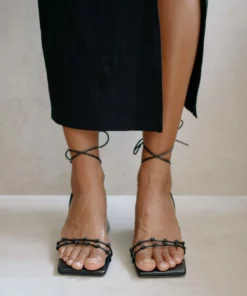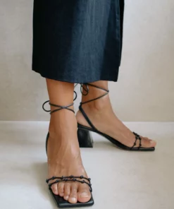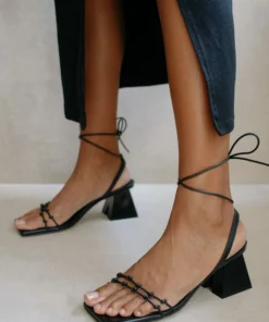 Featuring a thinly knotted double front strap. Open toed, square soled sandal featuring an A-shaped pyramid block heel. Laced up the ankle.