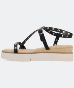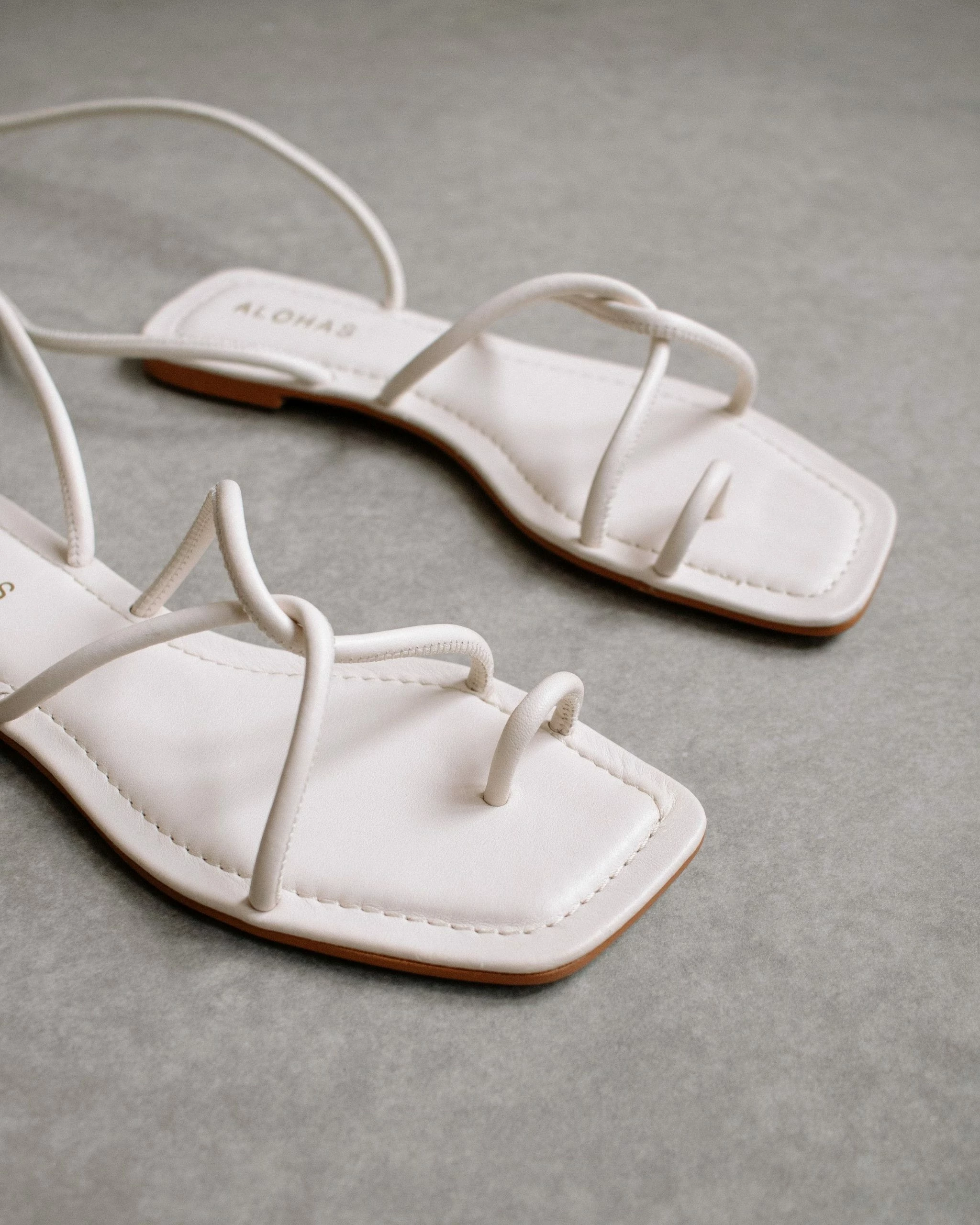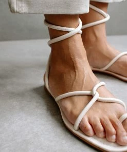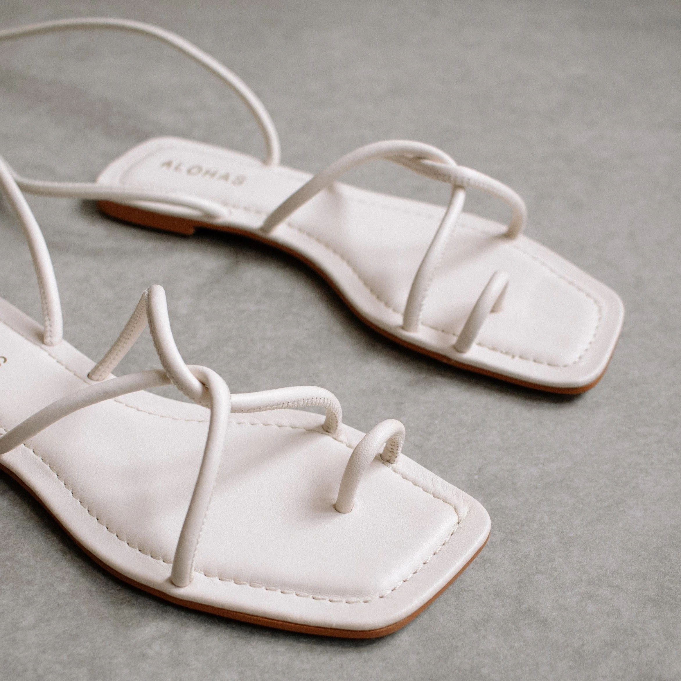 Get on board the “barely there” shoe aesthetic with this flat, strappy sandal. Features a toe ring and criss crosses up the ankle.