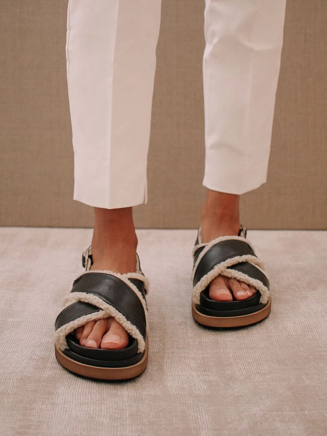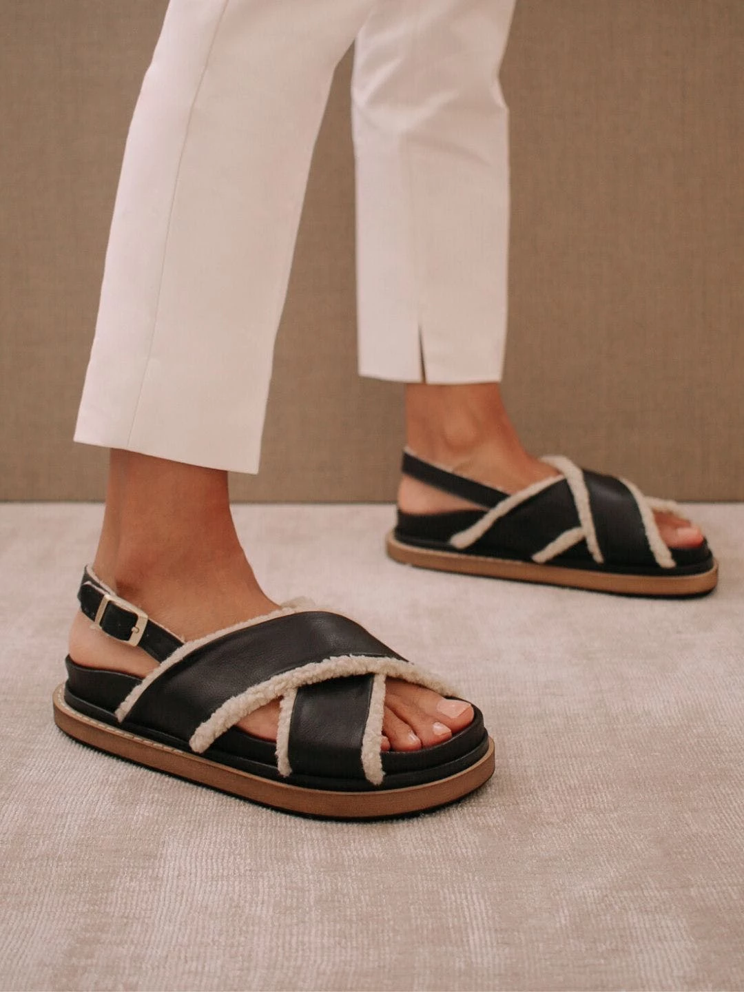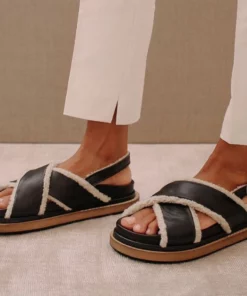 A 90s inspired oversized slipper sandal featuring a maxi double layered sole. Criss-crossed front hold and a buckled back strap for added comfort.