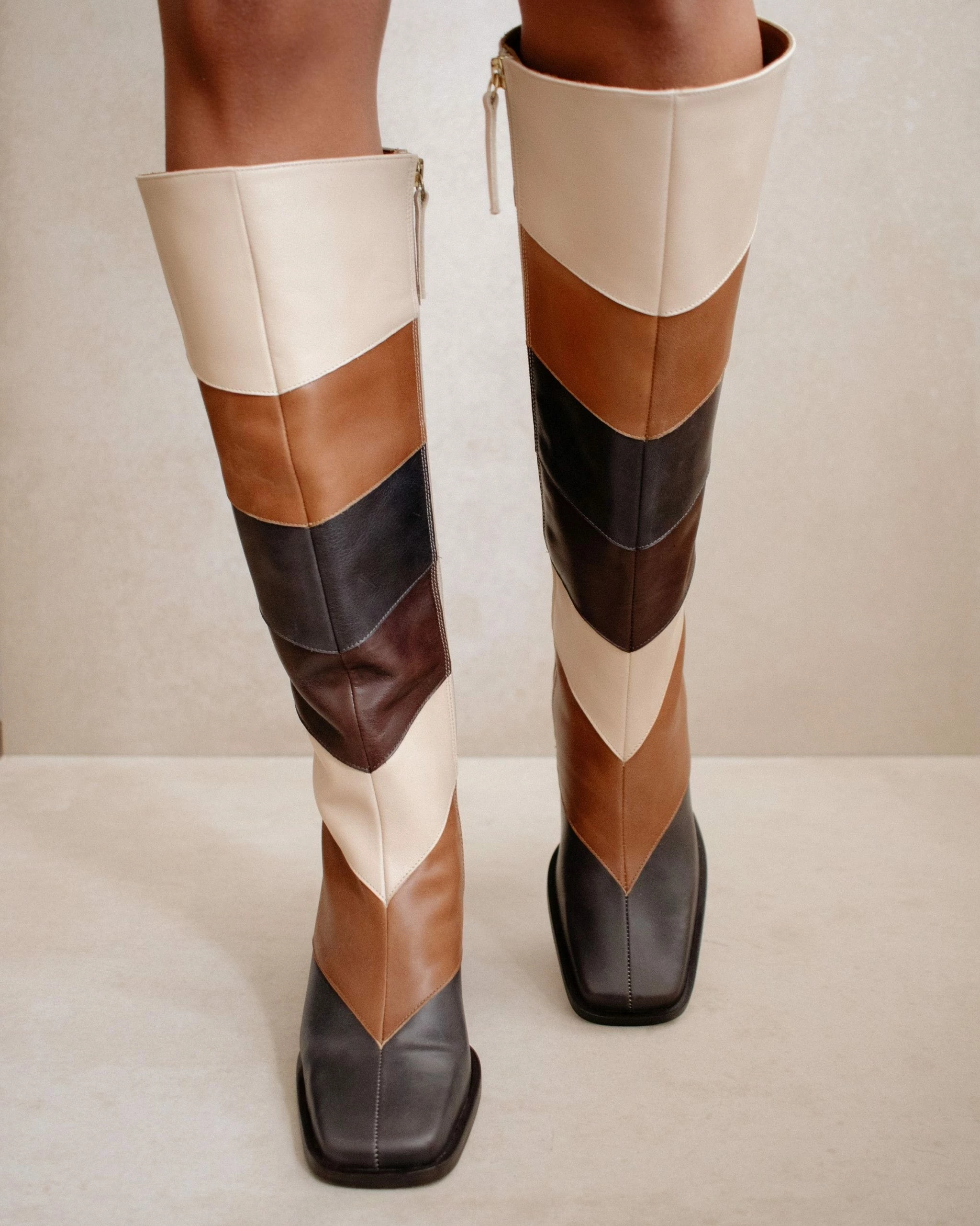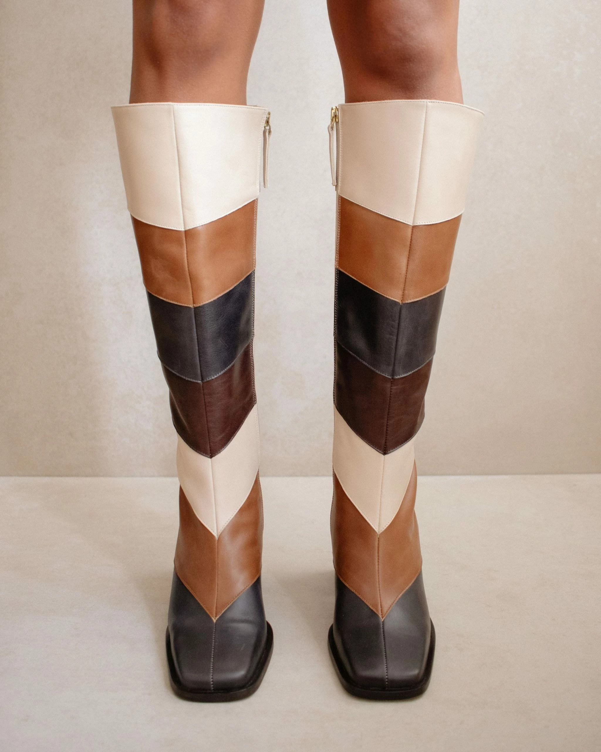 Under the knee boots with a structured, wide cut and chunky block heel. Full length inner side zipper for ease of use.