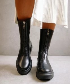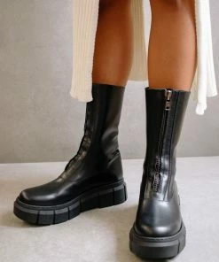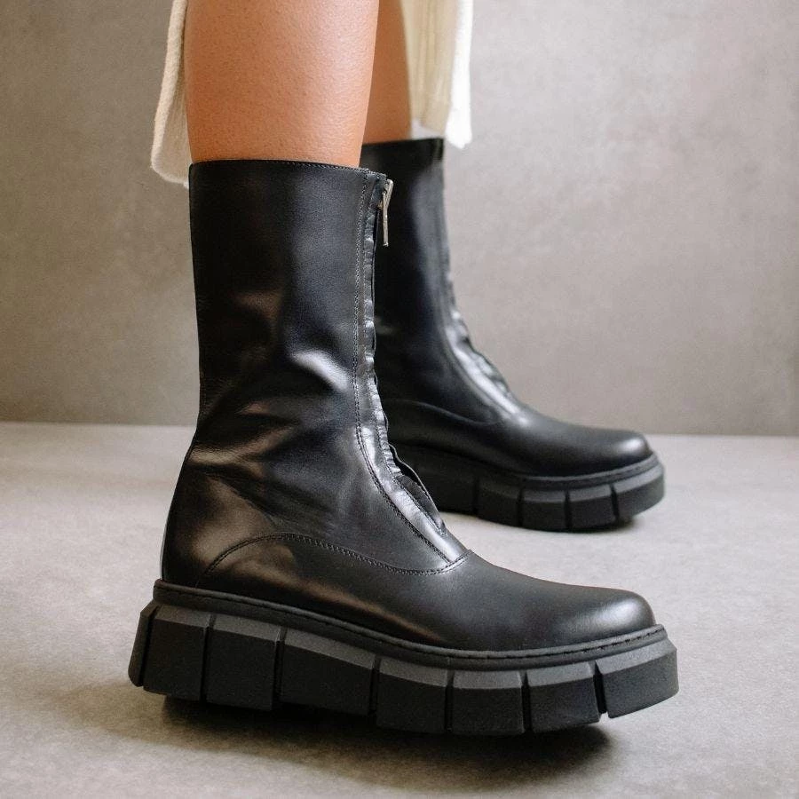 Sleek combat-style boots with a chunky platform, featuring a front zipper and visible lining.