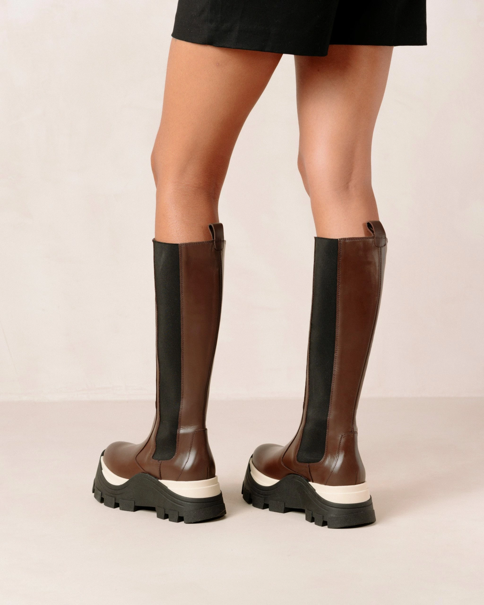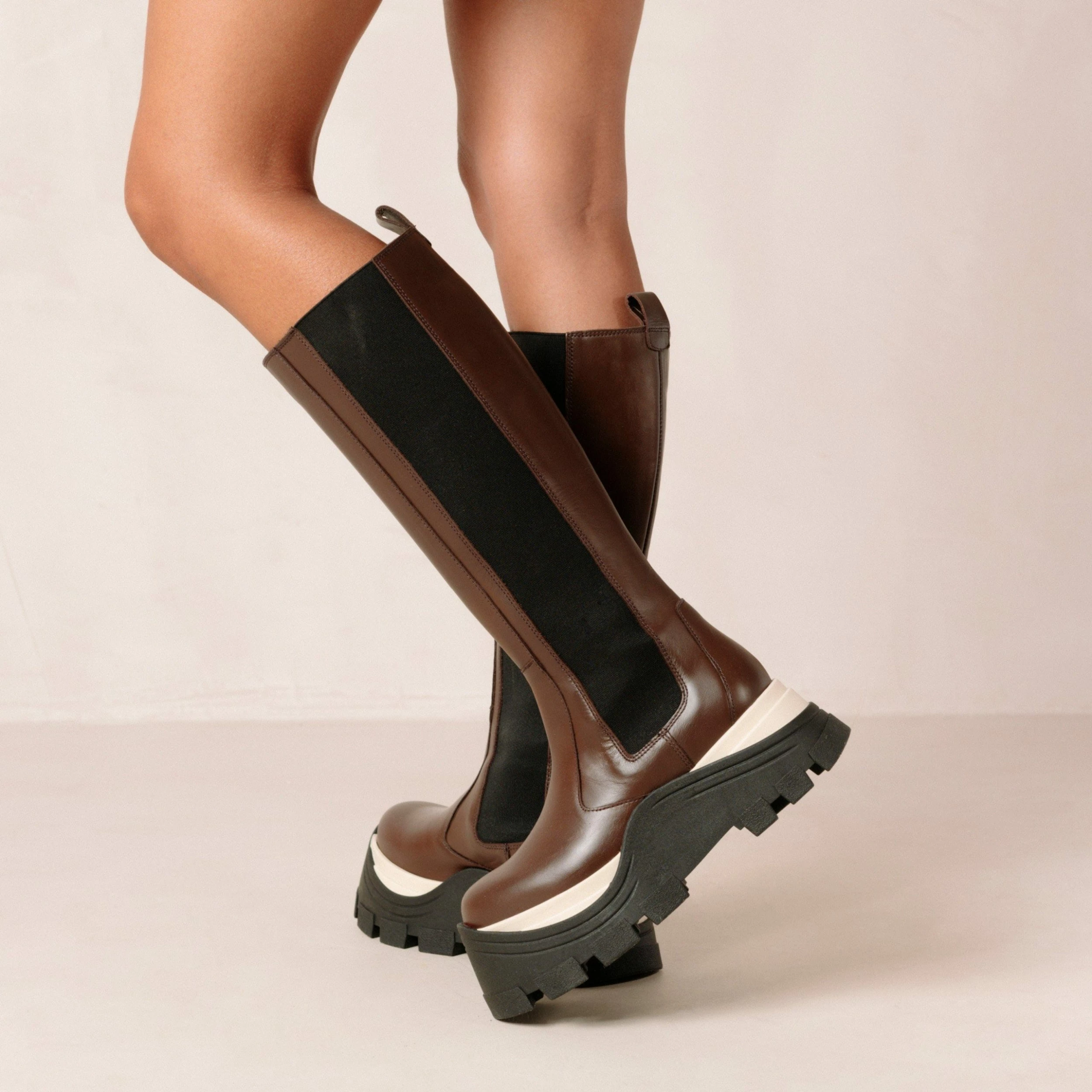 High knee chelsea boot with a thick track sole with an elastic side panel. The perfect companion for fall.