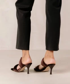 Give a twist to your daily attire with a sophisticated footwear choice. Crafted from sultry velvet in a gorgeous deep brown shade, these sleek square-toe mules rest on fluted stiletto heels with two padded straps that snugly hug the foot. Their beauty lies in their minimal silhouette and all-round versatility – team yours with anything from cocktail dresses to denim for the chicest take.