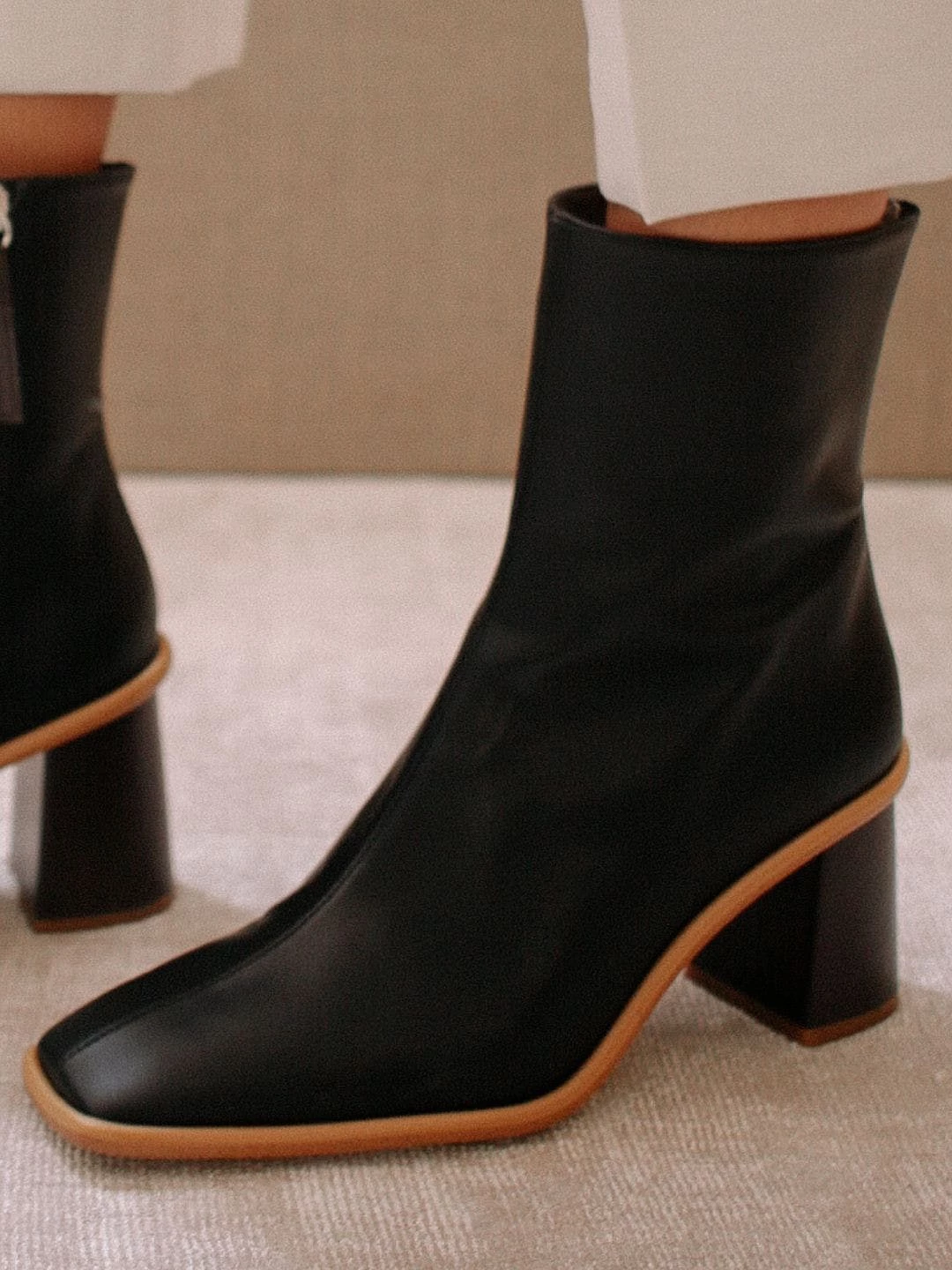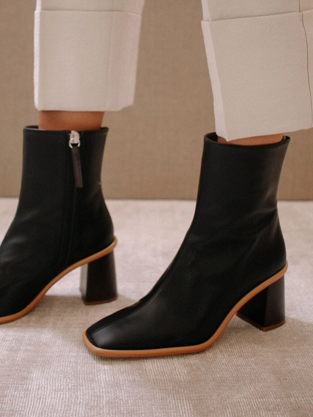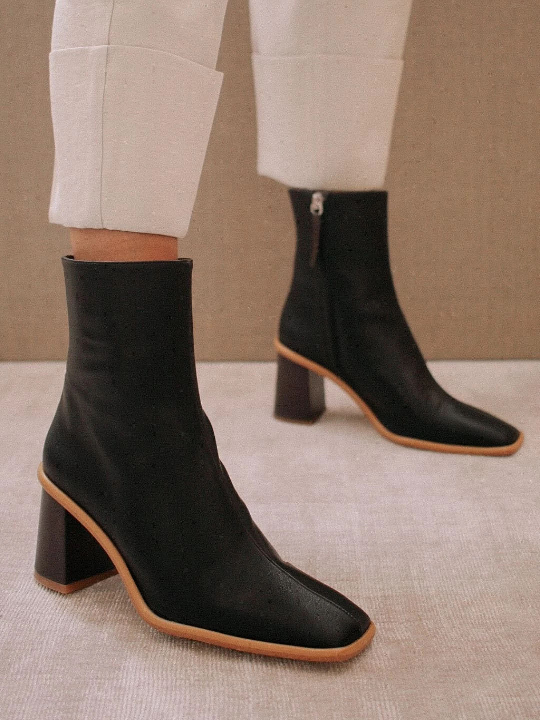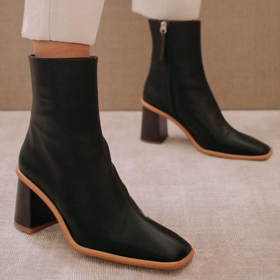 Made from recycled leathers and other materials, these women’s vegan ankle boots boast a brown wooden-effect block heel and a square toe. The West Vegan Grey also have inward facing zippers for extra comfort and a flattering, slim fit. Their light brown contrast stole and stitching detail from across the toe up to the ankle are the signature ALOHAS look.