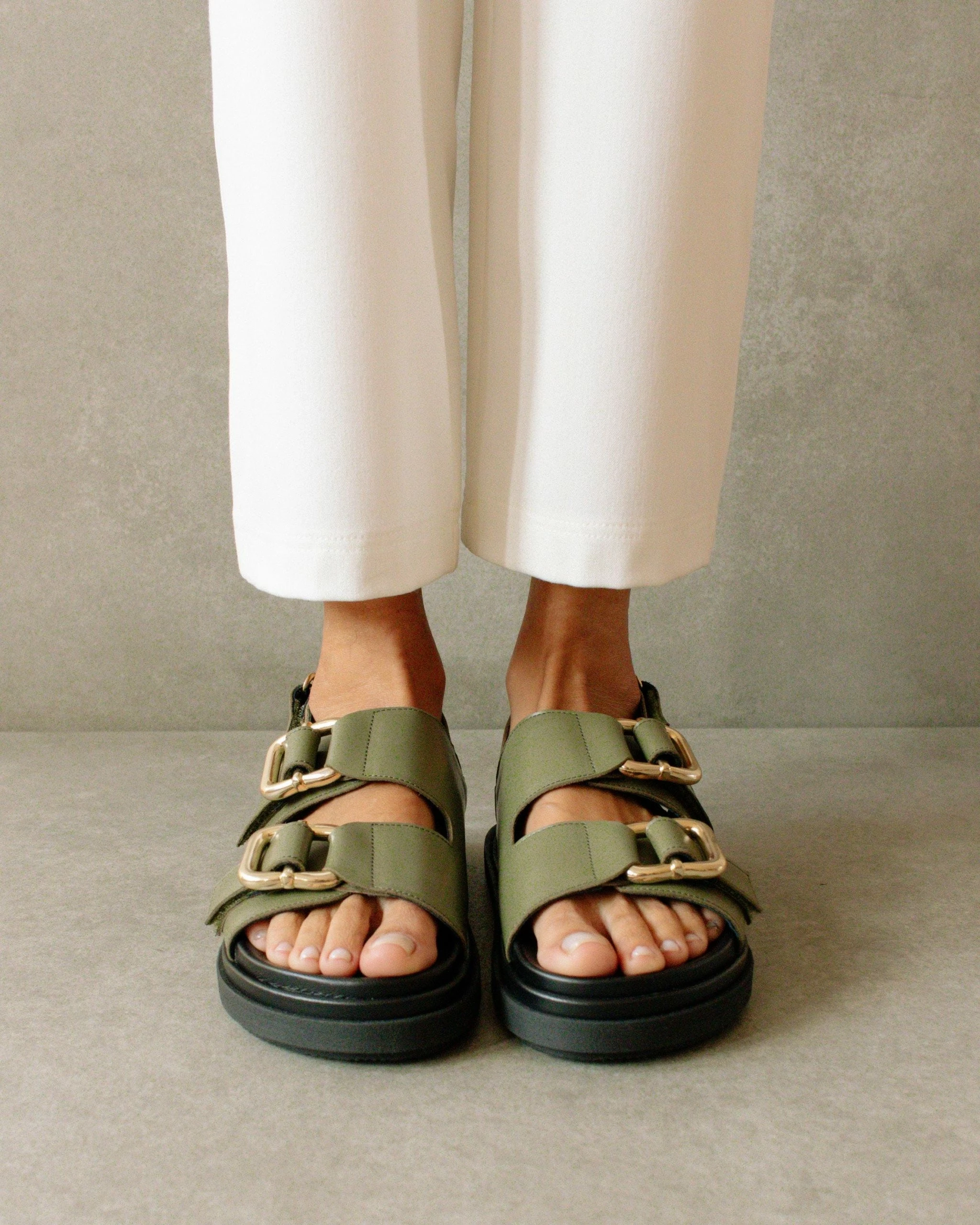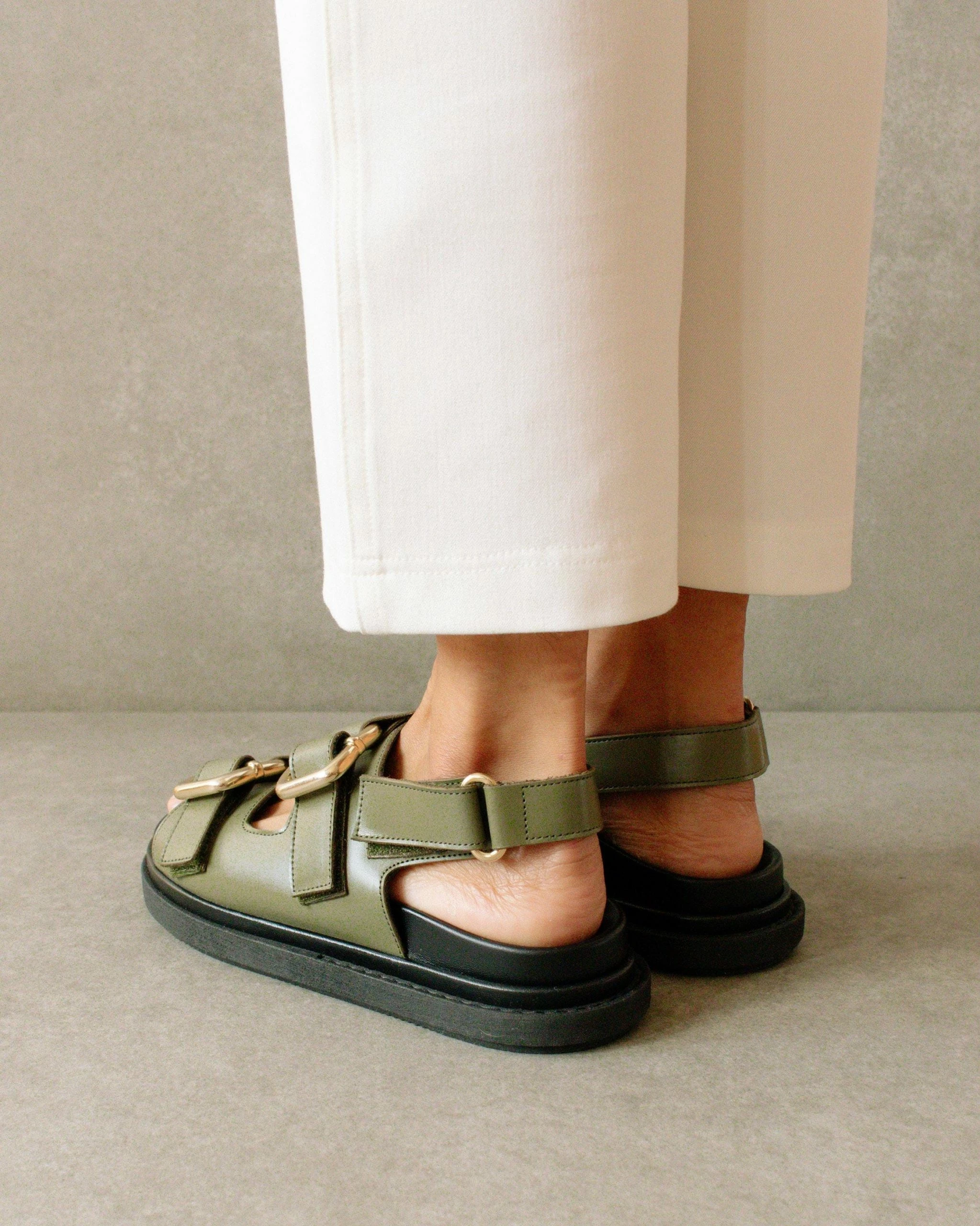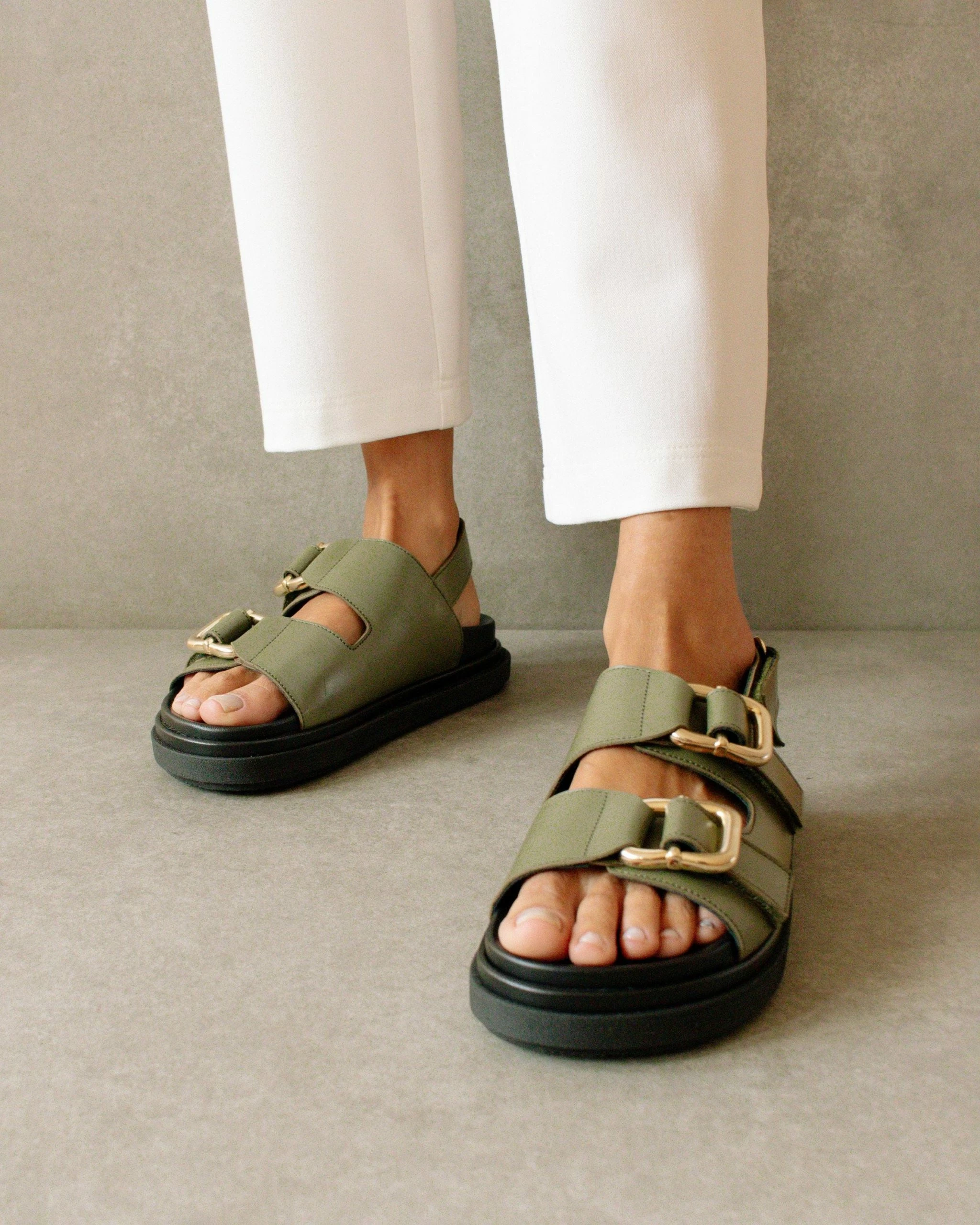 Buckle up! These black leather slingback sandals will take your summer style to new fashion destinations. The Harper has molded footbeds and raised rubber soles. The slingback silhouette ensures a comfortable fit, while the gold-tone, statement-making hardware crown the thick straps for a refined finish