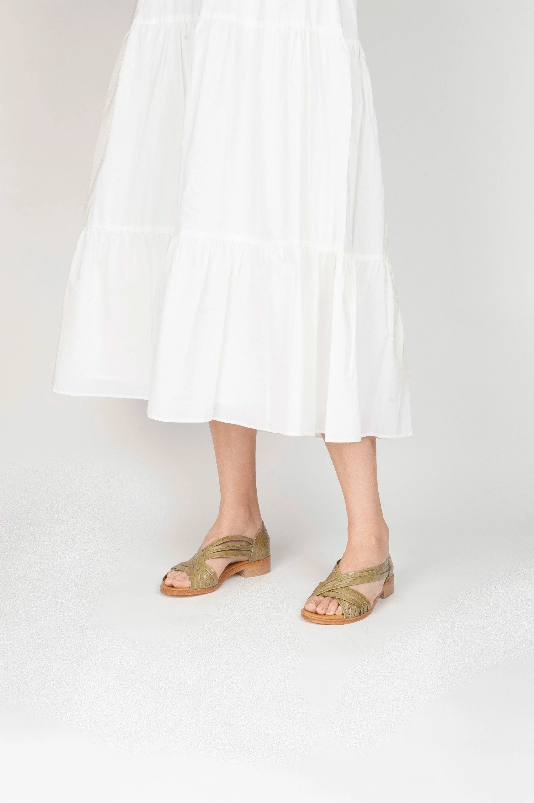 Aurore, with intertwined straps, this sandal rests on a flat sole and promises comfort and flexibility. A khaki croc-effect leather sandal to wear with all your summer outfits.