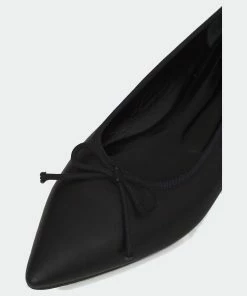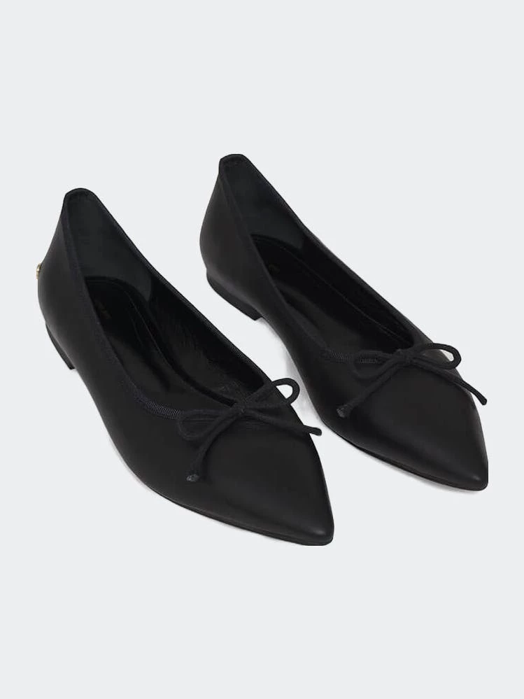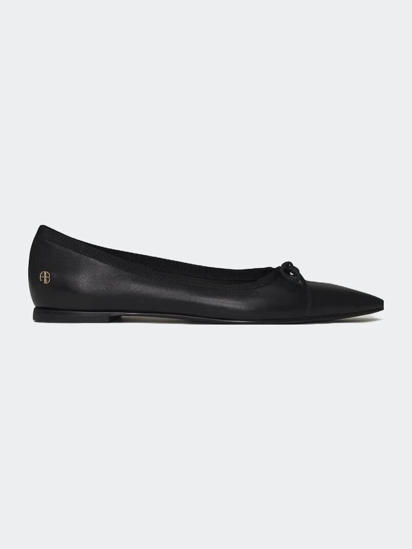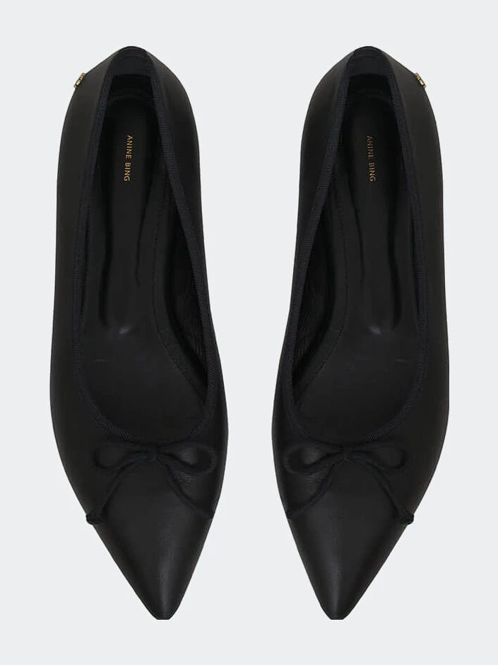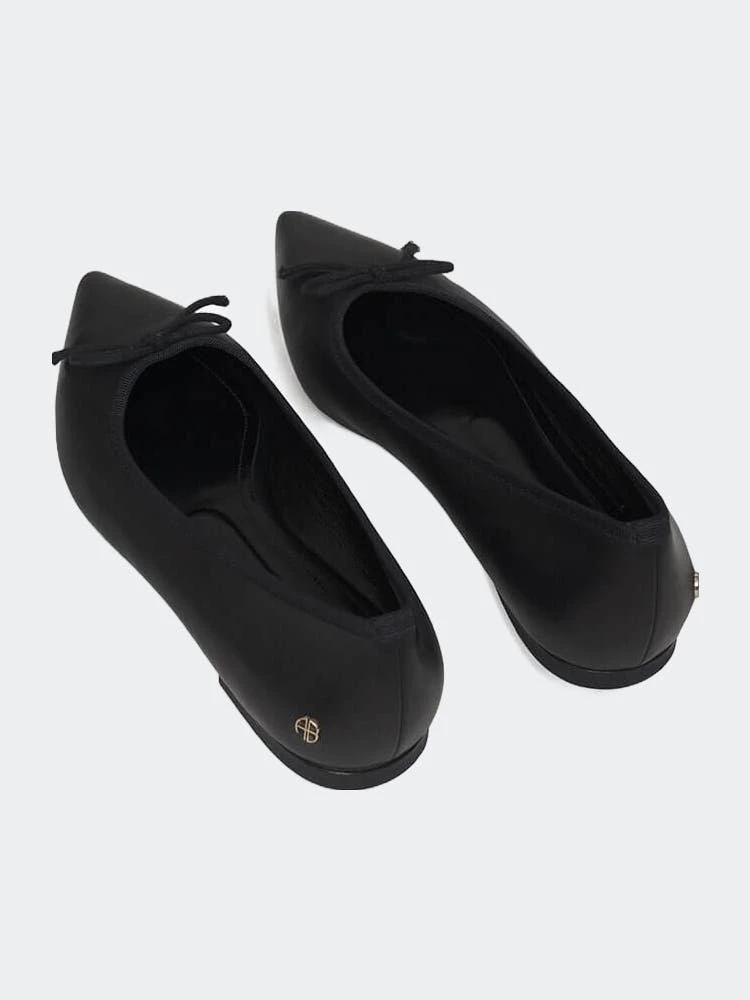A timeless ballet-inspired flat crafted in smooth black leather. The Delphine Flats feature a modern pointed toe accented with traditional grosgrain trim in contrast black. Finished with a single ANINE BING monogram in gold-tone hardware at the heel.