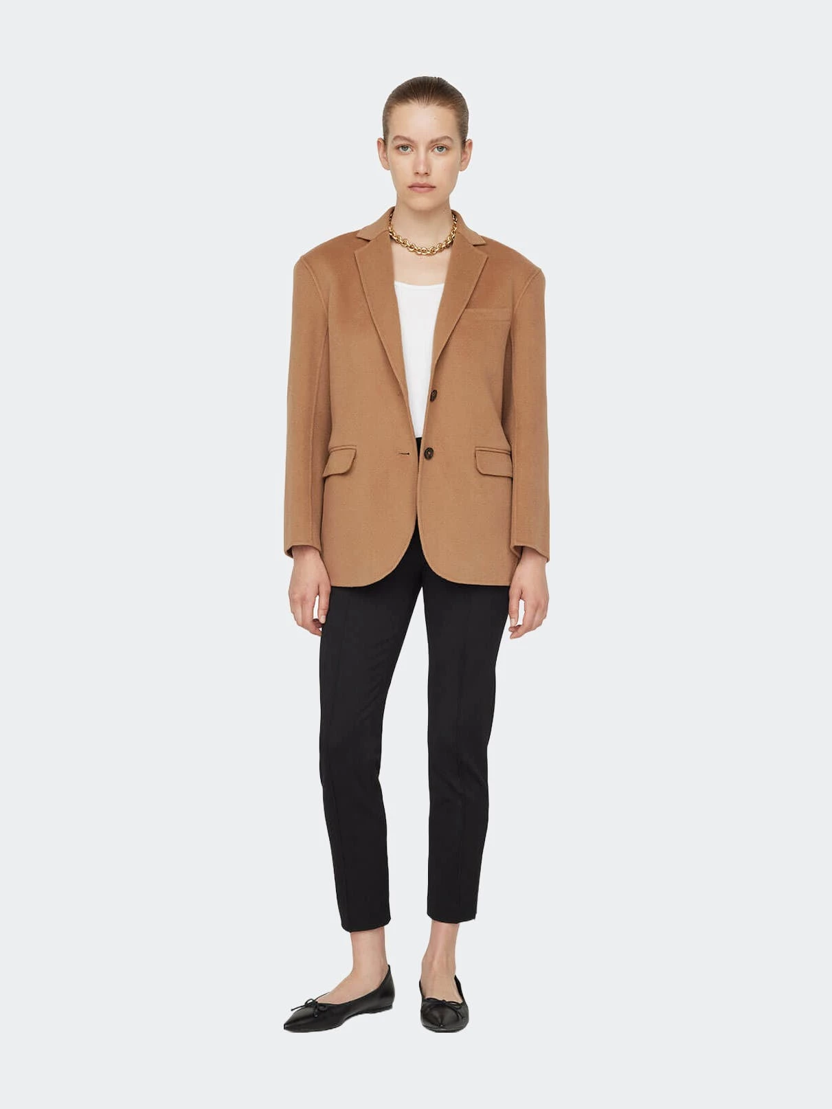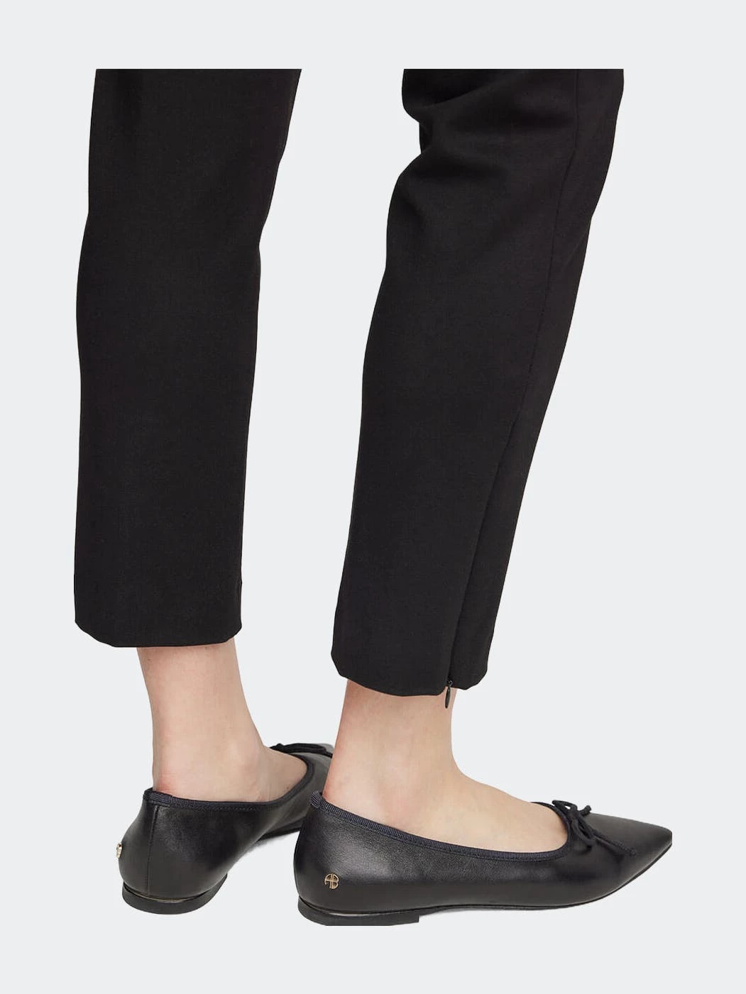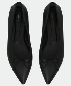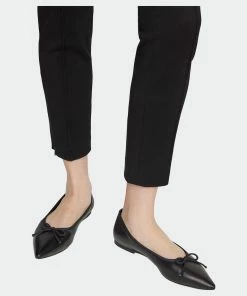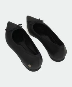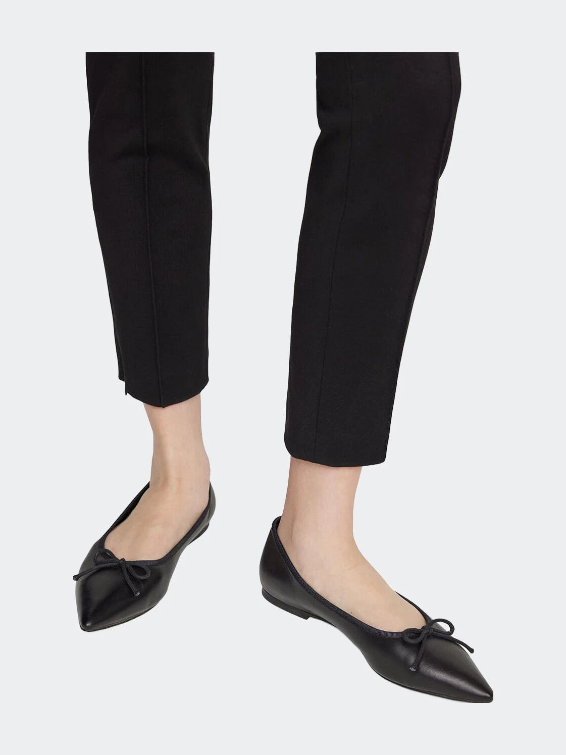 A timeless ballet-inspired flat crafted in smooth black leather. The Delphine Flats feature a modern pointed toe accented with traditional grosgrain trim in contrast black. Finished with a single ANINE BING monogram in gold-tone hardware at the heel.