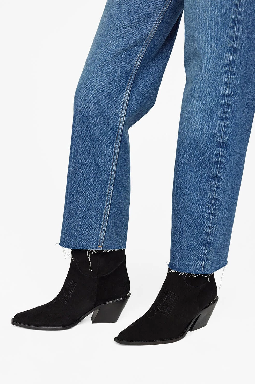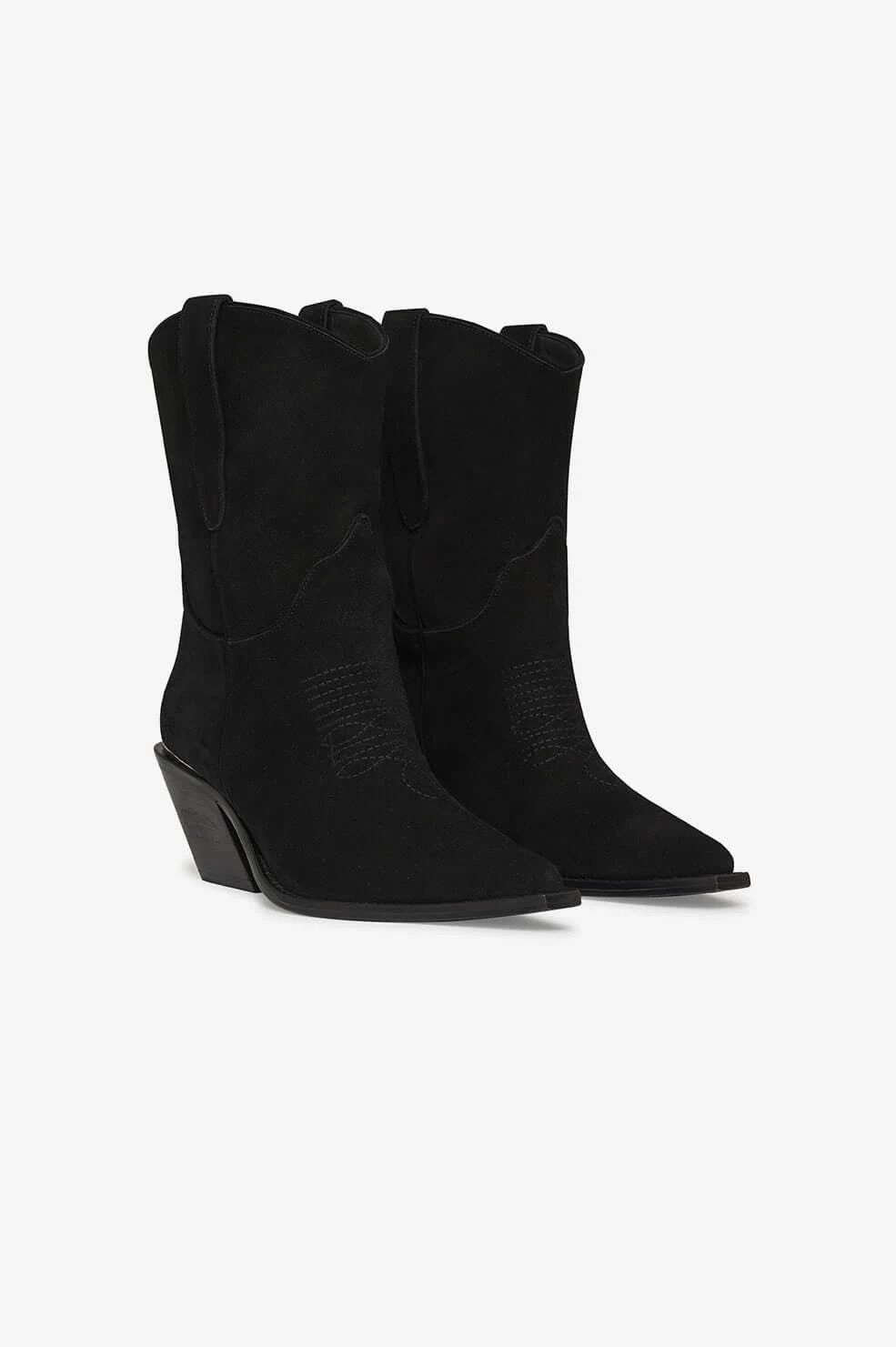 This signature Tania Boots updated with a slightly taller, ankle-length shaft. This pull-on pair is made with 100% suede and features a squared toe and chunky cuban heel, resulting in a comfortable and supportive construction. Subtle western stitch detailing adds a vintage-inspired touch to the Mid Tania Boots’ timeless look. Accented with silver-tone hardware at the heel.