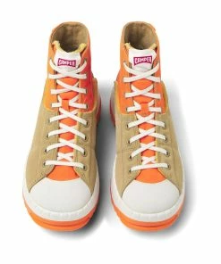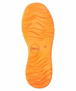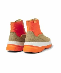 Orange and beige recycled textile and nubuck women’s ankle boots with PU and rubber outsoles. Teix is iconic hiking-inspired line originally launched in 1997. Boasting extreme volume, this unisex line offers a contemporary look, winter protection approach, and extra comfort.