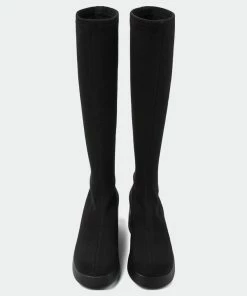 Black wedge heel women’s boots made of 54% TENCEL™ Lyocell fabric, 90% polyurethane leather and 10% ABS. With a bold, contemporary design inspired by Futurism and Brutalism, the Kaah boots offer a playful twist on avant-garde style.