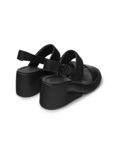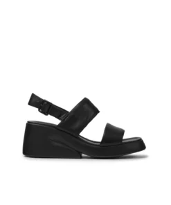 Black Sandal for women. Open upper with leather strap and ankle strap. Black wedge heel, black outsole, 90% polyurethane and 10% acrylonitrile butadiene styrene.With a bold, contemporary design inspired by Futurism and Brutalism, the Kaah Sandals offer a playful twist on avant-garde style.