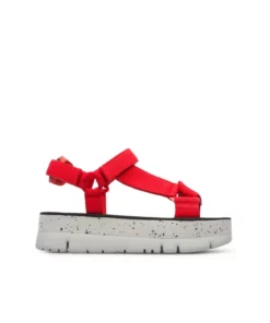 Red sandal for women. Multicoloured sandal for women. 100% recycled pet fabric straps with velcro closure. 100% beige platform eva outsole. A little better, never perfect. This Oruga up Sandals were designed for summer days and boast a thick characteristic sole for more height and a unique look