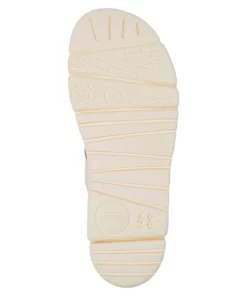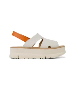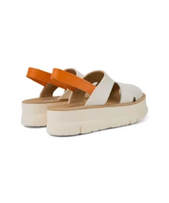 Women’s white full-grain sandal with orange details and eva outsole. This Oruga up Sandals were designed for summer days and boast a thick characteristic sole for more height and a unique look.