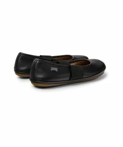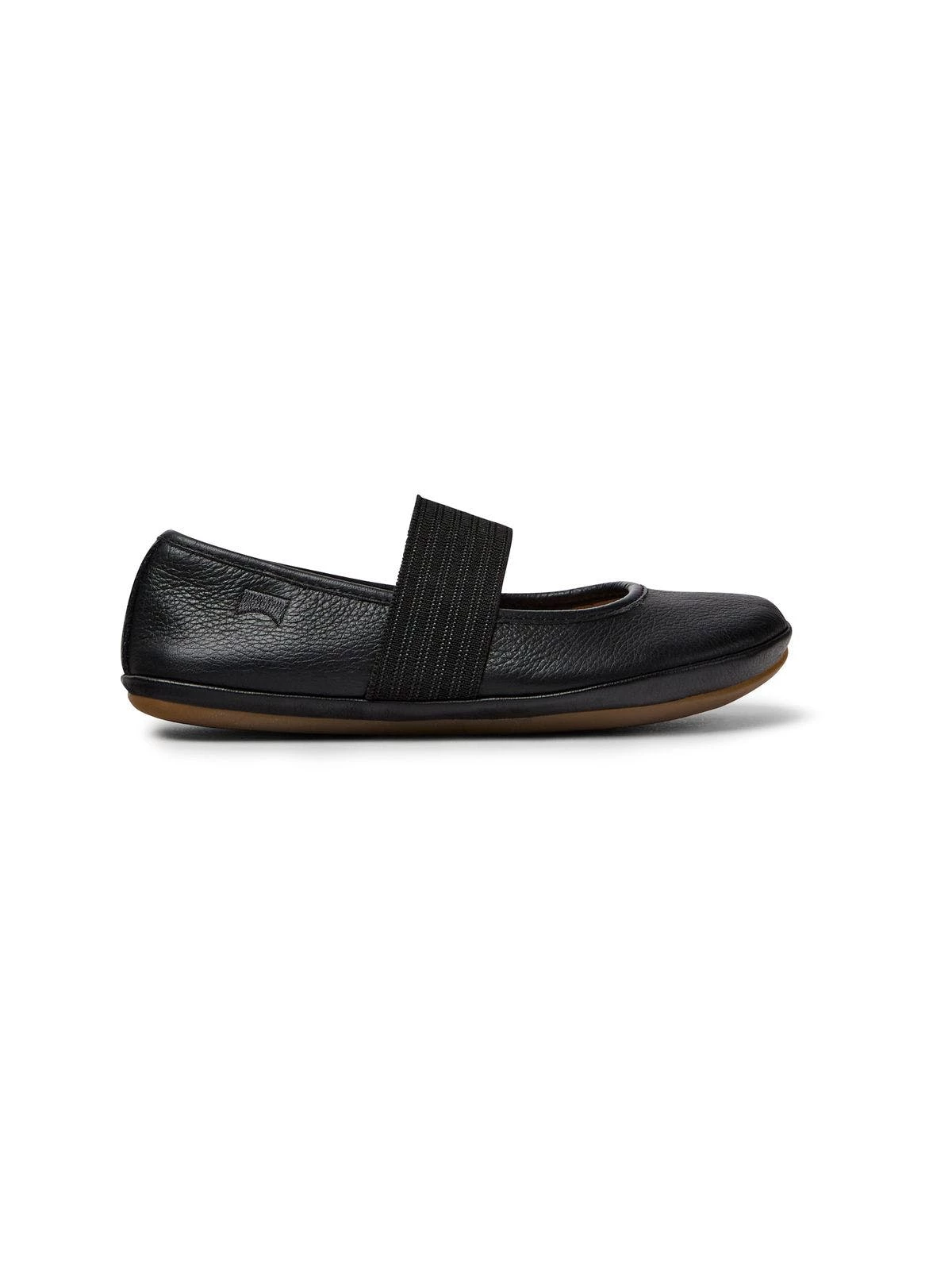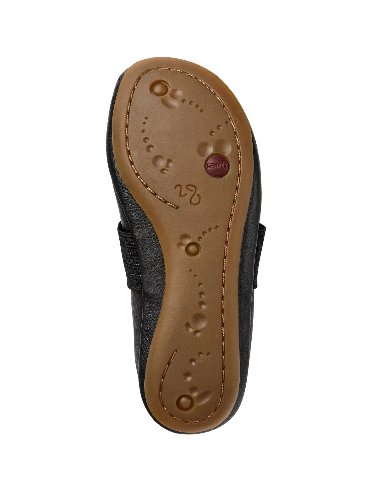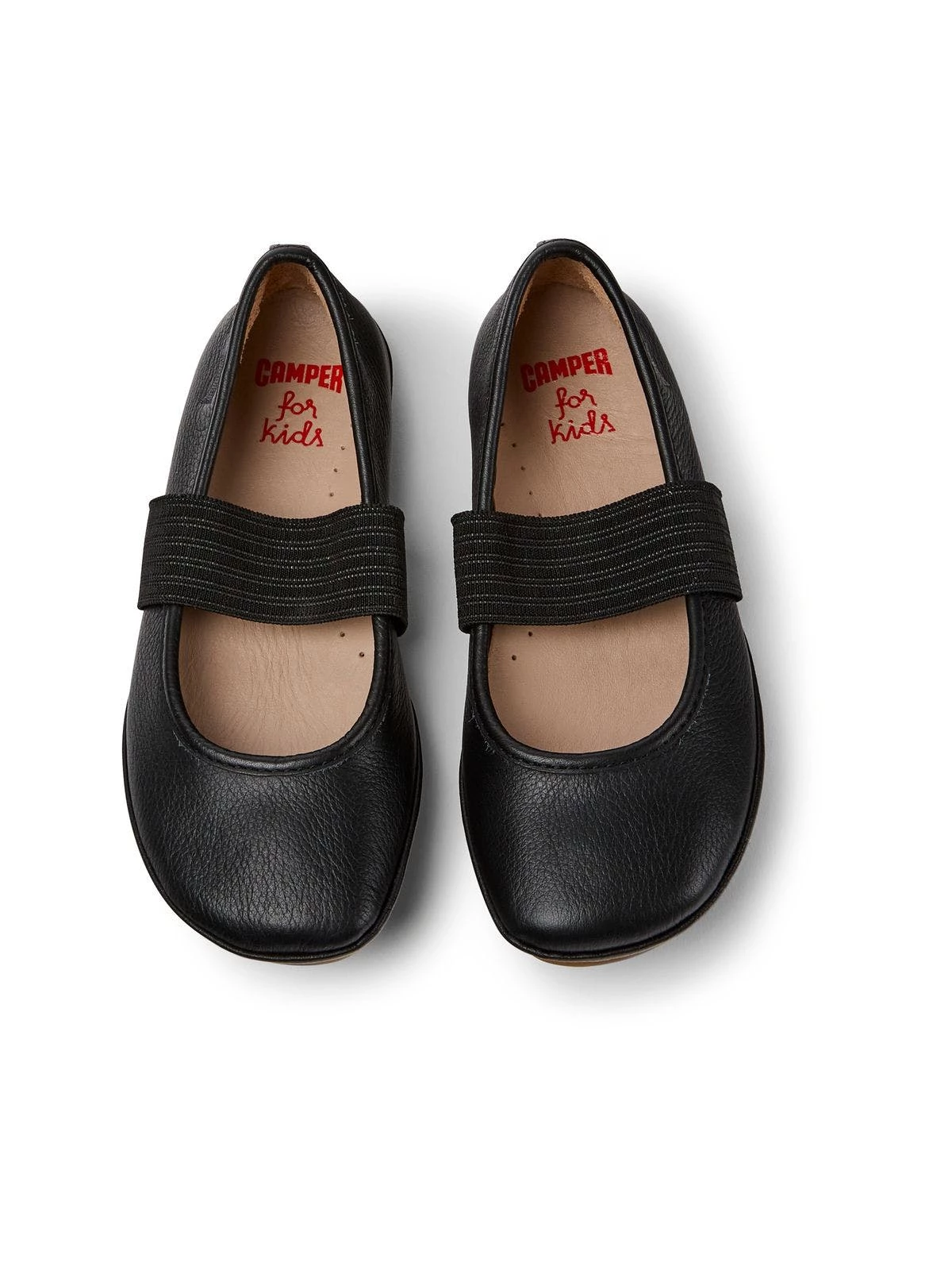 Black leather ballerinas for kids with elastic band and 100% rubber outsoles. Right girl’s ballerinas feature a playful shape and a flexible elastic strap that ensures these slipper-inspired flats won’t slip off.
