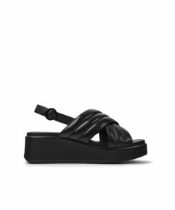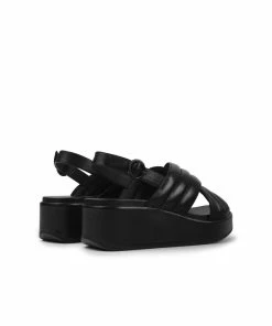 Black leather women’s sandals with polyurethane outsoles. The Misia Women’s Flatform Sandals are cushioned platforms that offer a stable height and a sophisticated silhouette wrapped in soft and elegant monochrome leather.