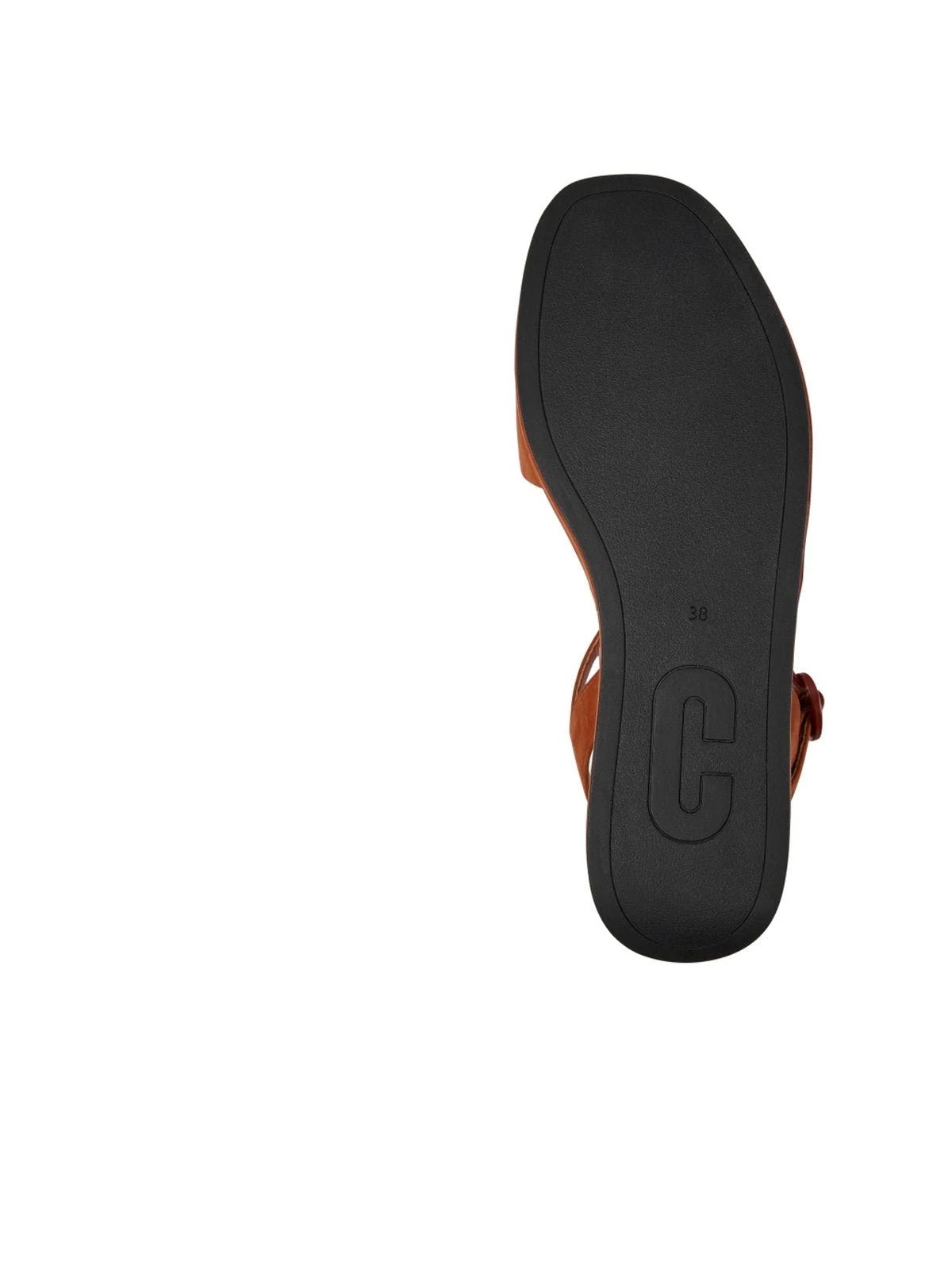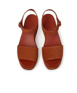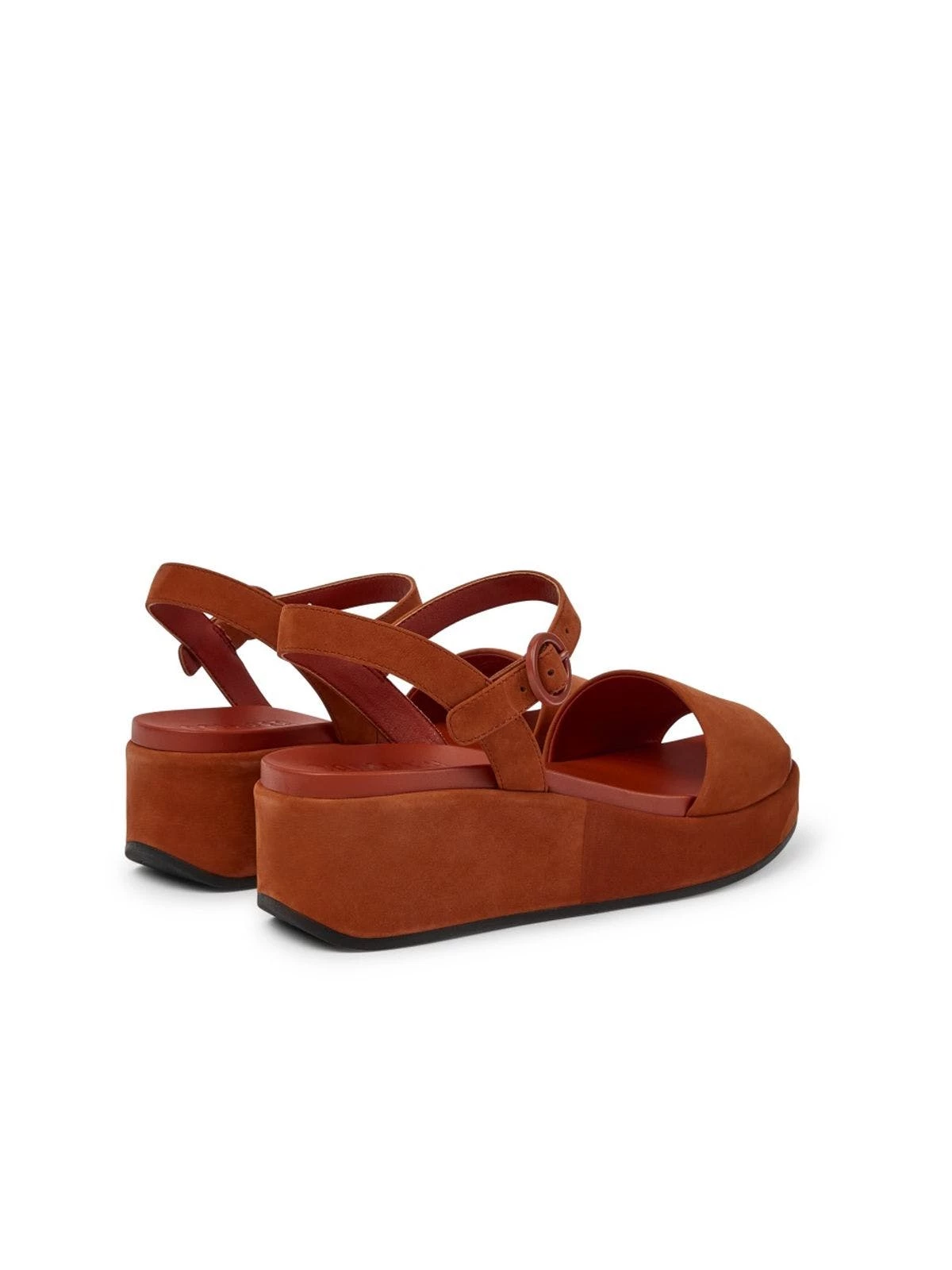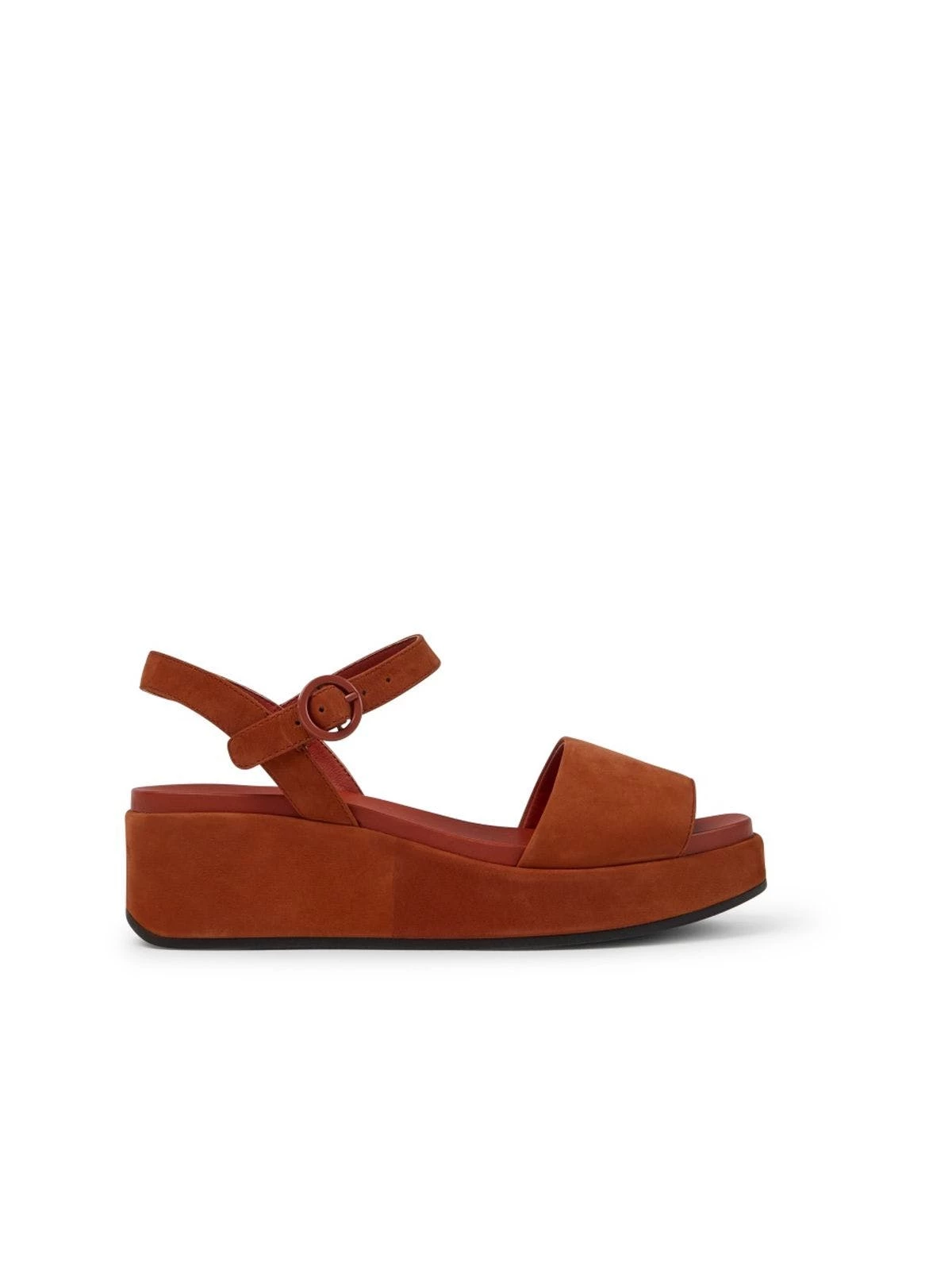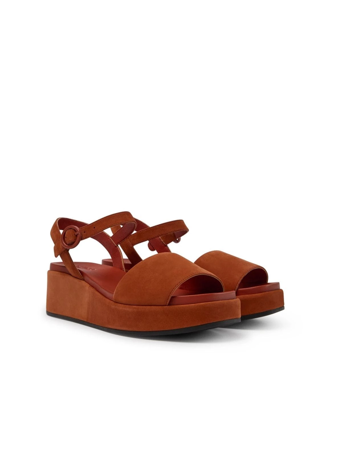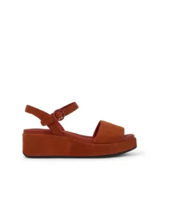 Red nubuck women’s sandals with polyurethane outsoles. The Misia Women’s Flatform Sandals are cushioned platforms that offer a stable height and a sophisticated silhouette wrapped in soft and elegant monochrome leather.