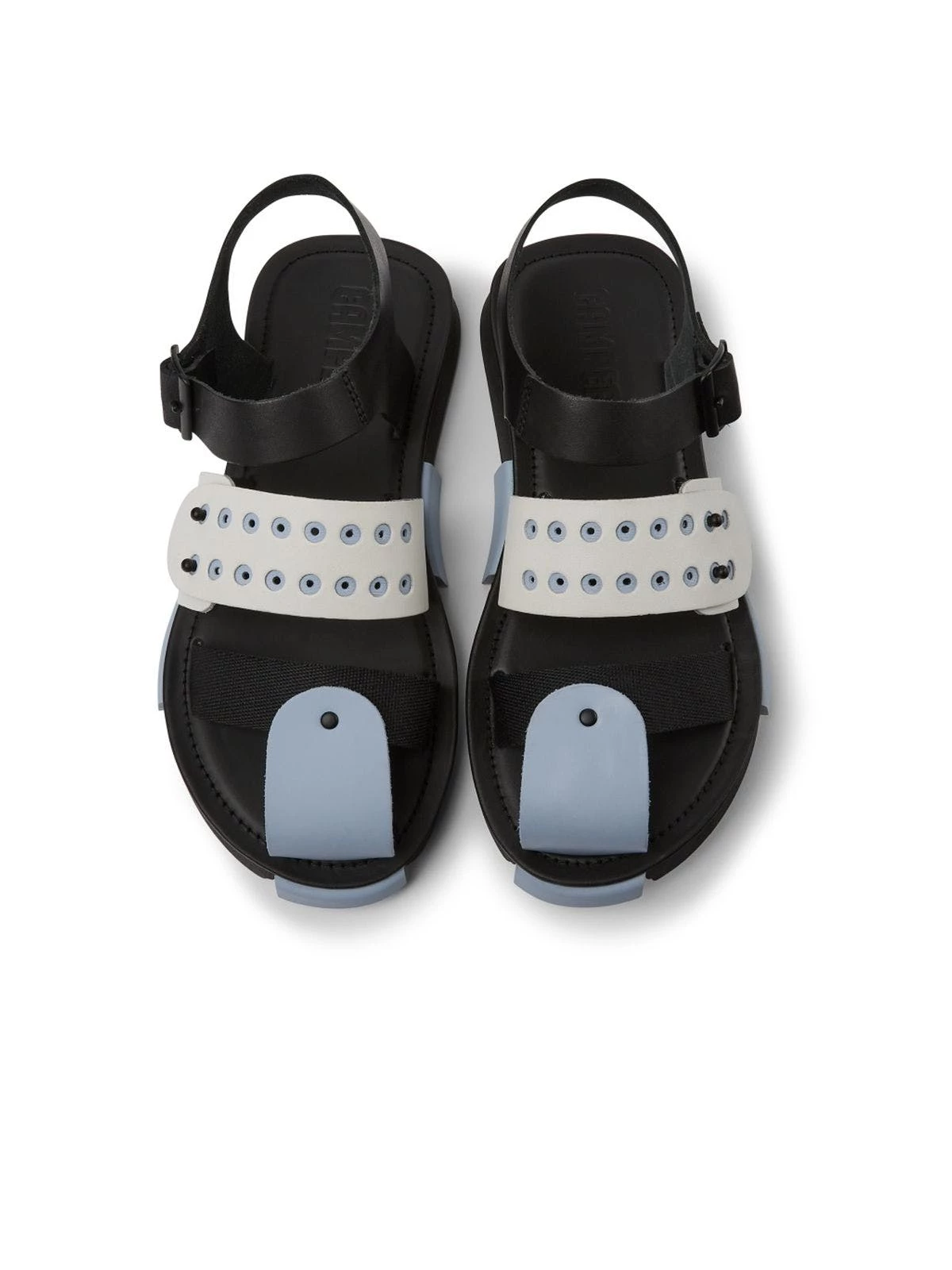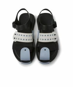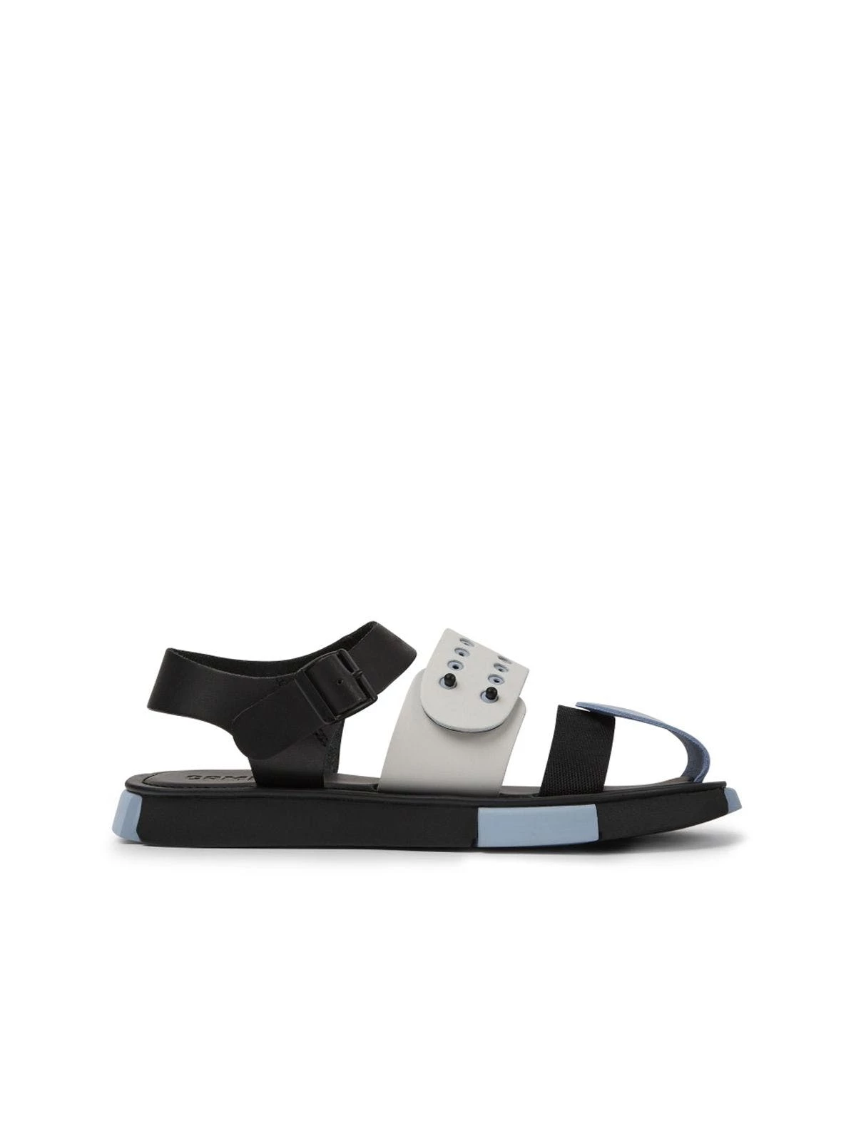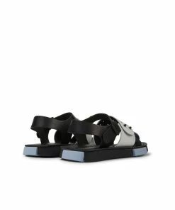 Black and white leather and recycled Polyethylene Terephthalate webbing men’s sandals with Ethyl Vinyl Acetate and rubber outsoles (20% recycled) and adjustable straps. Set is a lightweight style with multi-material straps made with recycled materials that support the foot and the planet.