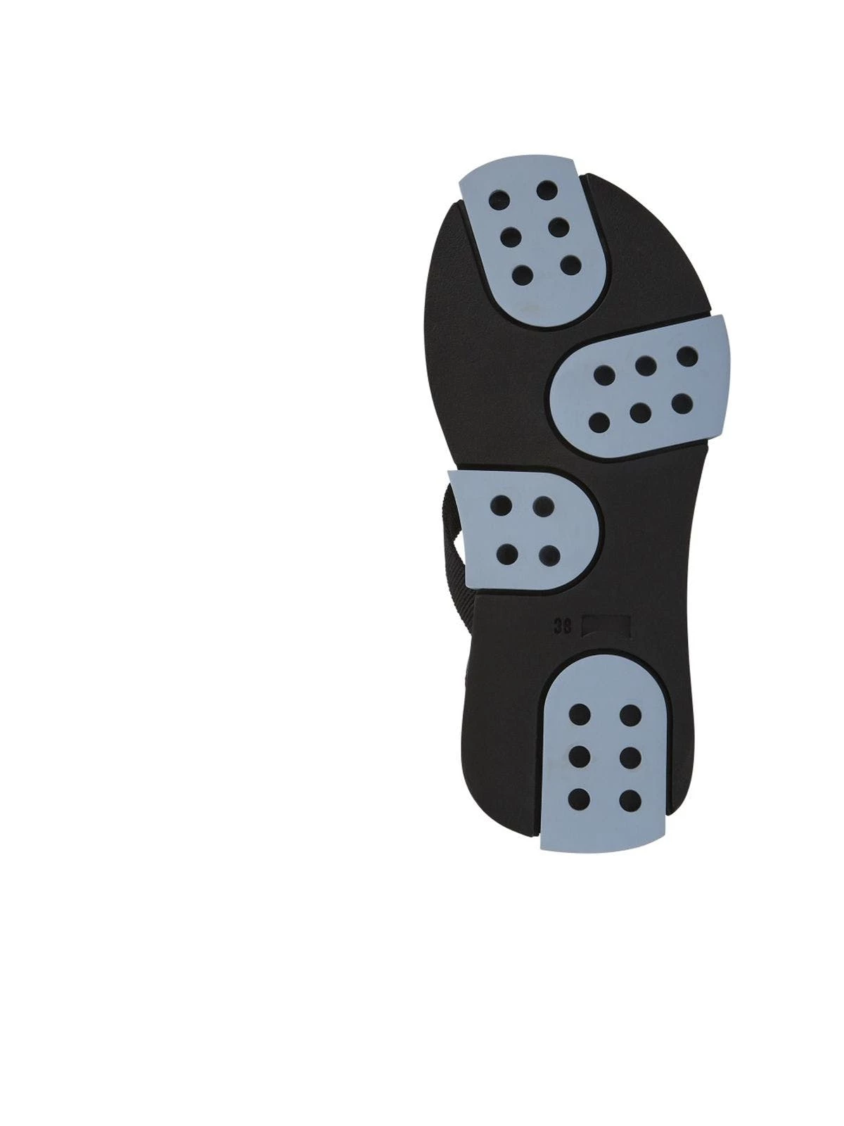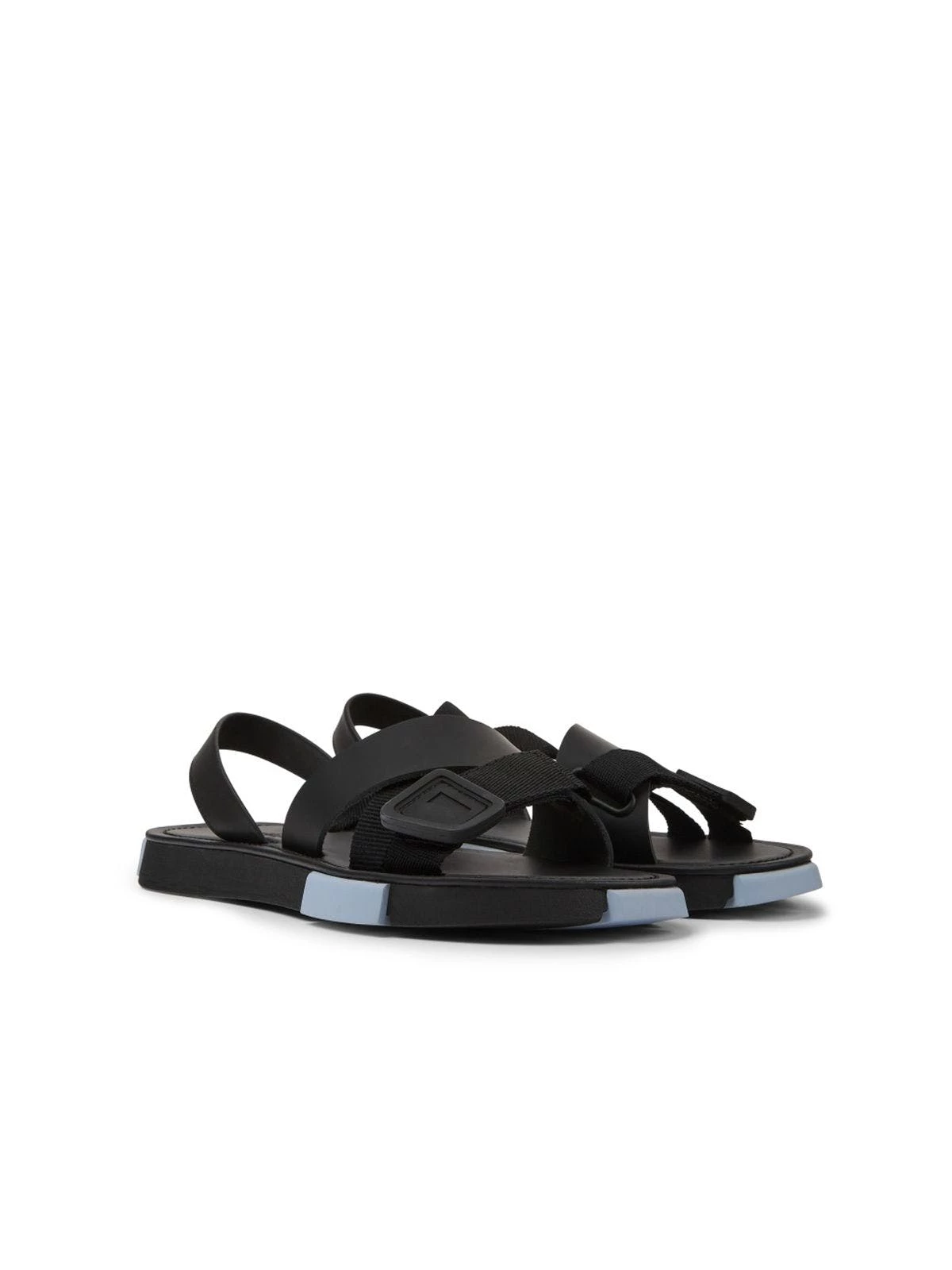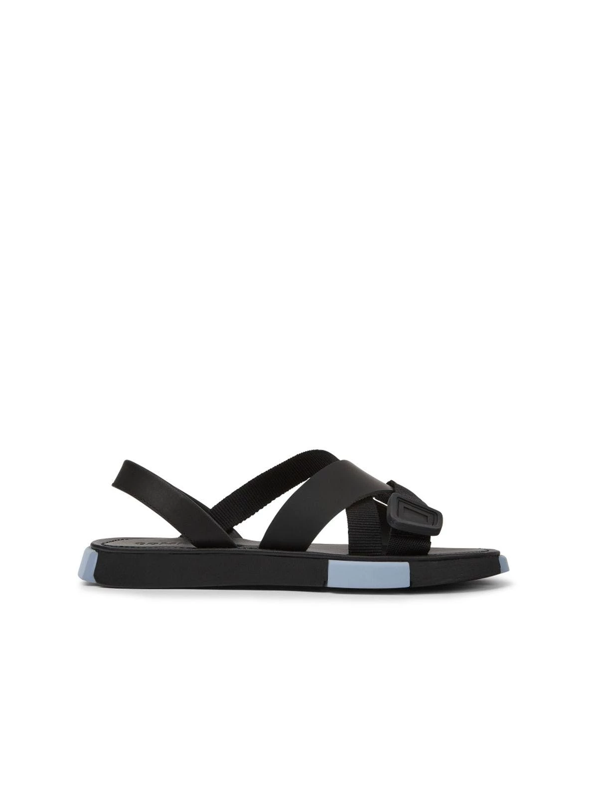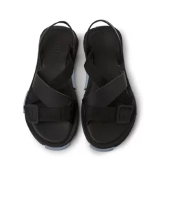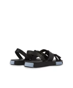 Black leather and recycled PET webbing women’s sandals with EVA and rubber outsoles (20% recycled) and a hook-and-loop closing system. Set is a lightweight style with multi-material straps made with recycled materials that support the foot and the planet.