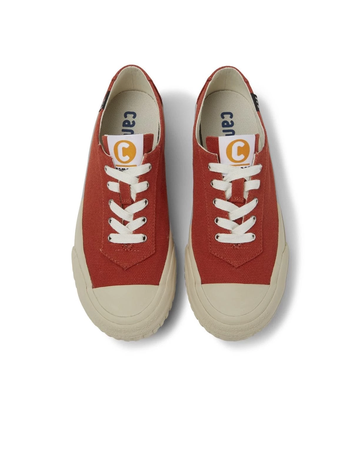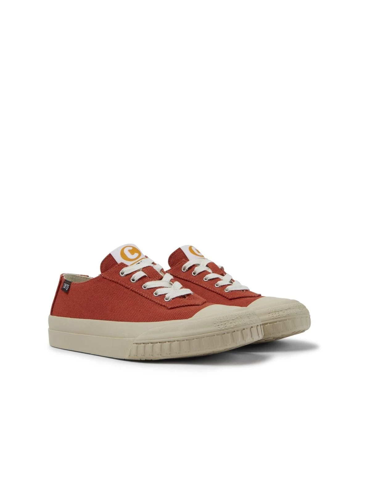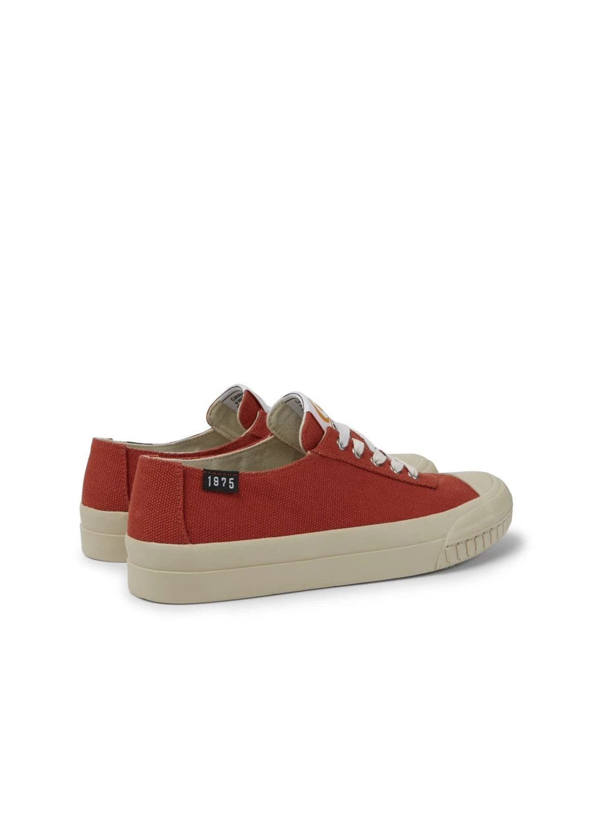 Red 100% recycled cotton men’s Sneakers with 23% recycled rubber and 40% natural rubber outsoles. For each pair of Camaleon sold, we will give 1% to save the med, a grassroots organization working to regenerate the mediterranean sea through education and marine projects. Camaleon, Camper´s first-ever shoe, epitomises the simplicity and resourcefulness of its Mediterranean heritage. Inspired by rustic shoes worn over a century ago, Camaleon proposes a more considerate way of walking and exploring.