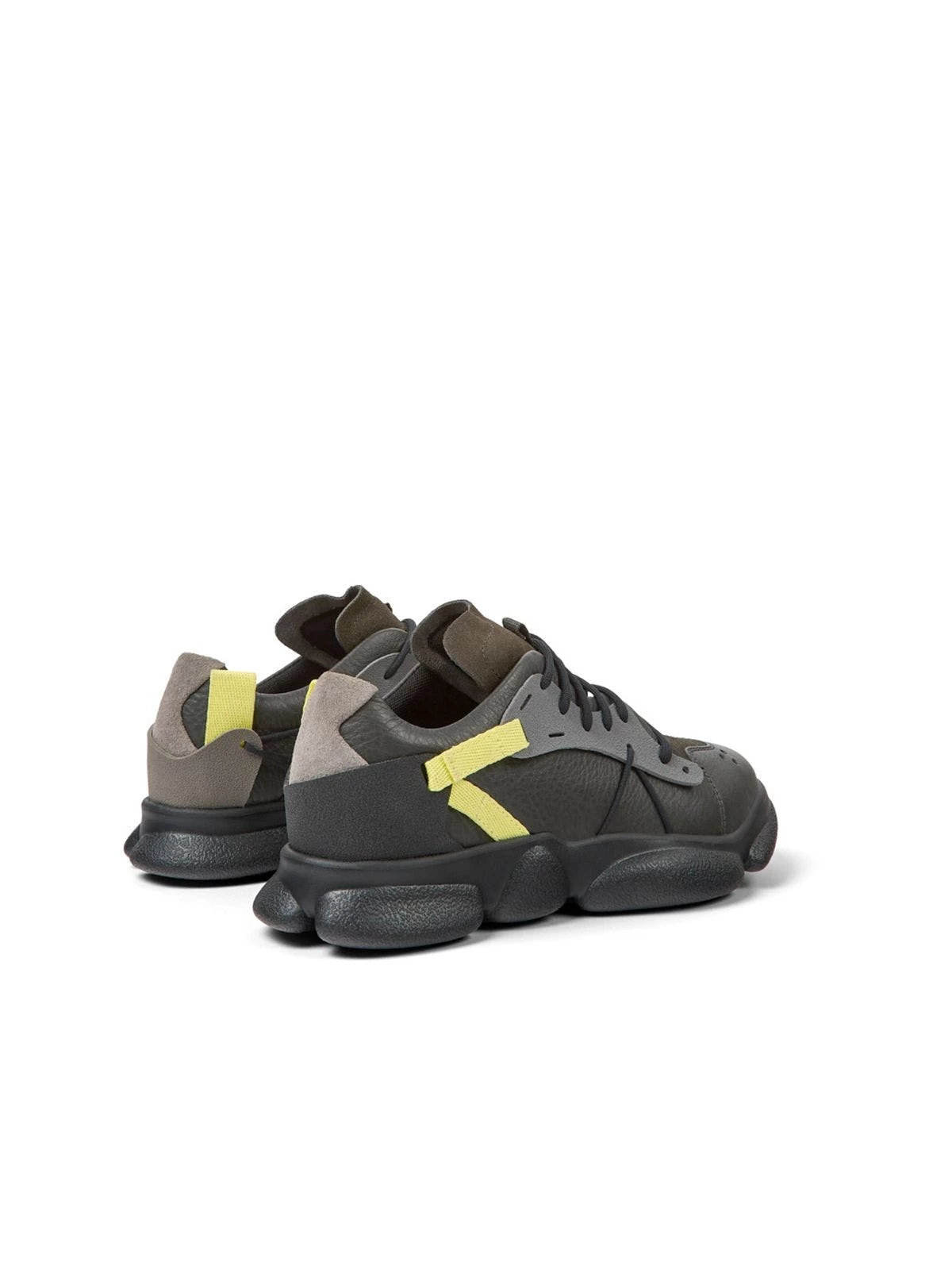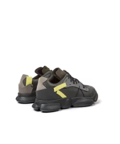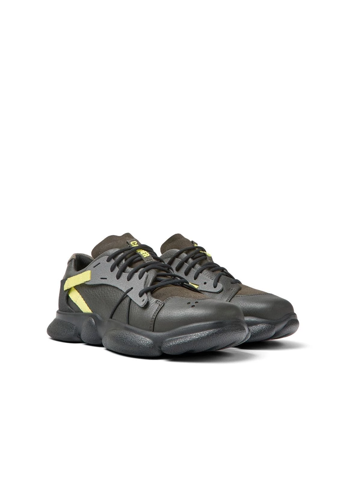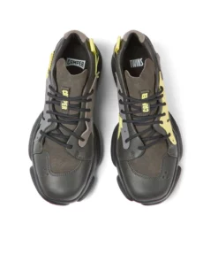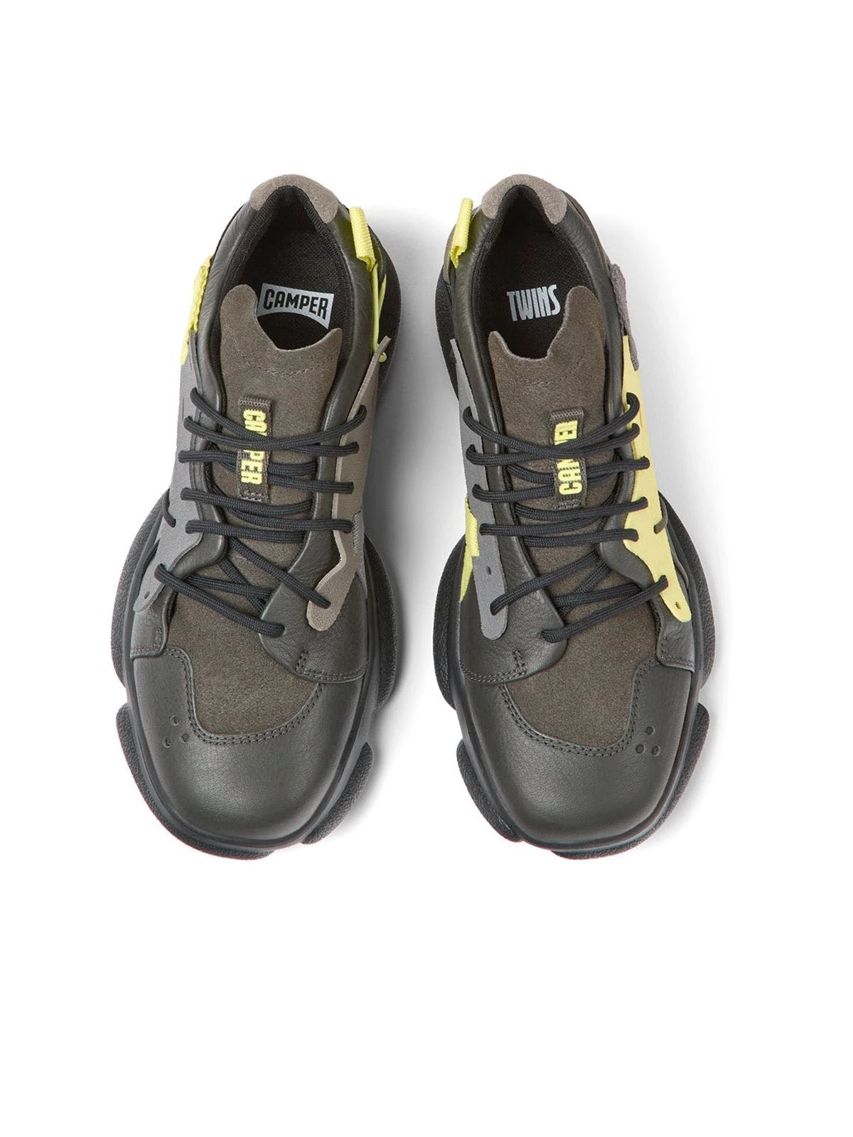 Gray, yellow, and black leather and nubuck women’s sneakers with ortho lite® recycled™ footbeds and xl extralight® organix™ outsoles (30% bio-based sugarcane). Born in 1988, twins concept challenges the idea that shoes should be identical, presenting mismatched styles that are truly unique.