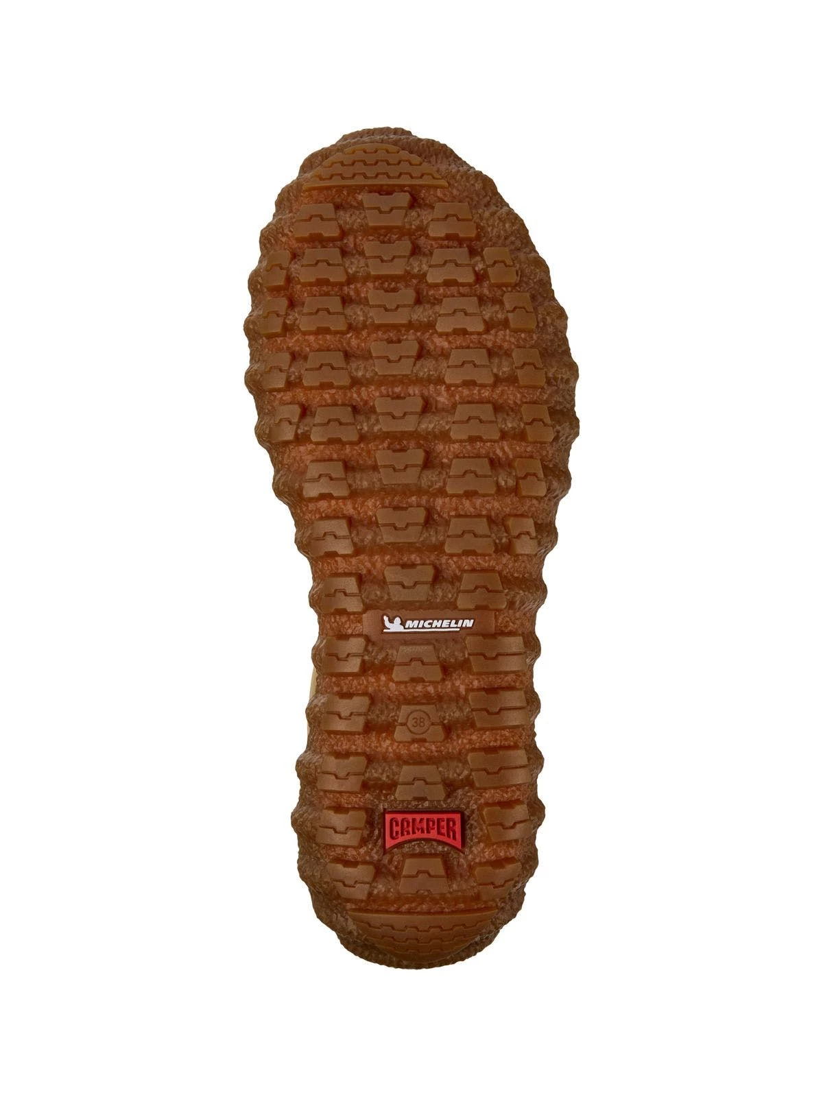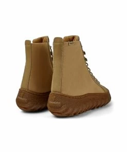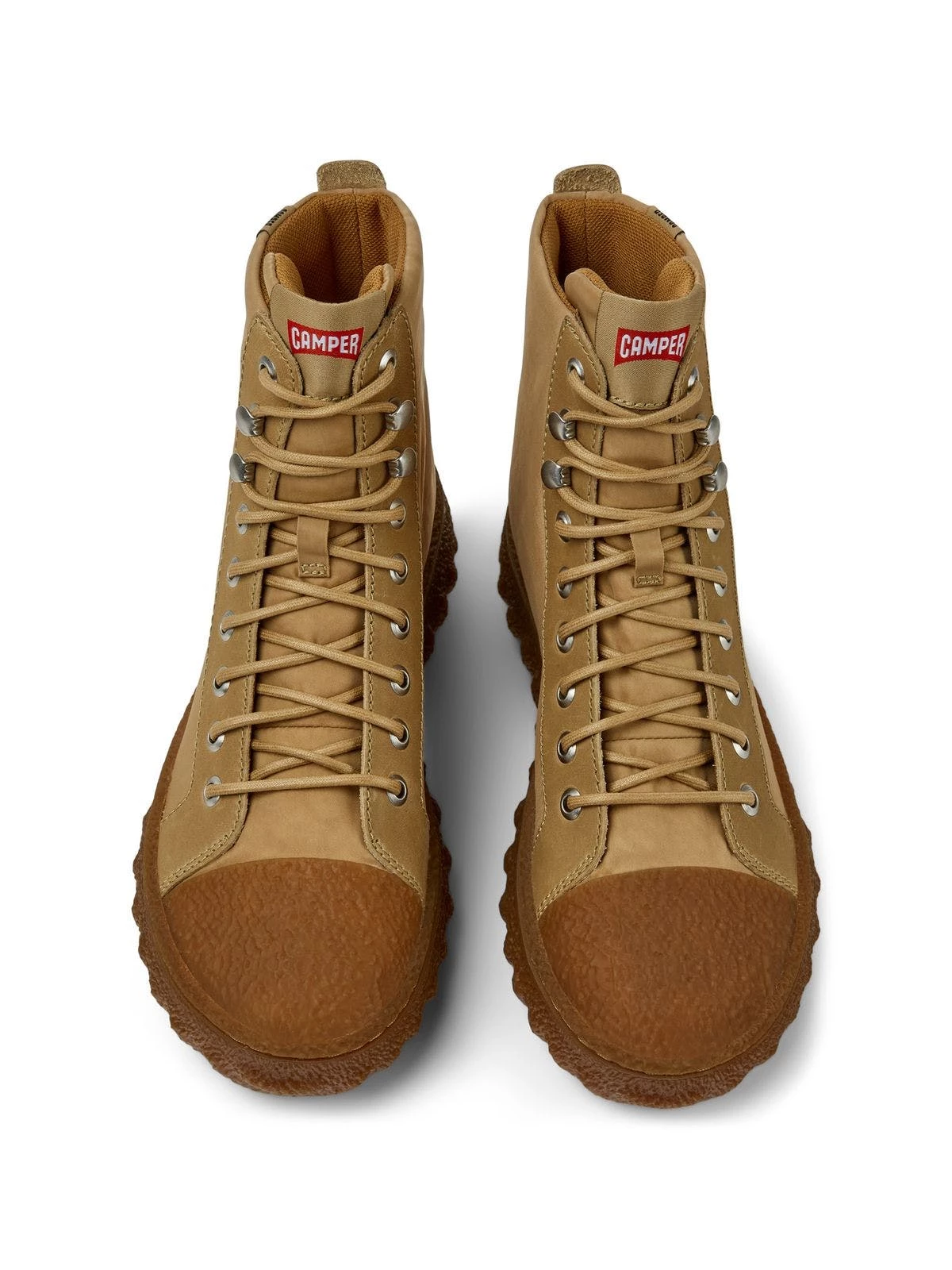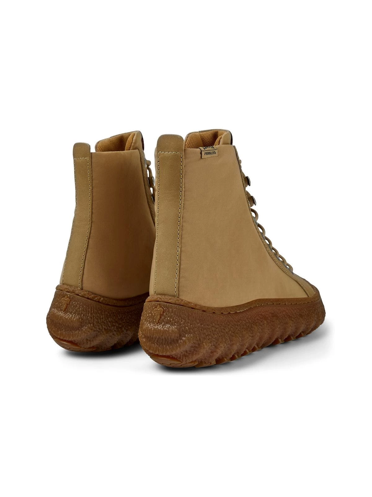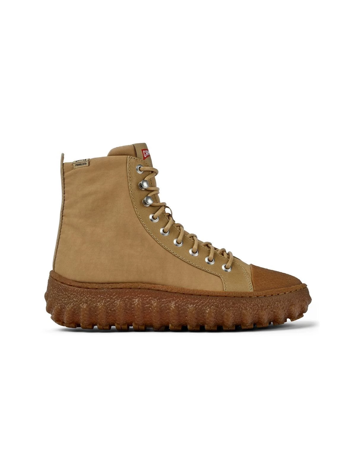 Beige textile and leather women’s ankle boots with recycled PrimaLoft® membranes, OrthoLite® Recycled™ footbeds, and Michelin rubber outsoles (27% natural).Ground reimagines urban street style by adding a contemporary twist on the industrial Camper aesthetic.