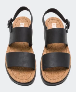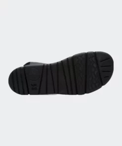 Black women’s full-grain sandal with EVA outsole and buckle closure.