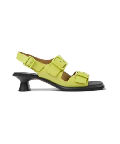 Green leather women’s sandals with OrthoLite® Recycled™ non-removable footbeds and rubber outsoles.Dina is one of the lines of low-heeled sandals with a carefree spirit. It has a feminine design which while robust and resistant can easily be identified with the Camper style of footwear for women. It’s wide and slightly square shoe last is combined in different models with handmade style knots and crossed straps.
