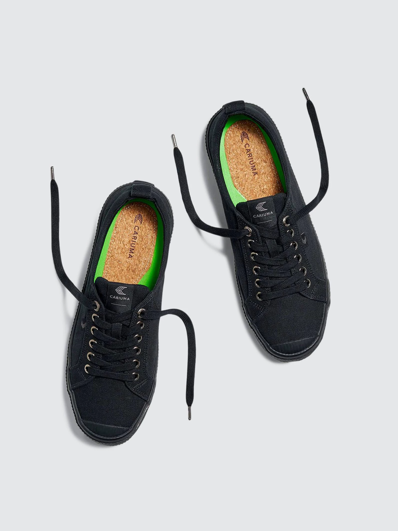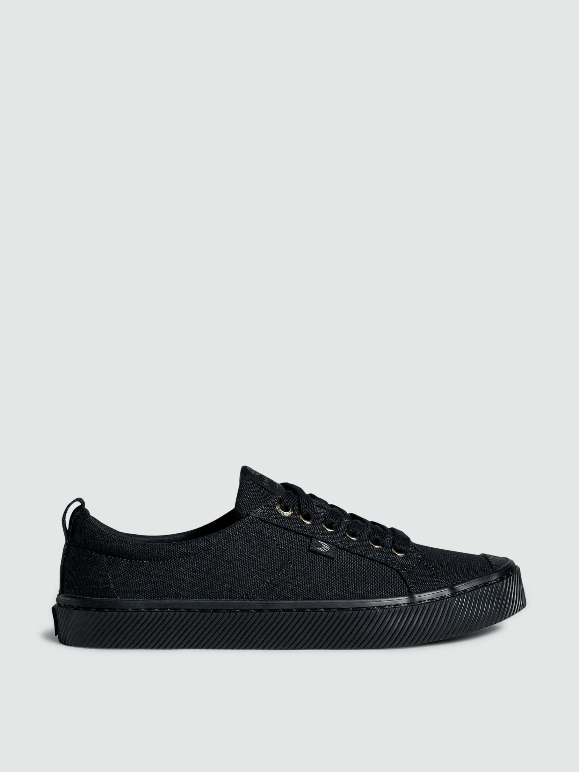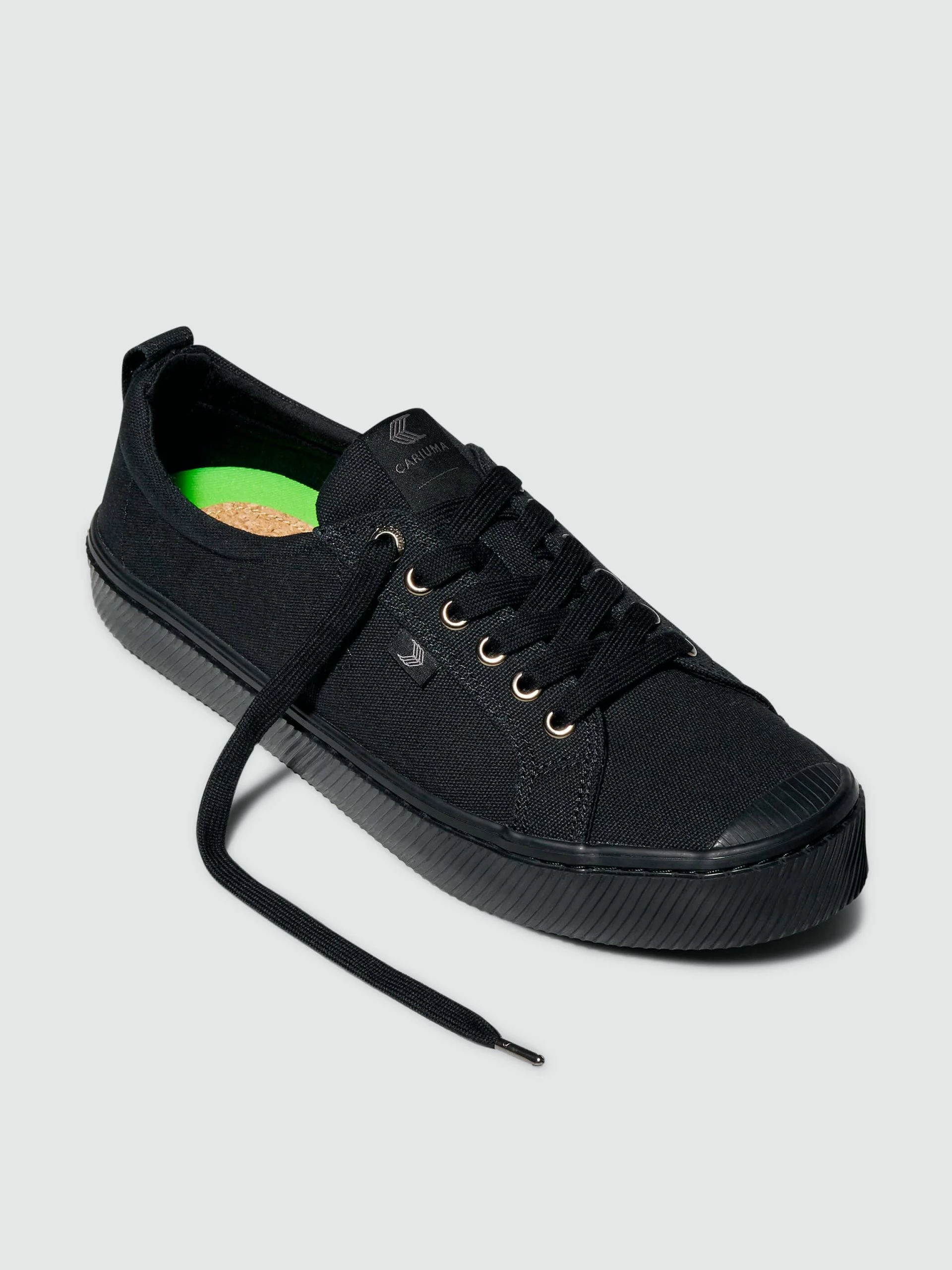 Our much-loved, signature sneaker is the OCA. Crafted from high-end, raw materials, it features lightweight cushion technology, the perfectly-weighted rubber sole, and classic cap-toe design. Now available in all-black fair trade canvas. (Yes, we even turned our logo black too!) An all-one-color shoe gives you a clean palette and an effortless look when you’re dressing yourself, no matter the occasion.