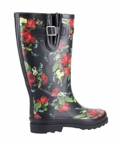 – Upper: Rubber.- Lining: Soft, Textile.- Insole: Textile.- Outsole: Cleated, Rubber.- Sole Features: Durable, Lightweight, Non Slip, Ultra Grip.- Fastening: Buckle, Slip-on.- Calf Strap, Contoured Footbed, Gusset.- Low Heel.- Heel Height (Imperial): 1.18in.- Cut: Mid Calf.- Design: Blossom.- Finish: Matte.- Toe Style: Round.- Waterproof..- Gender: Women
