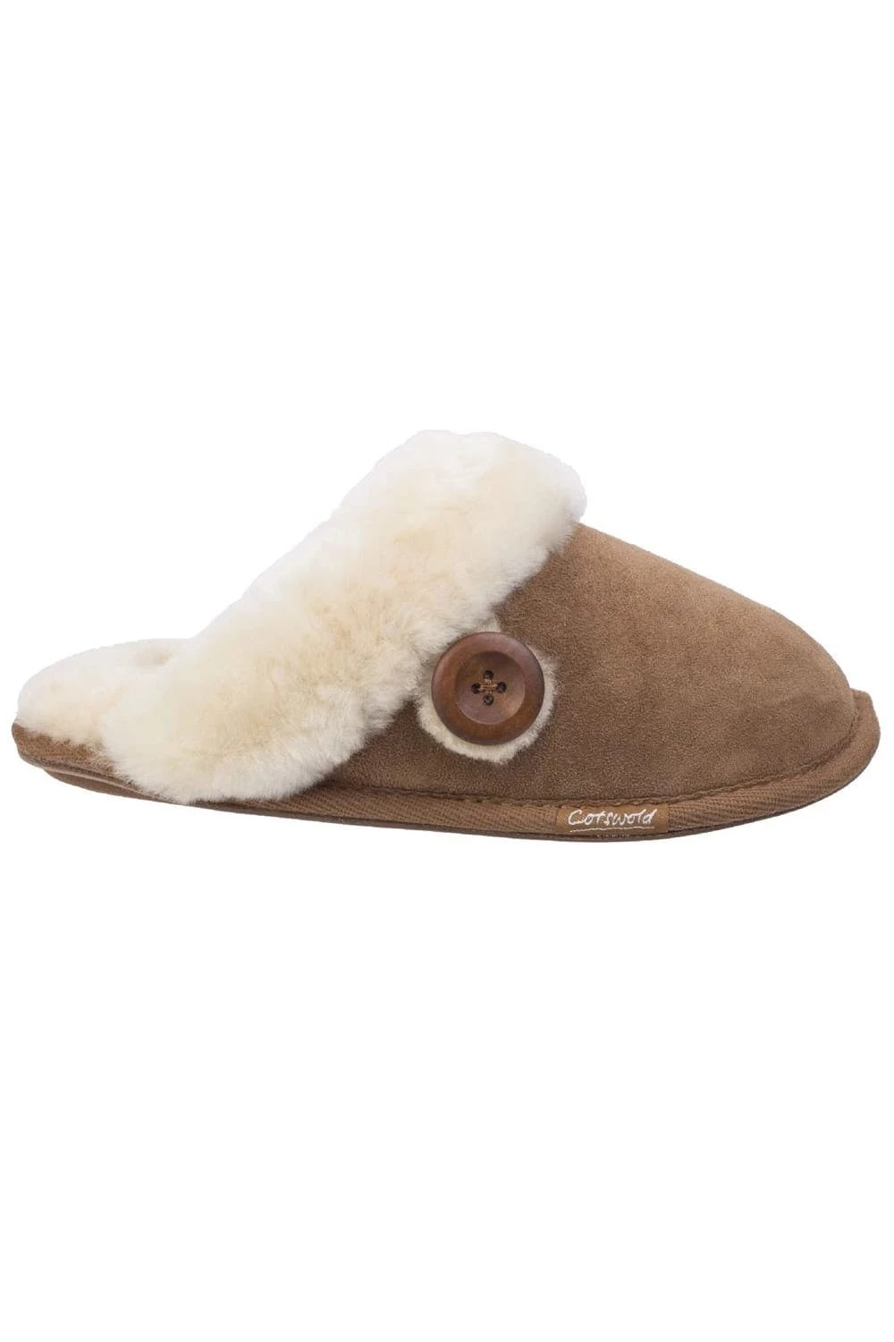 – Cotswold mule slippers.- This Lechlade comfortable slipper has a luxurious double faced sheepskin and soft suede upper.- Gentle rubber grips for ultimate comfort.- Bold natural toned button detail..- Gender: Women