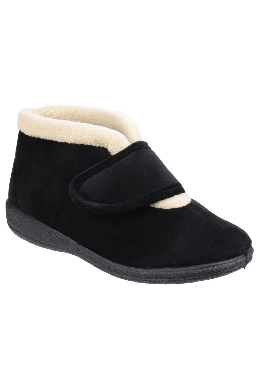 – Womens slippers.- Luxury velour upper in comfortable bootee style.- Wide v-neck opening with soft faux fur trim, warm lining and snug collar line.- Easy-close one touch fastening flexible bar strap for adjustable fit.- Memory foam footbed offers superb cushioning and molds to your feet.- Lightweight TPR sole.