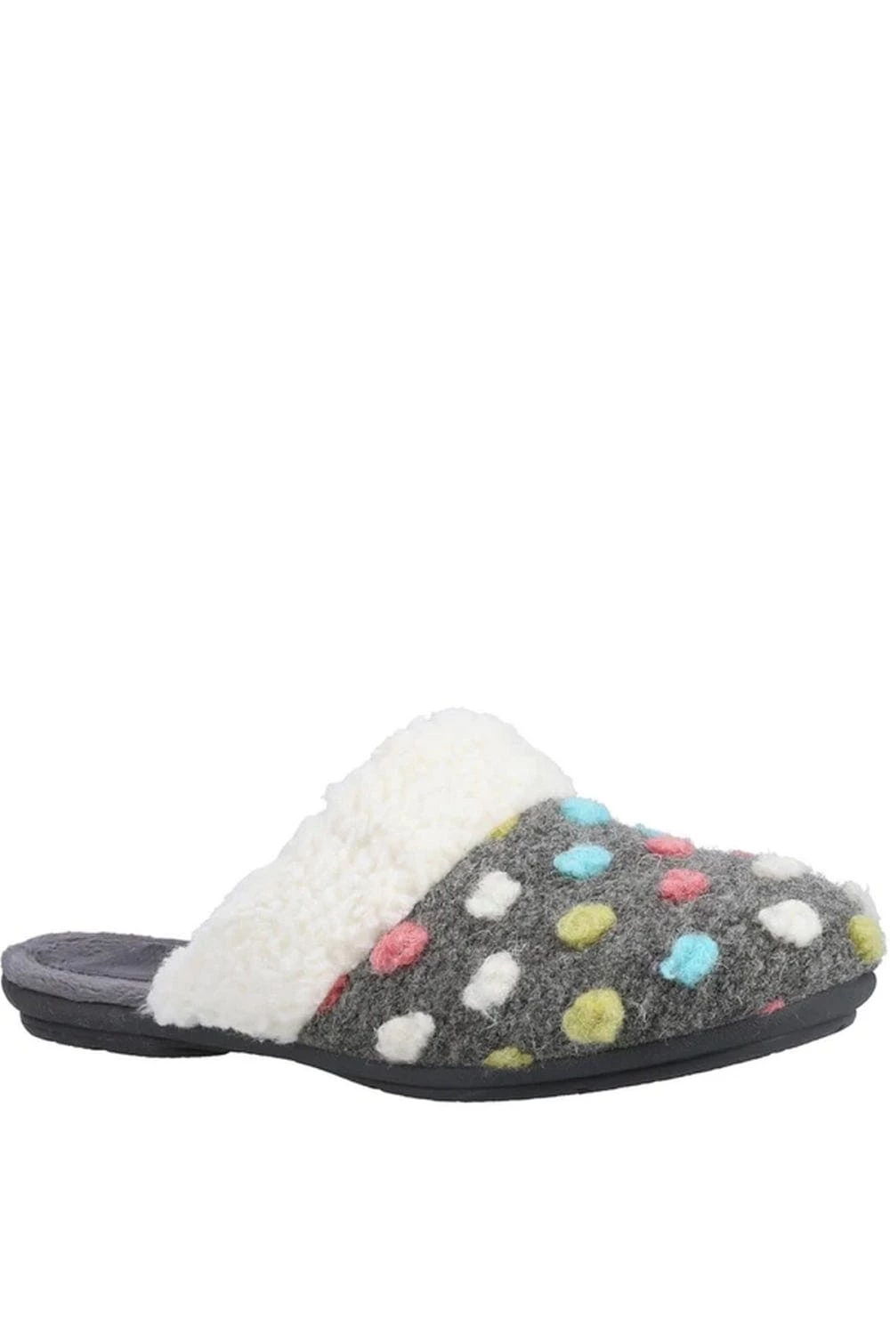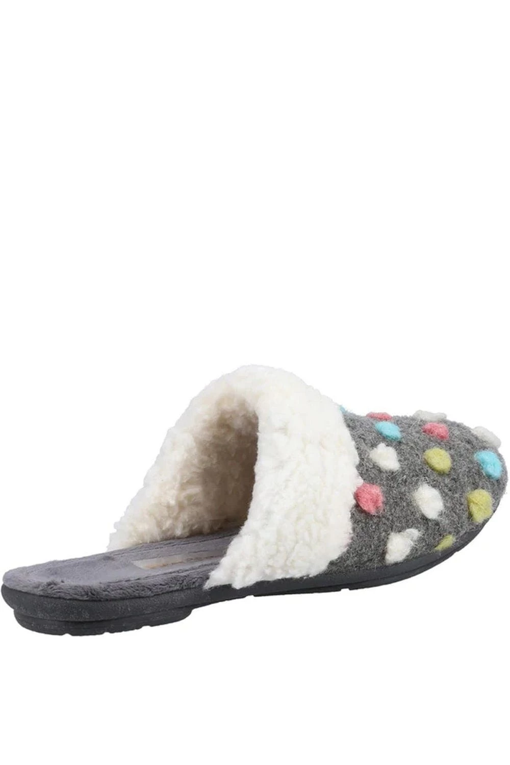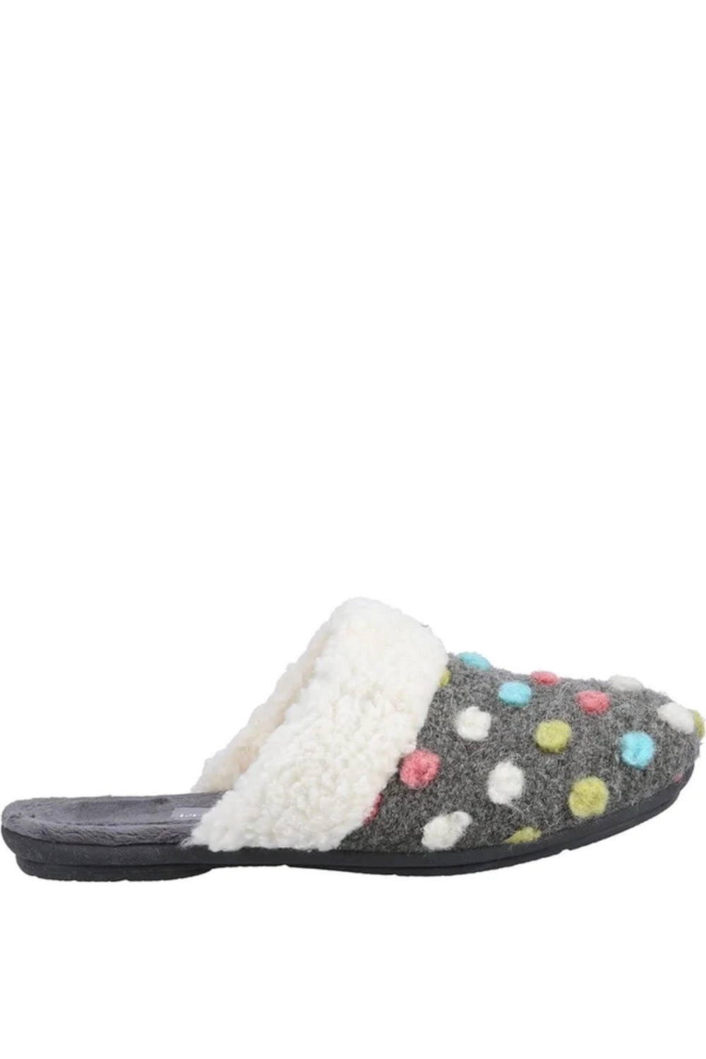 – Flat.- Design: Polka dot.- Toe style: Round.- Style: Mules.- Fastening: Slip-on.