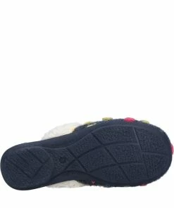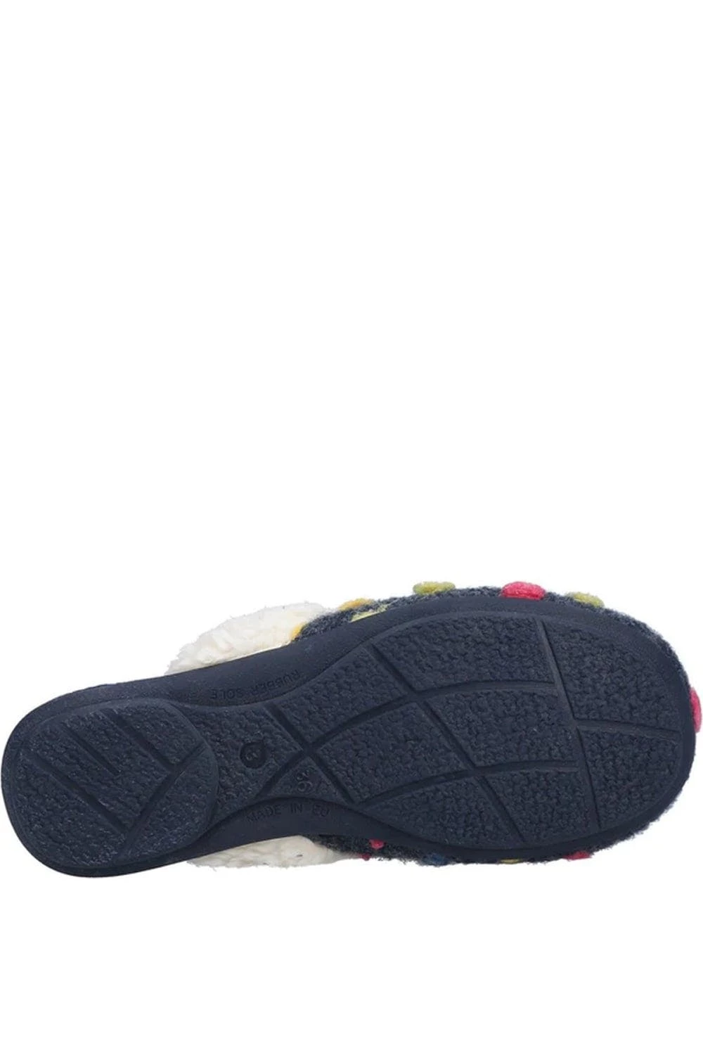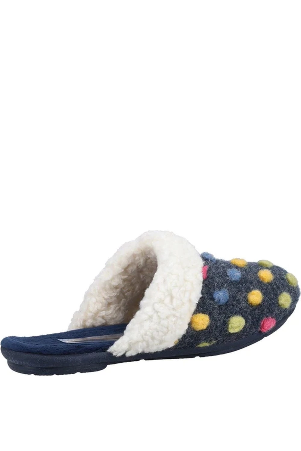 – Flat.- Design: Polka dot.- Toe style: Round.- Style: Mules.- Fastening: Slip-on.
