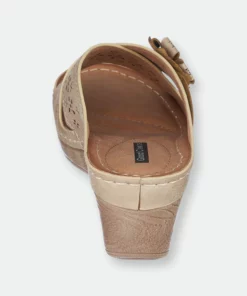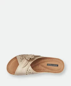 Elevate your summer style with the Dory wedge sandal from GC Shoes. This slide sandal features a beautiful floral aceent and a textured crisscross straps that are contrasted with wooden style wedge heel.