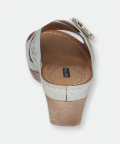 Elevate your summer style with the Dory wedge sandal from GC Shoes. This slide sandal features a beautiful floral aceent and a textured crisscross straps that are contrasted with wooden style wedge heel.