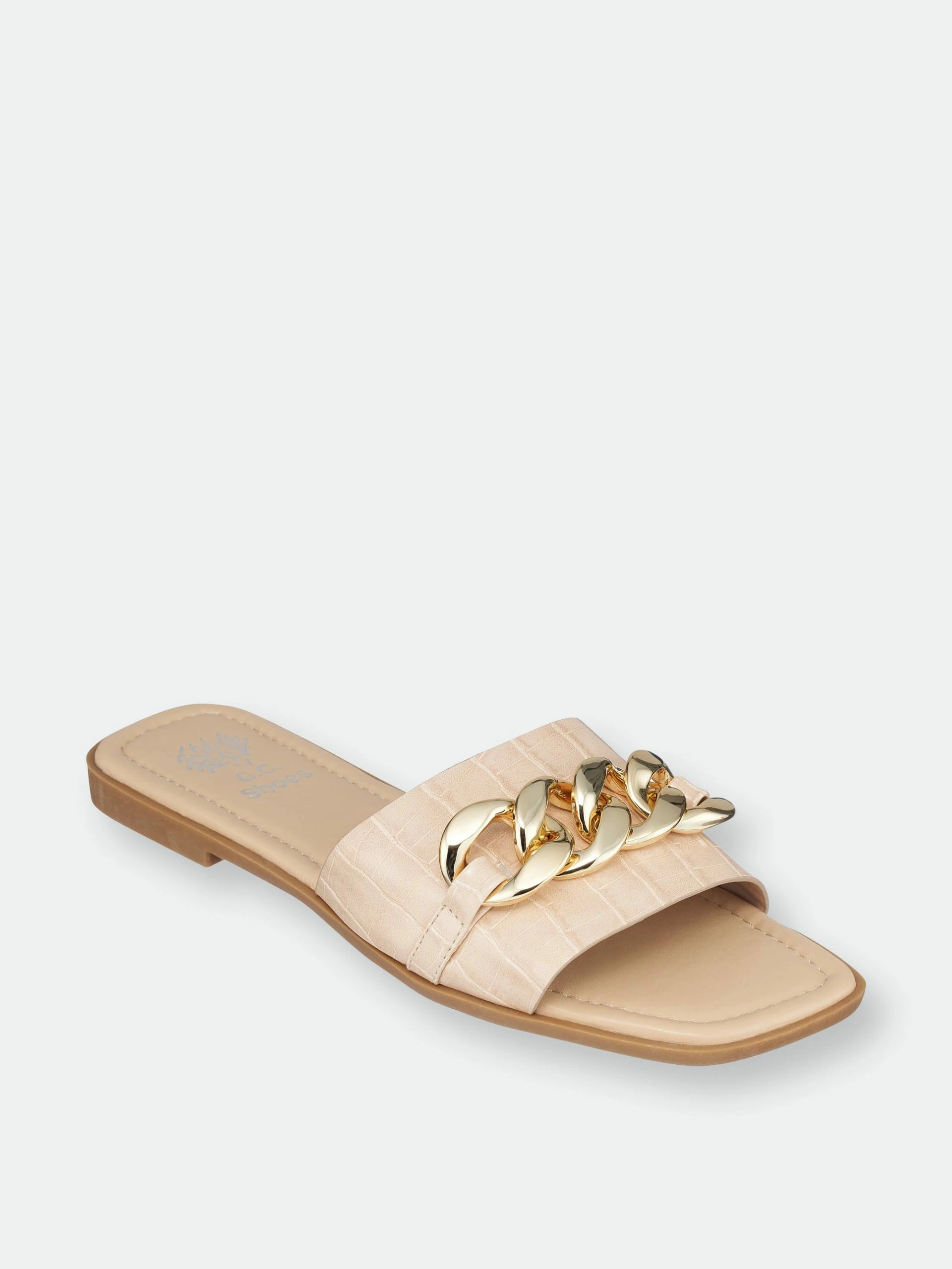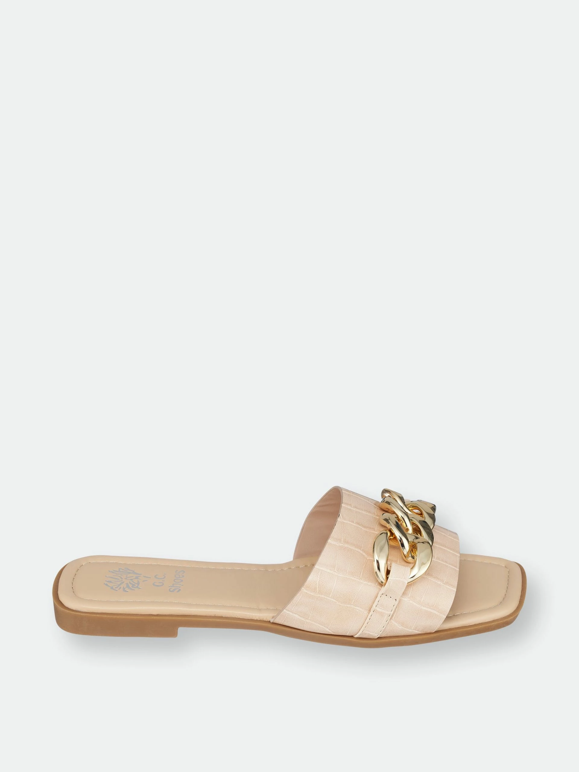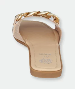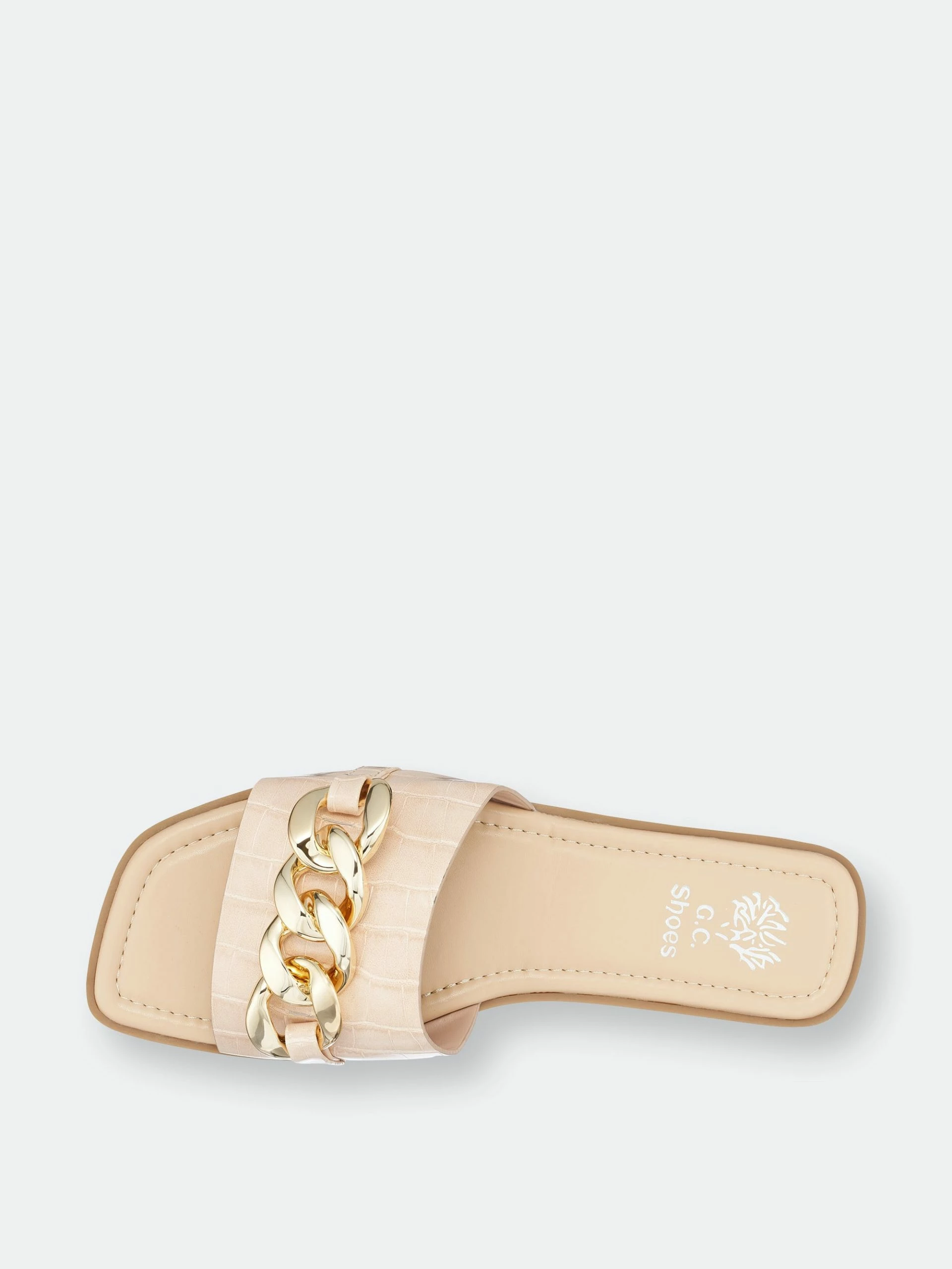 Look summer friendly in the Rina slide sandal fromGC Shoes. The one-band upper is accented with oversized gleaming chain for a glamorous touch.