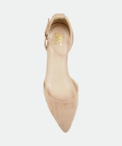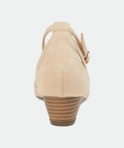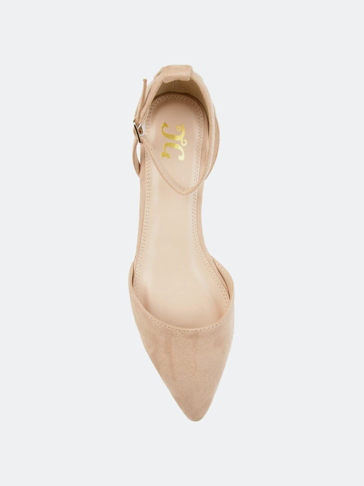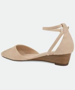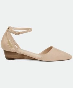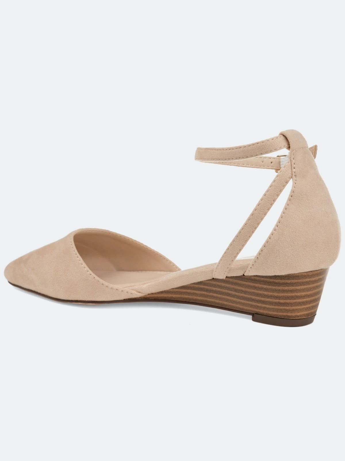 Step into a beautiful new design with the Arkie wedge by Journee Collection. This classic piece features a delicate ankle strap with detailed side cut-outs. The pointed toe finishes off the design.Heel Height:1 1/2-inchHeel Type: Sliver Wedge Platform Height:1/2-inchShoe Width: MediumClosure Type: BuckleStrap Type: AnkleToe Style: PointedLining: Faux LeatherUpper Material: Faux SuedeOutersole Material: Man-madeFootbed: PaddedAll measurements are approximate and were taken using a size 6. Please note measurements may vary slightly by size.