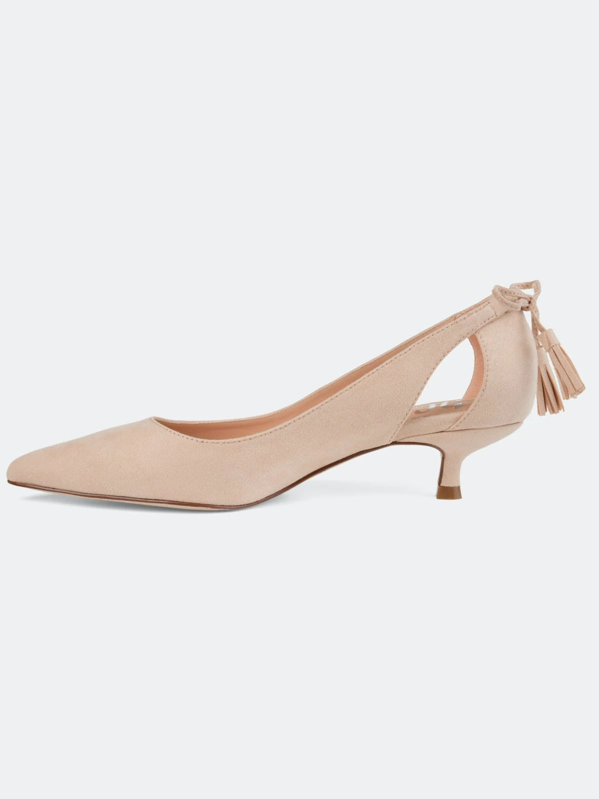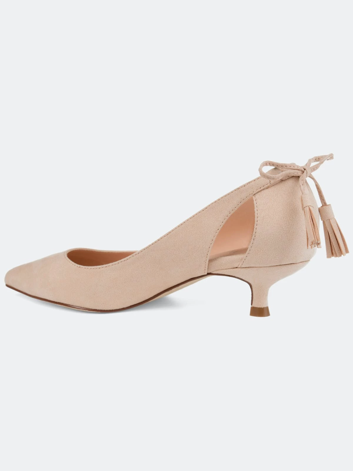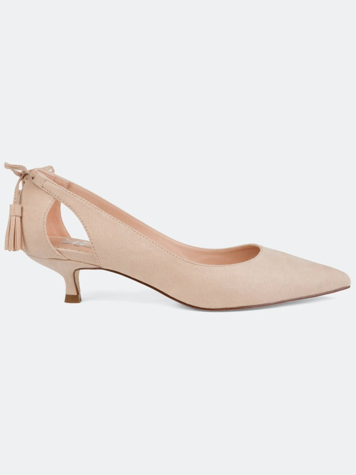Pointed toe perfection comes with the Bindi heel by Journee Collection. This classic kitten heel features a sleek pointed toe with side cut-outs, and a fringe bow design. Unique and class combine to make this fabulous heel.Heel Height:1 1/2-inchHeel Type: Kitten Heel Platform Height:1/2-inchShoe Width: MediumClosure Type: Slip-onStrap Type: Ankle CuffToe Style: PointedLining: Faux LeatherUpper Material: Faux SuedeOutersole Material: Faux Suede over SyntheticFootbed: PaddedAll measurements are approximate and were taken using a size 6. Please note measurements may vary slightly by size.