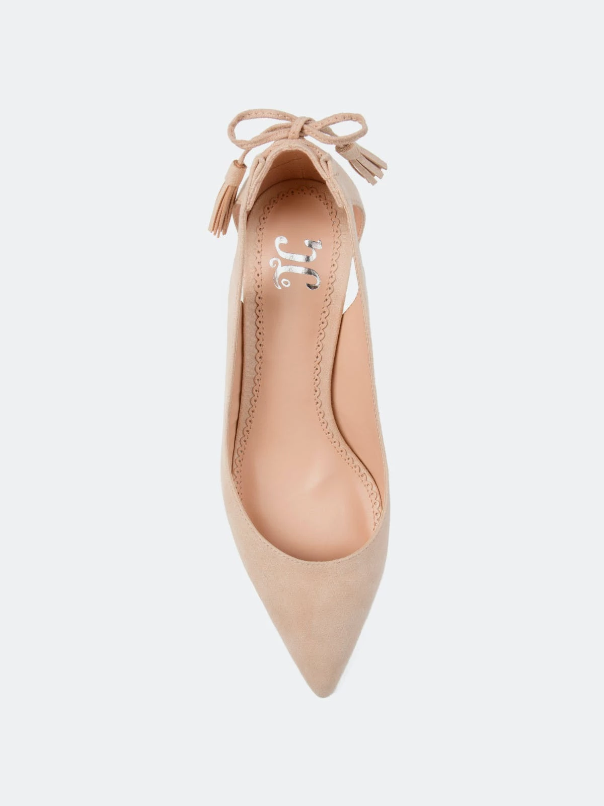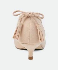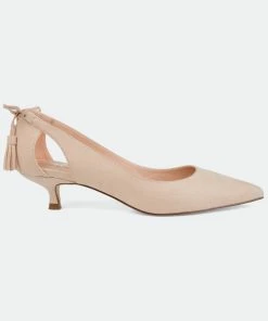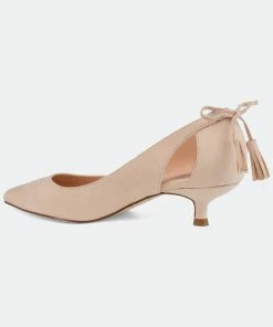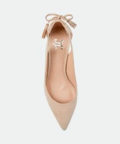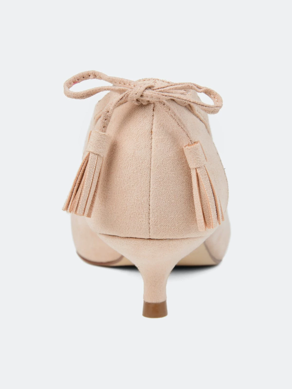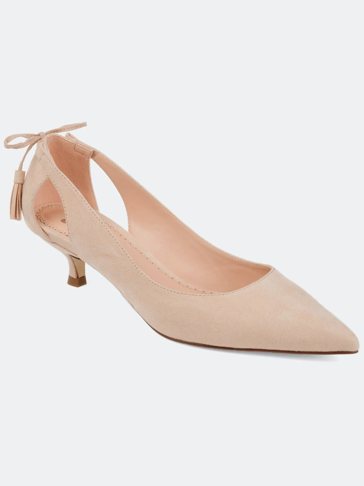 Pointed toe perfection comes with the Bindi heel by Journee Collection. This classic kitten heel features a sleek pointed toe with side cut-outs, and a fringe bow design. Unique and class combine to make this fabulous heel.Heel Height:1 1/2-inchHeel Type: Kitten Heel Platform Height:1/2-inchShoe Width: MediumClosure Type: Slip-onStrap Type: Ankle CuffToe Style: PointedLining: Faux LeatherUpper Material: Faux SuedeOutersole Material: Faux Suede over SyntheticFootbed: PaddedAll measurements are approximate and were taken using a size 6. Please note measurements may vary slightly by size.