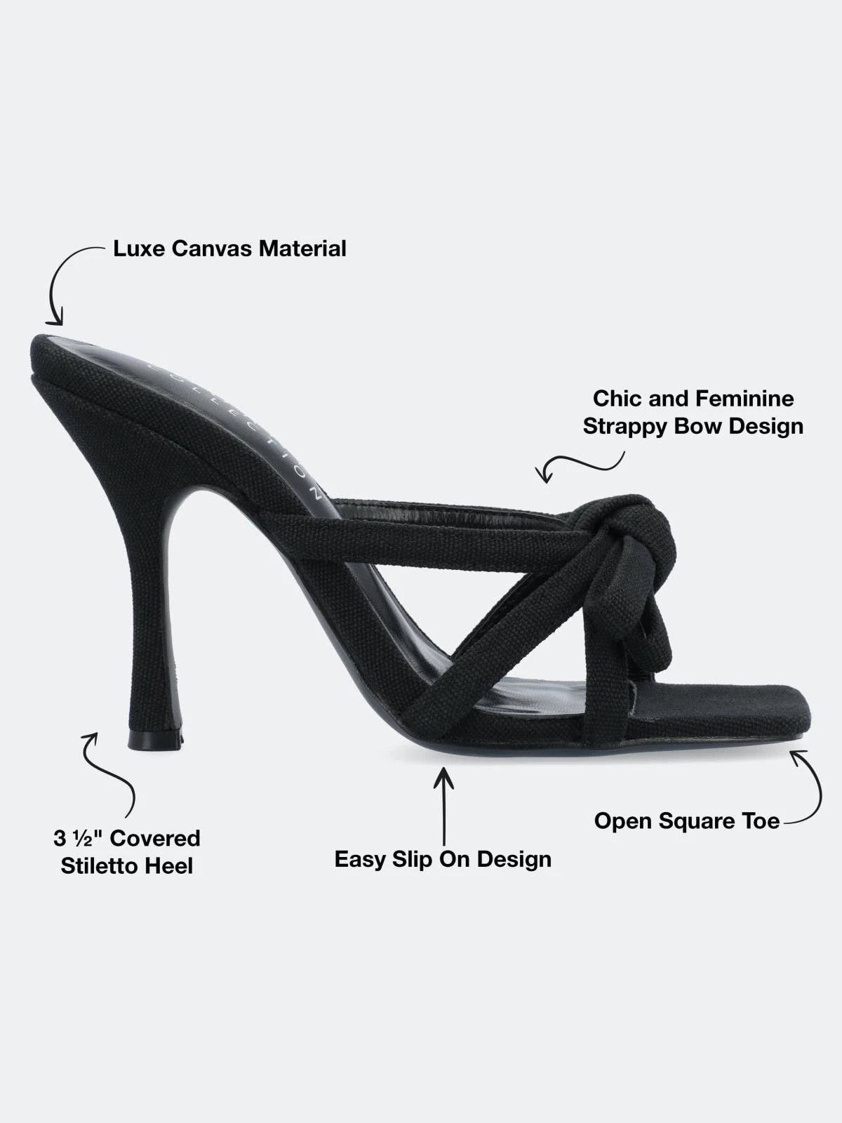 The Cilicia stiletto heels from Journee Collection are certain to bring on the compliments. The canvas material, padded footbed, multi-strap bow detail, and open square toe will make for the perfect style combination to leave these shoes taking you anywhere you want to go. The slip-on closure will make them an easy heel to slip off on busy days.