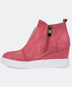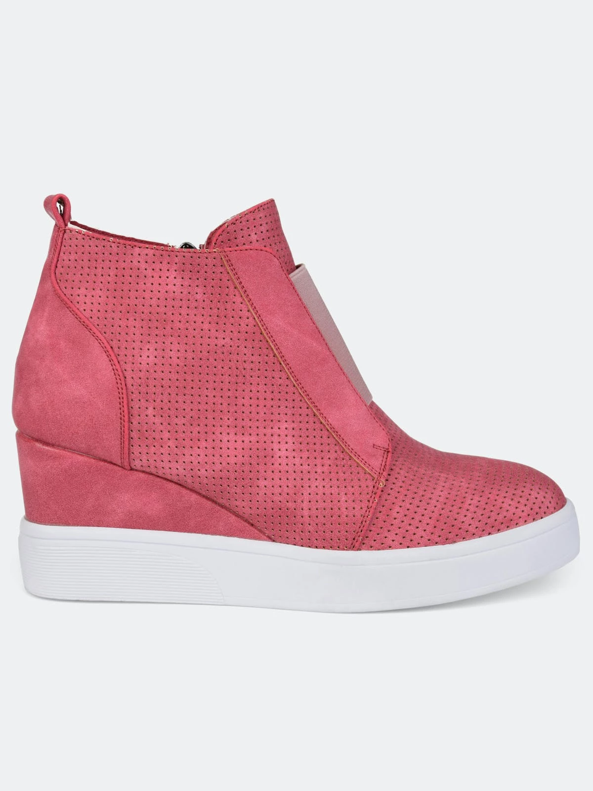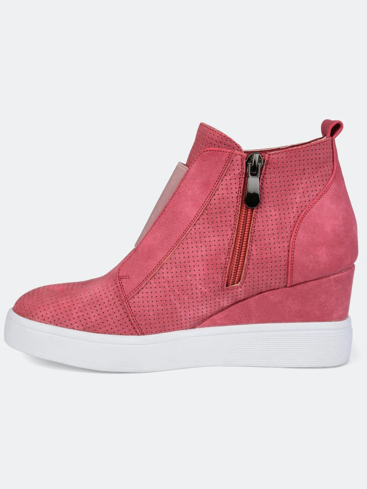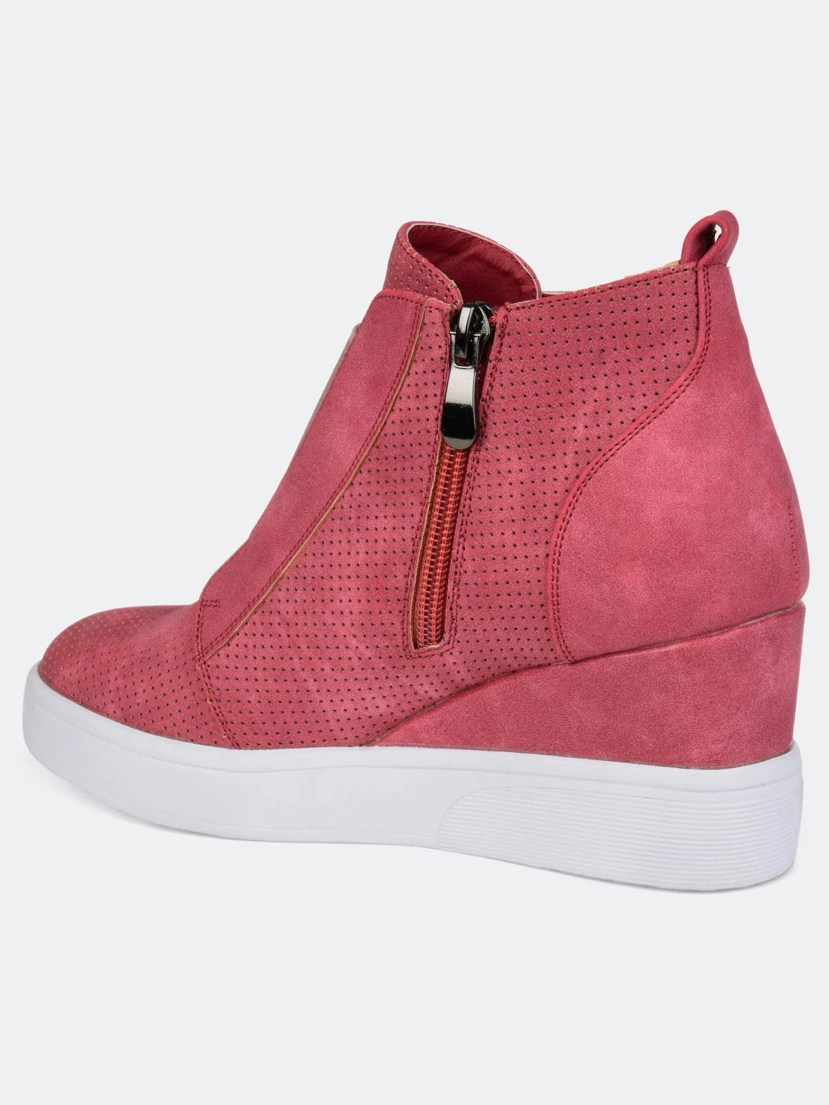 Look effortlessly cool in fashion sneakers from Journee Collection. Soft faux leather uppers display cut-out detail for a pinhole textured appearance, and a zipper entry at the sides of the foot. Thick outsoles and wedge heels finish the look.