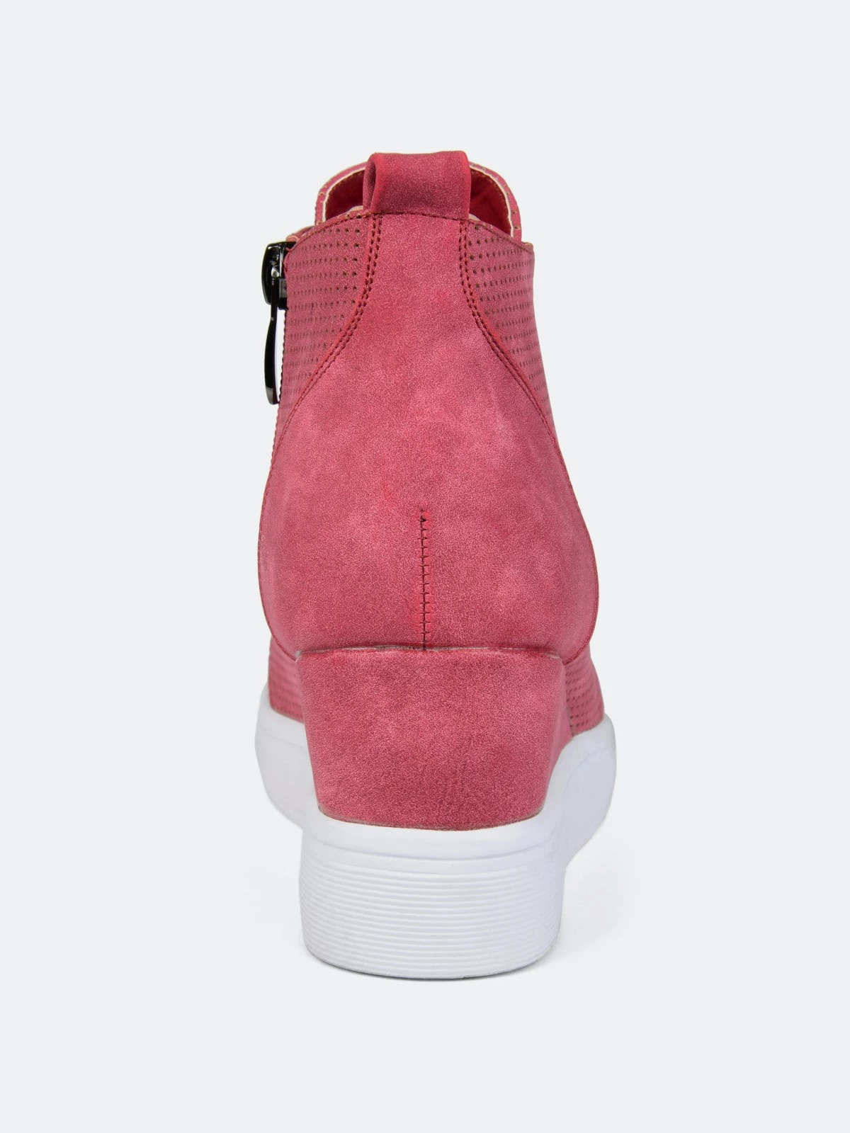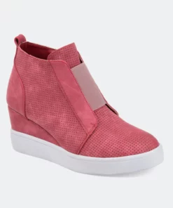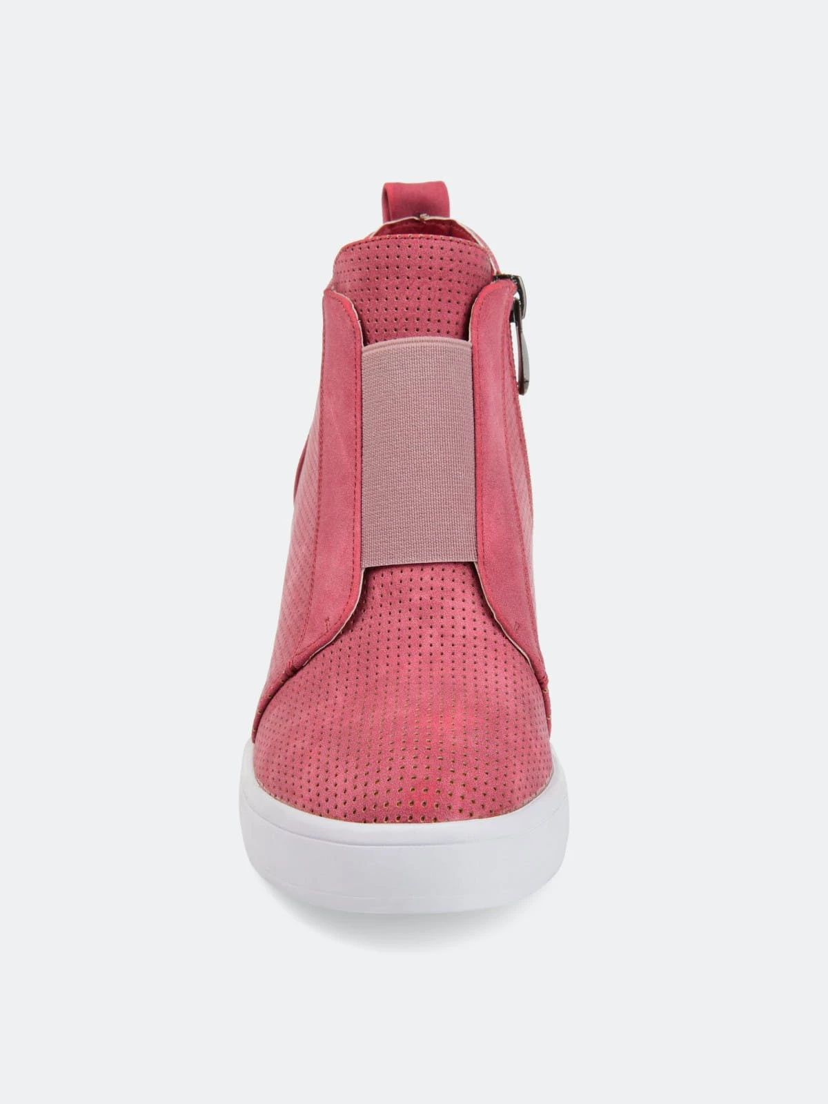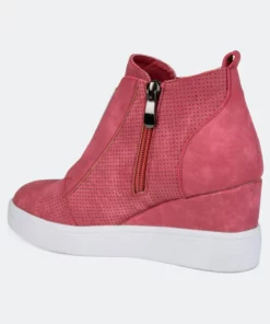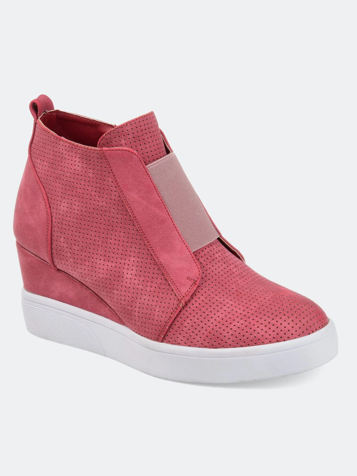 Look effortlessly cool in fashion sneakers from Journee Collection. Soft faux leather uppers display cut-out detail for a pinhole textured appearance, and a zipper entry at the sides of the foot. Thick outsoles and wedge heels finish the look.